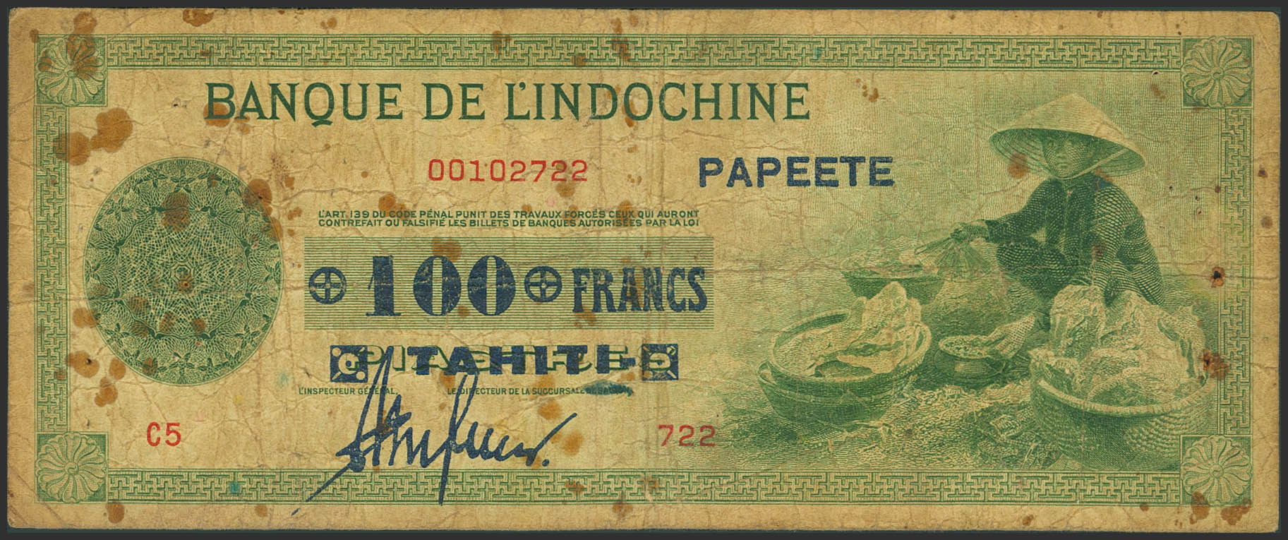 TAHITI. 100 Francs. (1943ca). Banque de L´Indochine, papeete. (Pick: 17b). Fine, several pinholes.