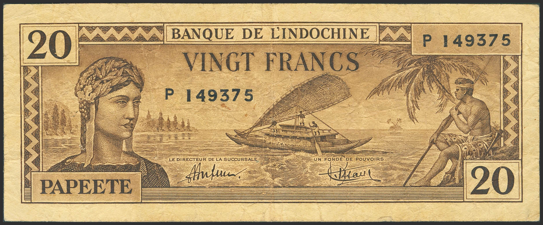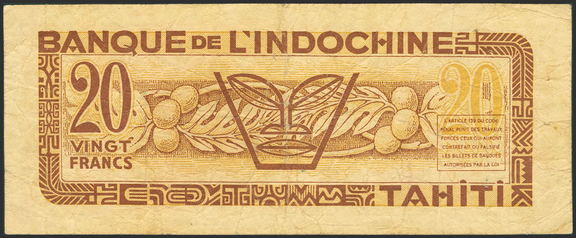 TAHITI. 20 Francs. (1944ca). Banque de L´Indochine, papeete. (Pick: 20a). Fine, pinholes.