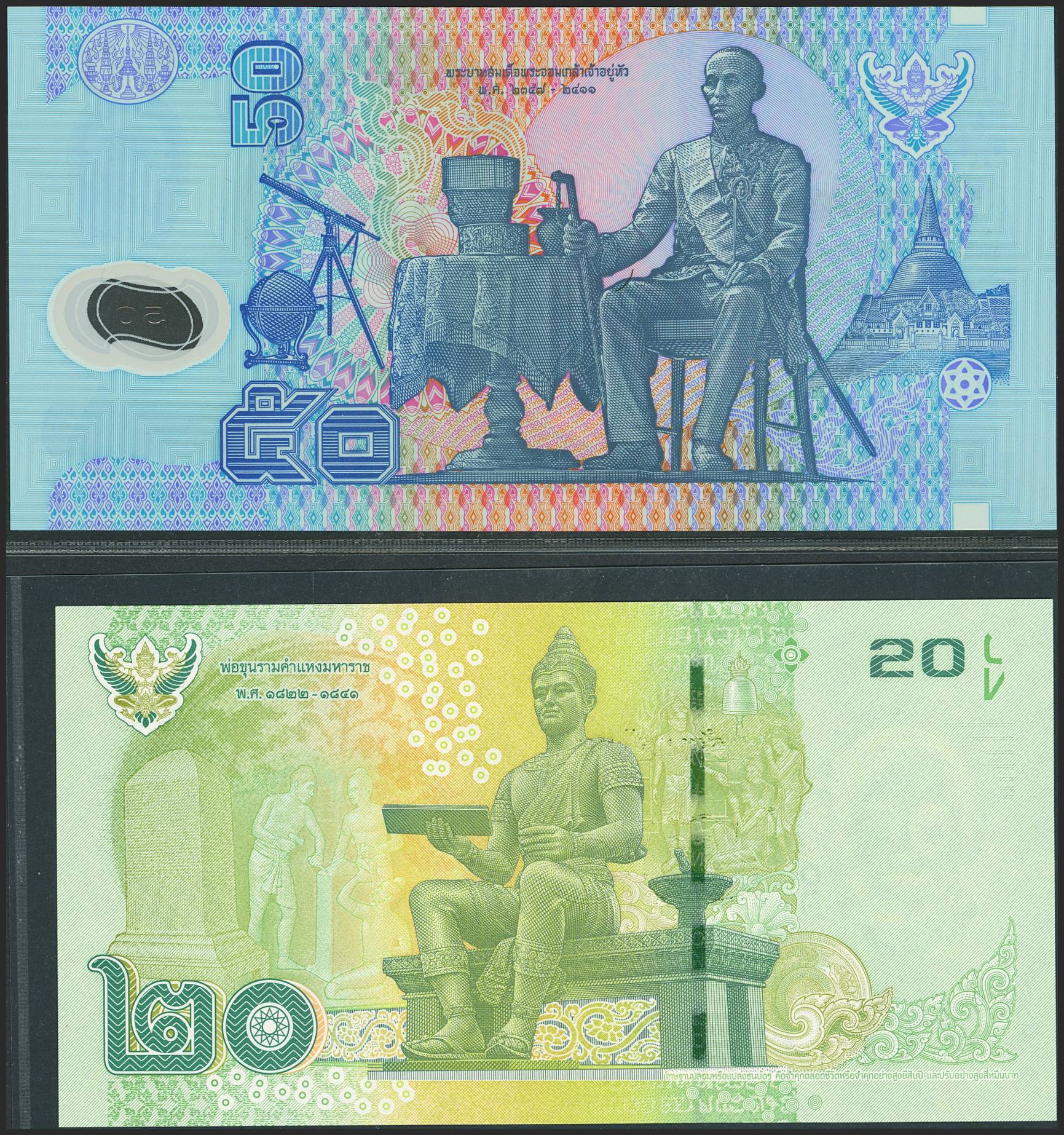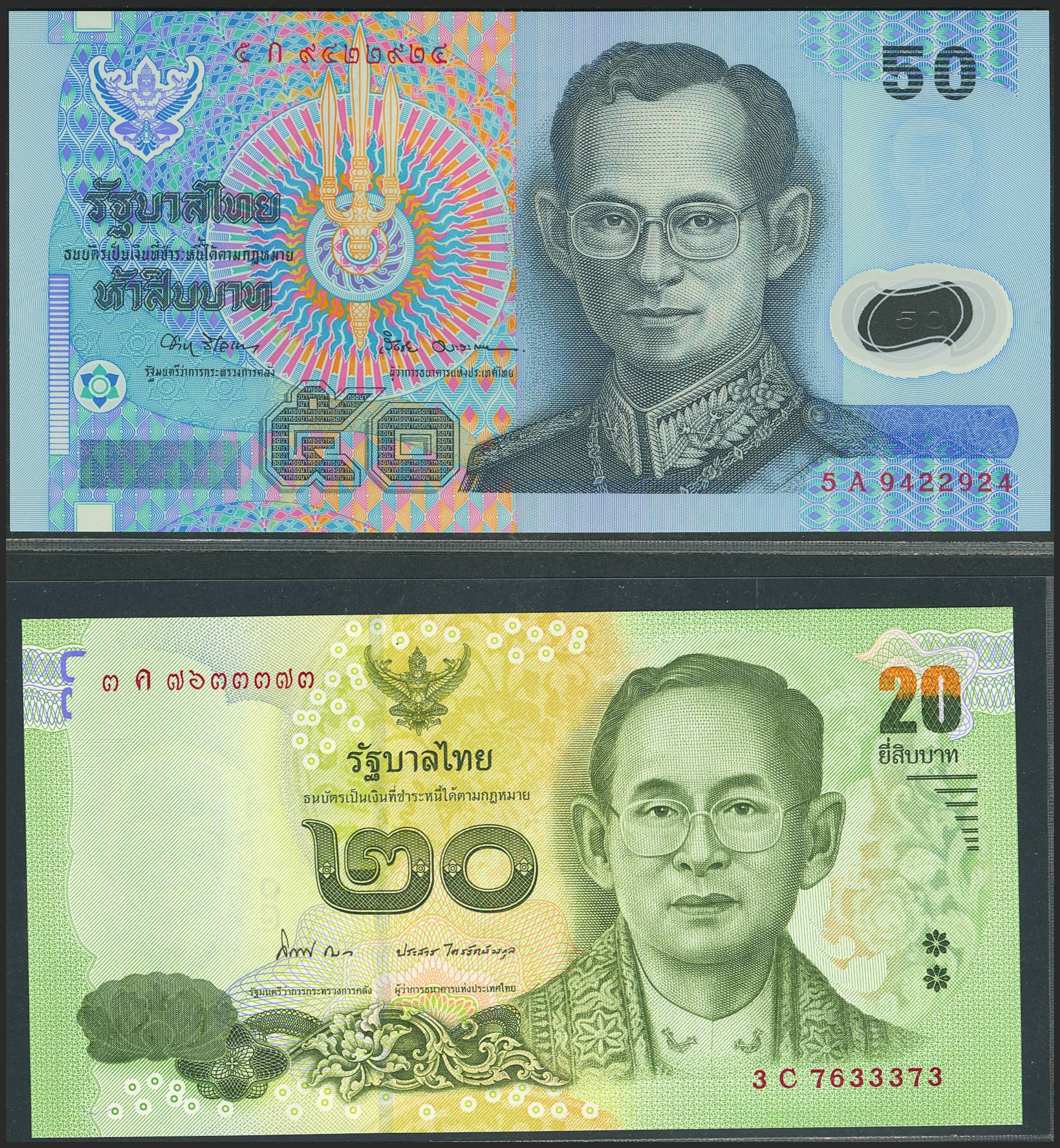 THAILAND. Lot of 2 notes of 20 and 50 Baht. 1997, (2013ca). Government. (Pick: 102a, 118). Uncirculated.