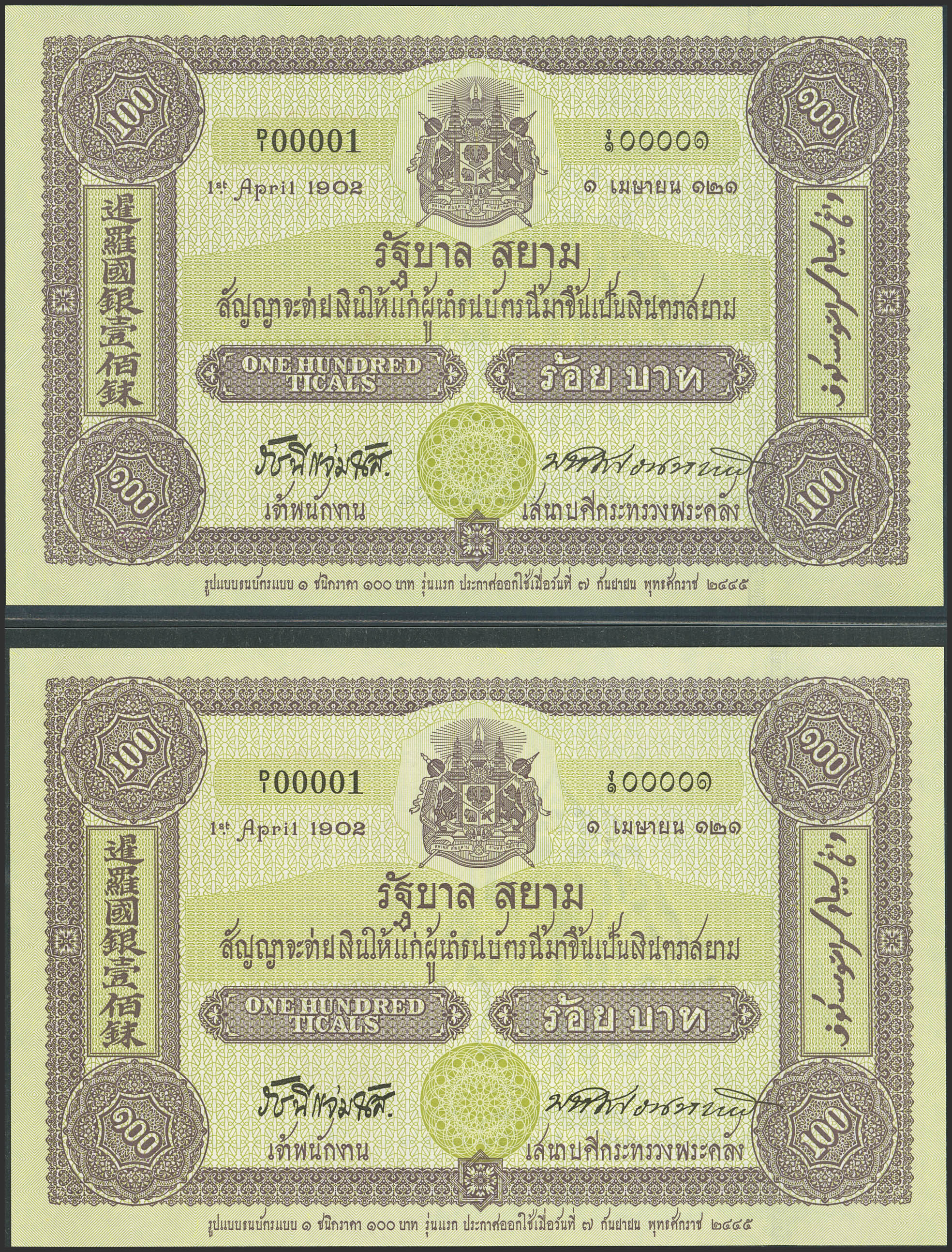 THAILAND. Lot of 2 notes of 100 Baht. 2002. Government. Centennial of Issue of Thai Banknotes. (Pick: 110). Uncirculated.