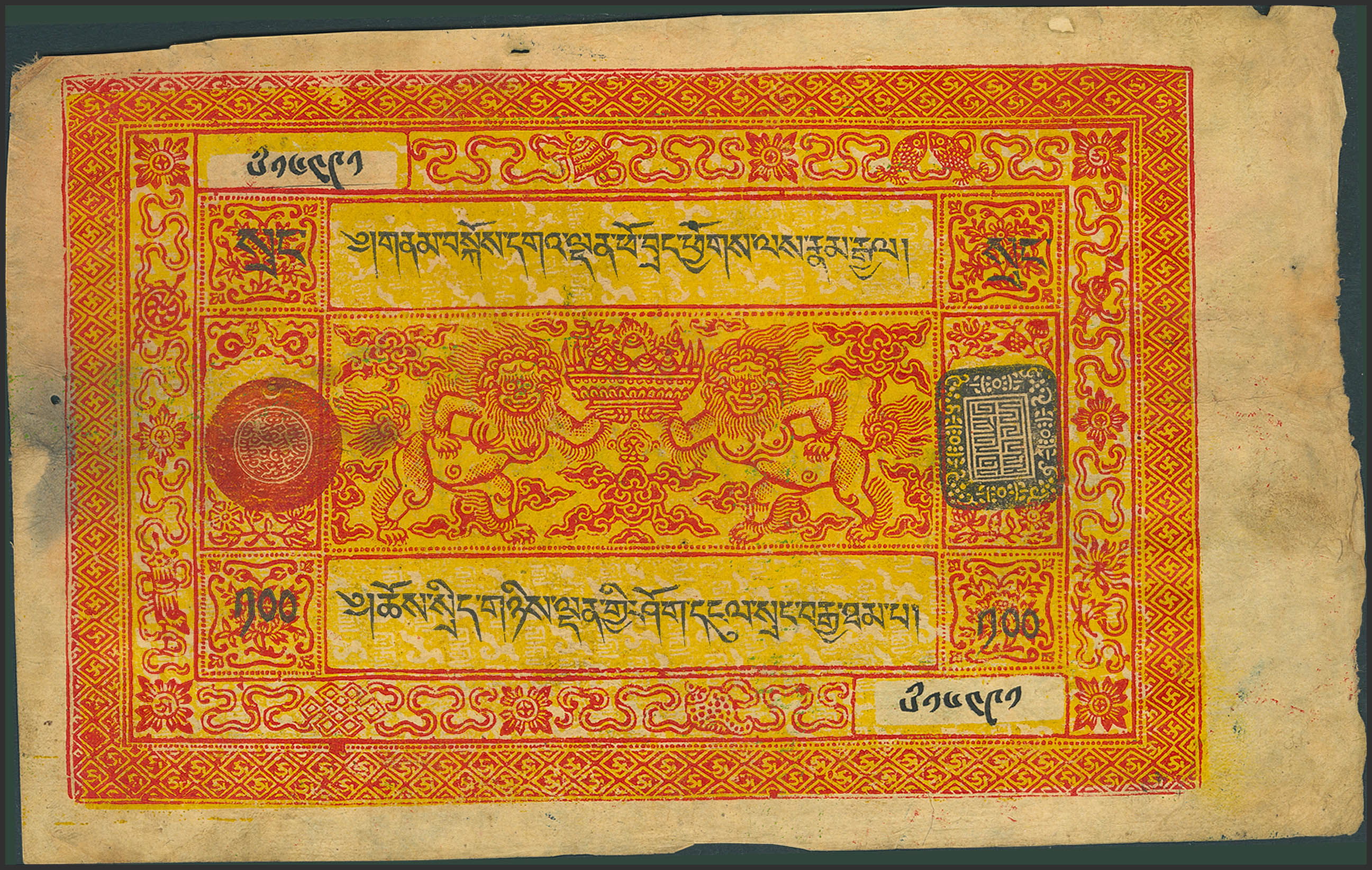 TIBET. 100 Srang. (1942ca). Government. (Pick: 11b). More than Very Fine, adhesive paper added over hole.