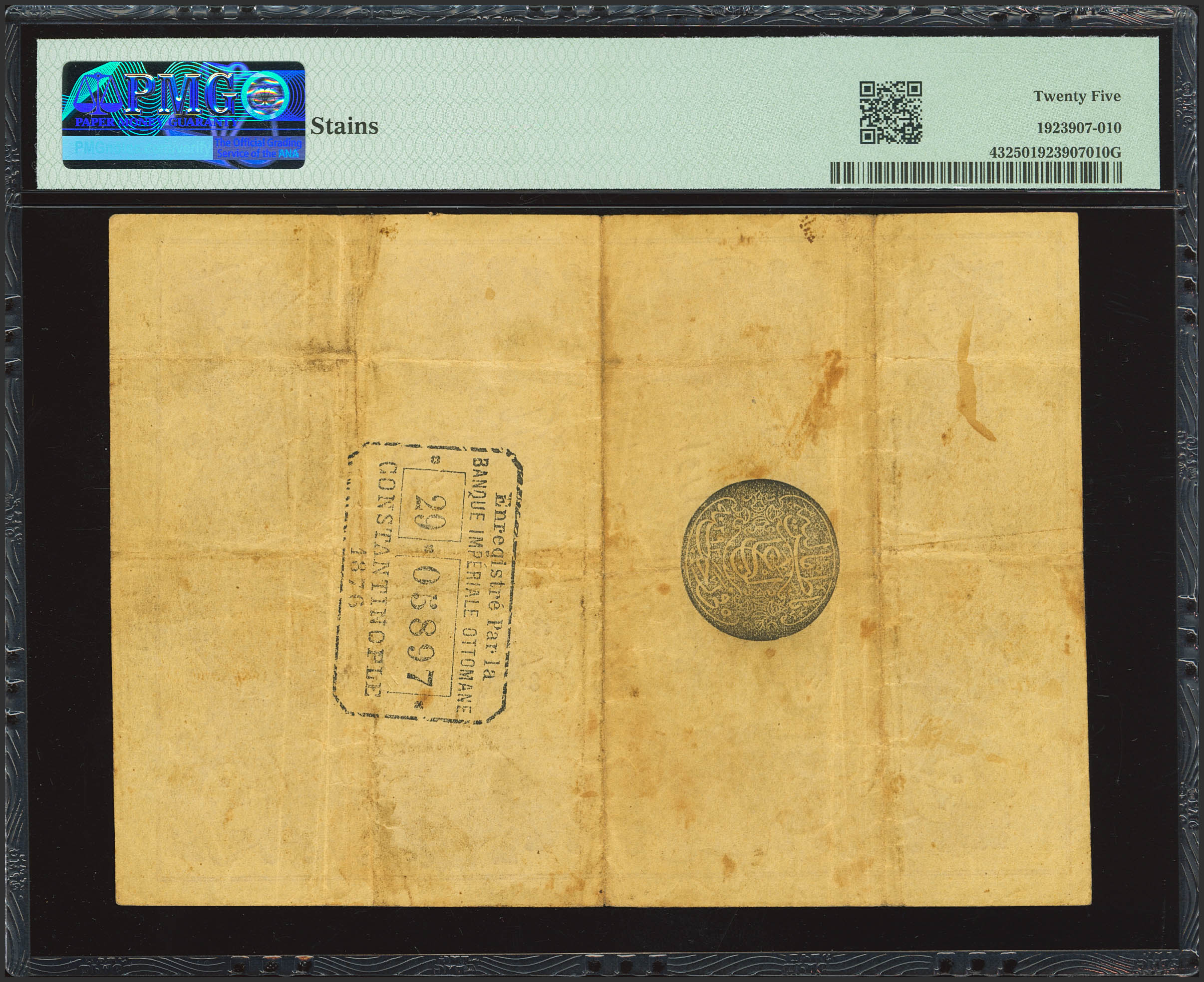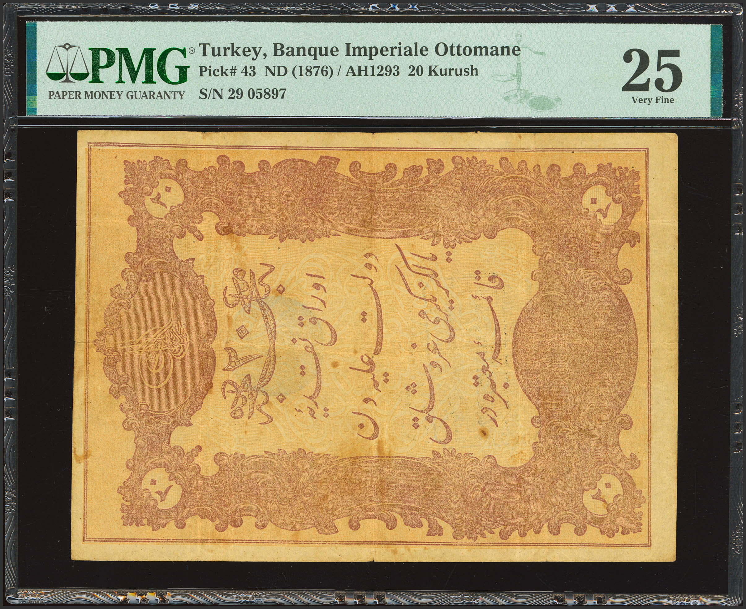 TURKEY. 20 Kurus. 1876. Banque Imperiale Ottomane. Toughra of Murad V on front and Seal of Galip on Back. (Pick: 43). PMG25 (stains).