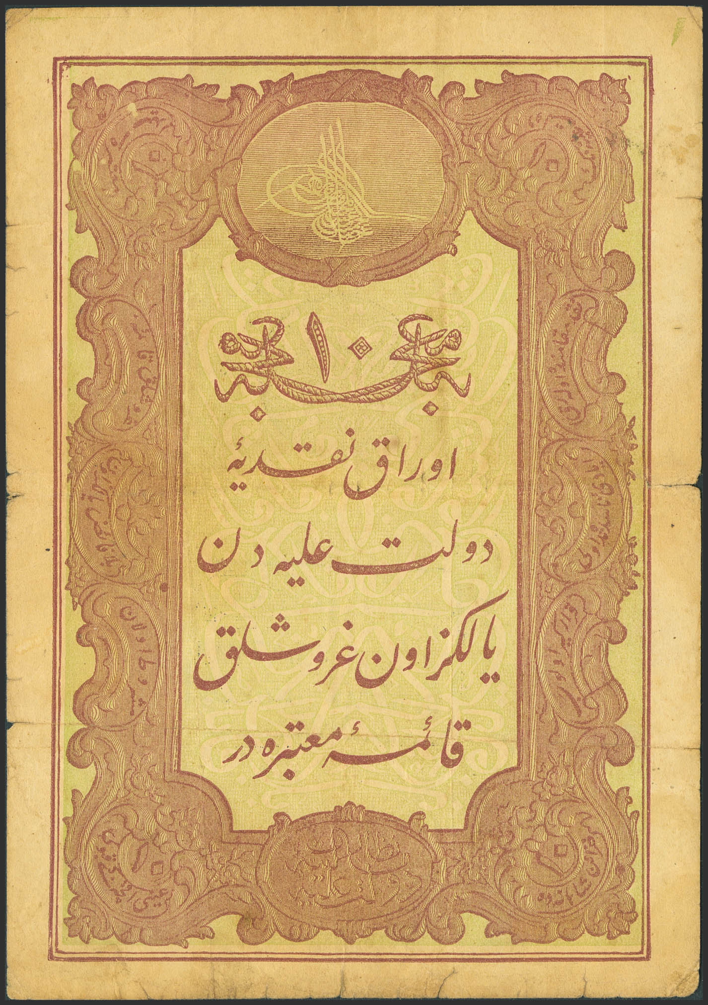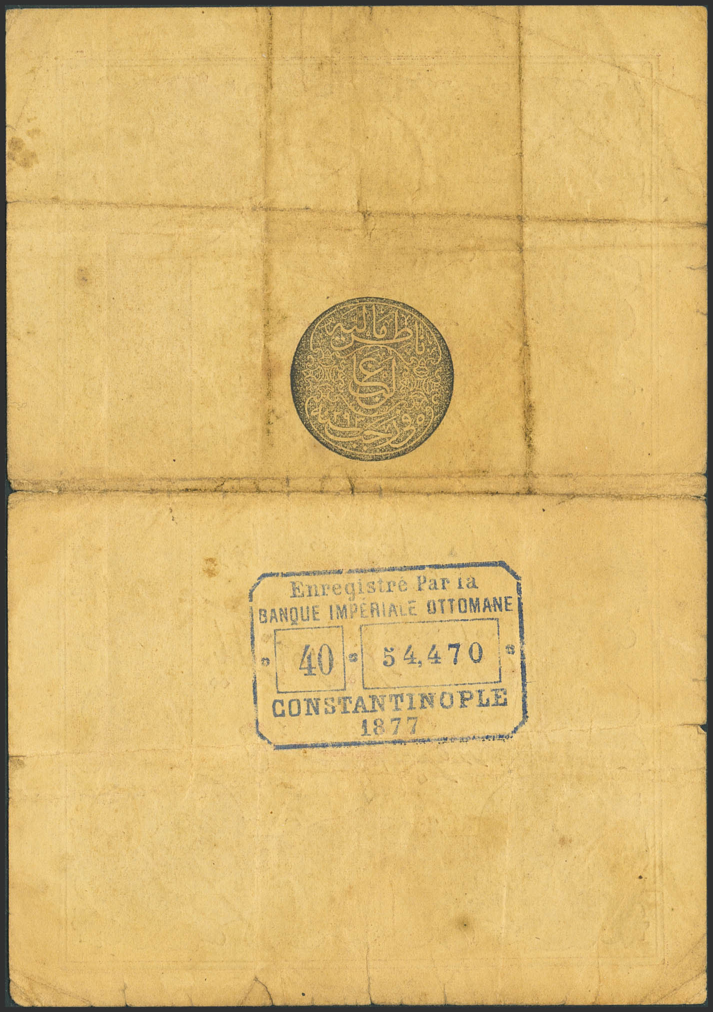 TURKEY. 10 Kurus. 1877. Banque Imperiale Ottomane. Toughra of Abdul Hamid II on front and Seal of Galip on back. (Pick: 48a). Very Fine.