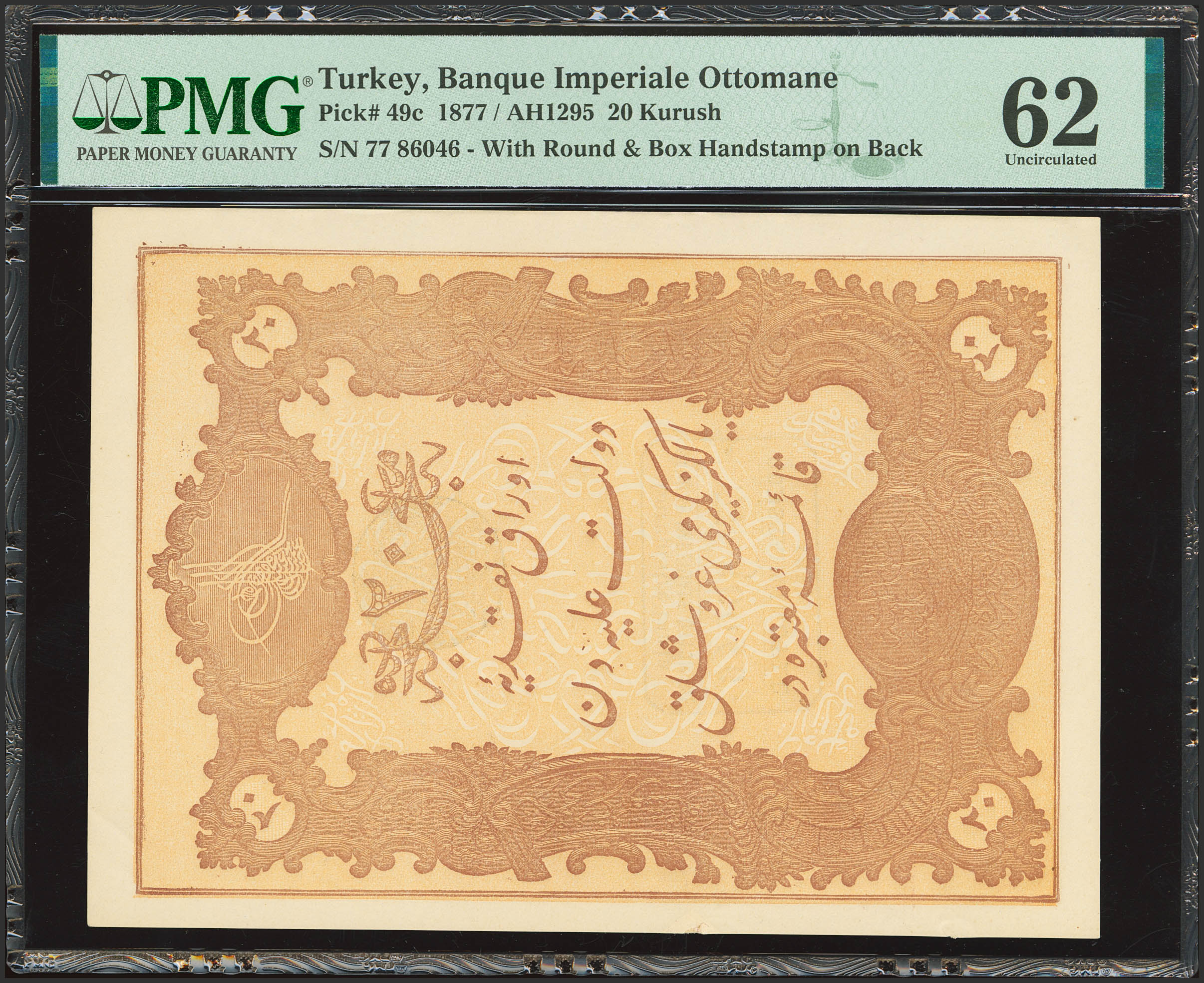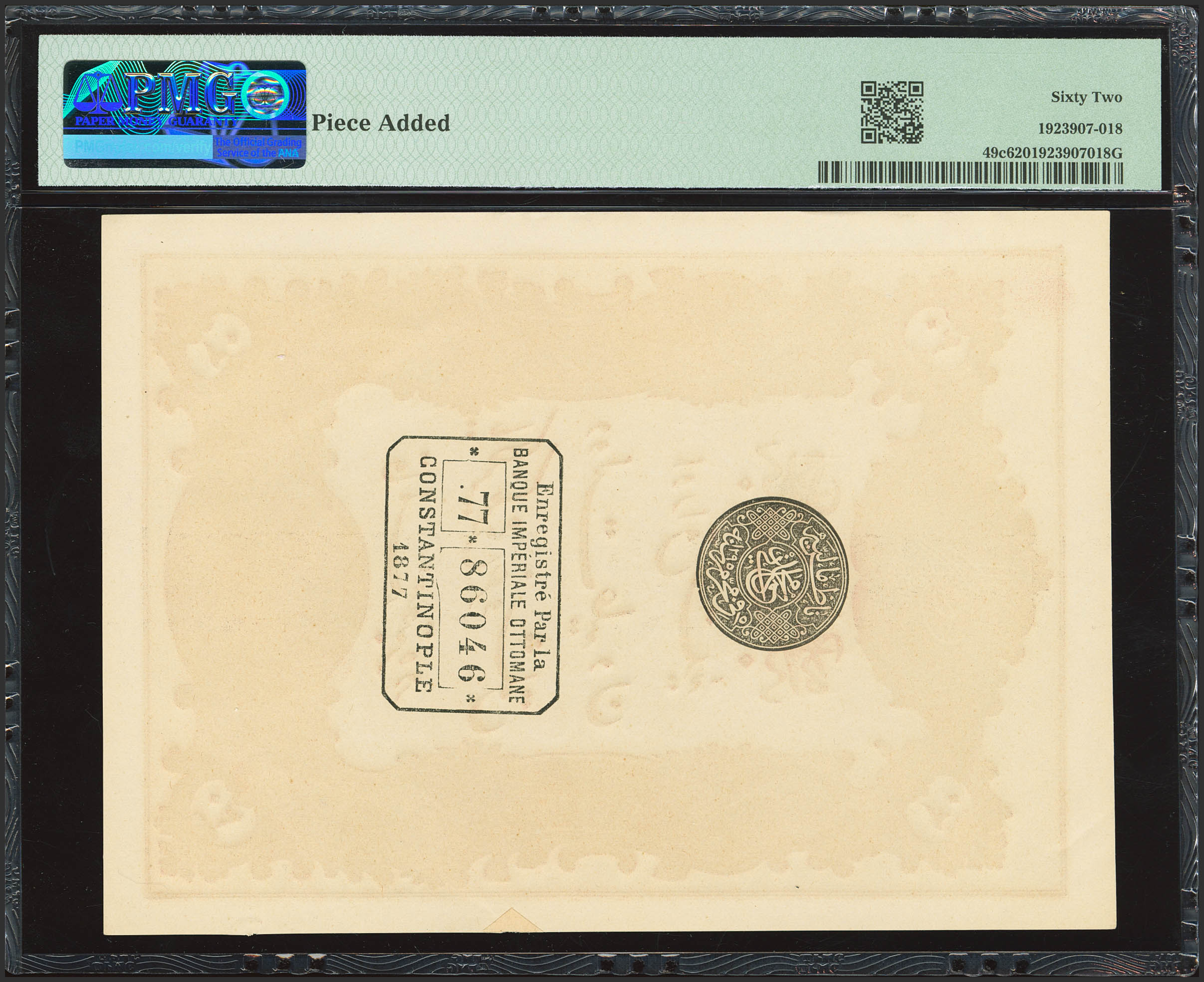 TURKEY. 20 Kurus. 1877. Banque Imperiale Ottomane. Toughra of Abdul Hamid II on front and Seal of Mehmed Kani on back. (Pick: 49c). PMG62 (piece added).