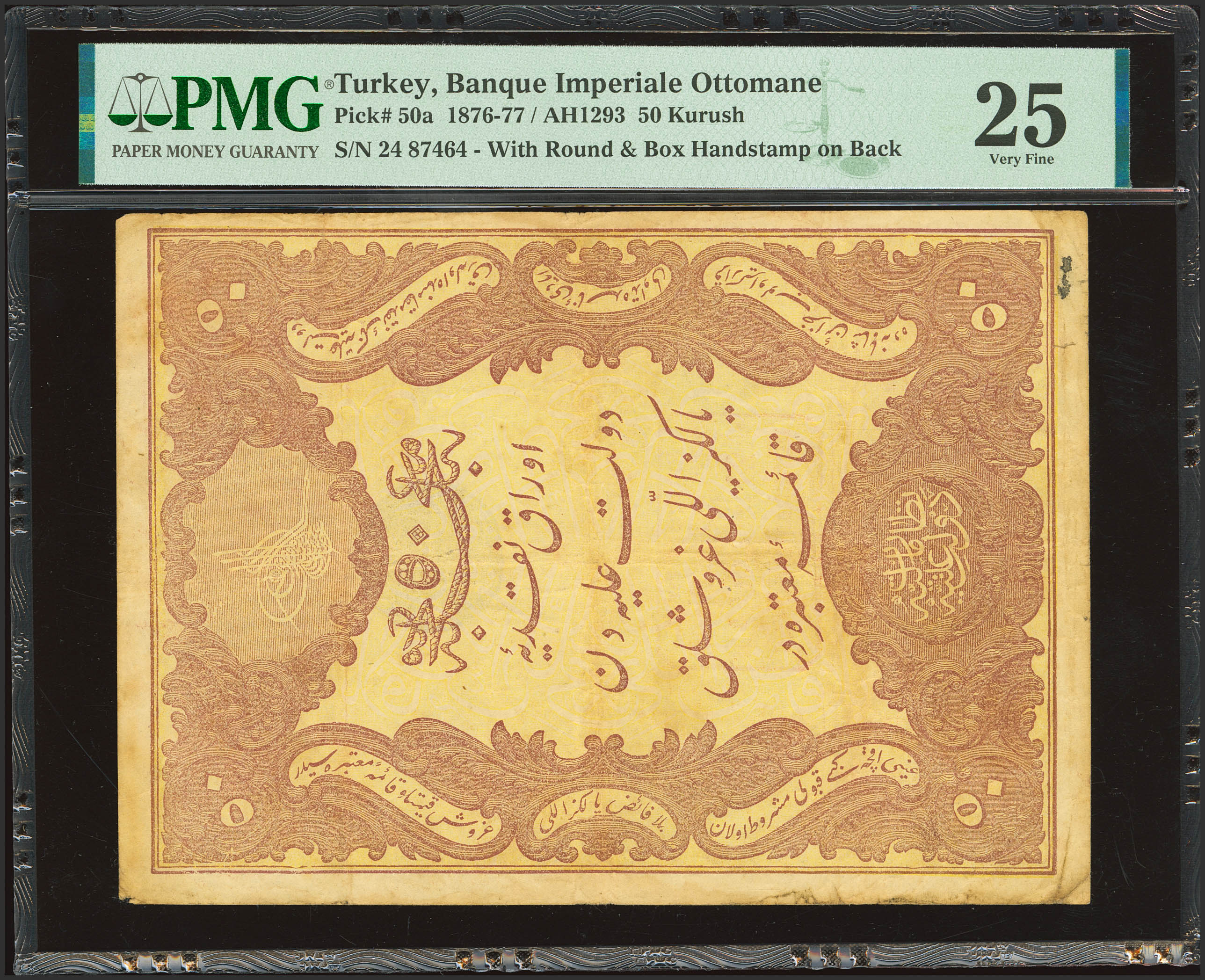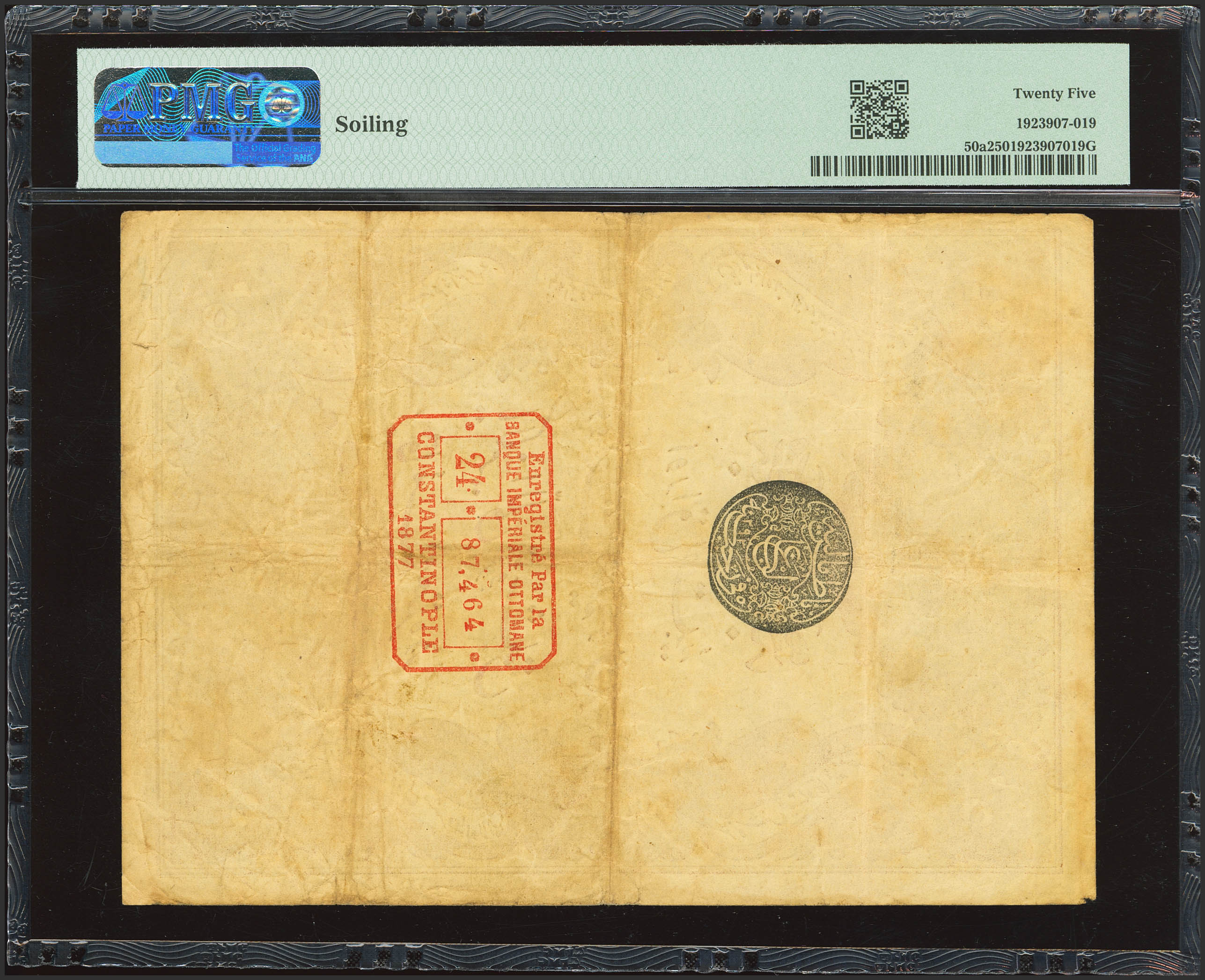 TURKEY. 50 Kurus. 1877. Banque Imperiale Ottomane. Toughra of Abdul Hamid II on front and Seal of Galip on back. (Pick: 50a). PMG25 (stains).