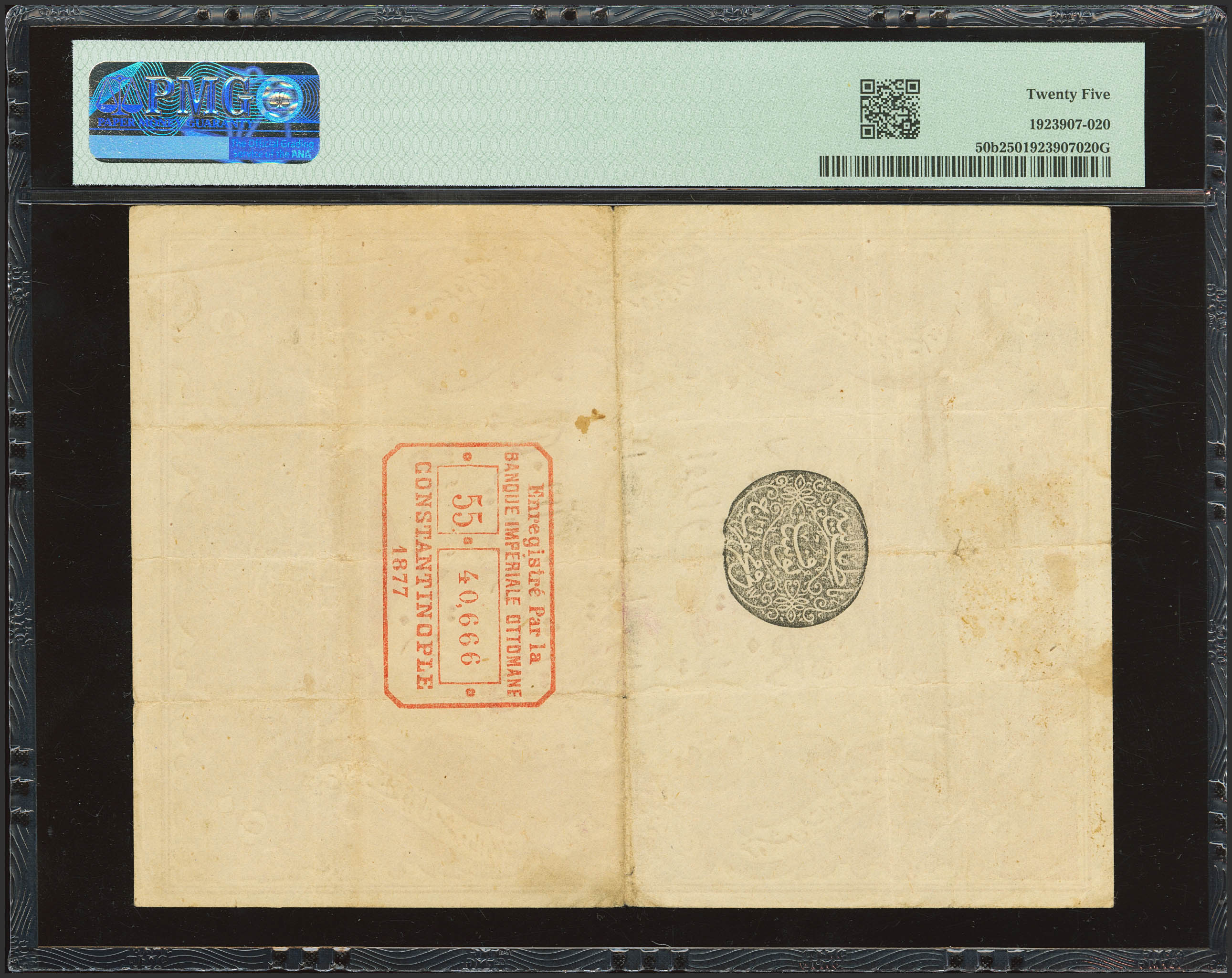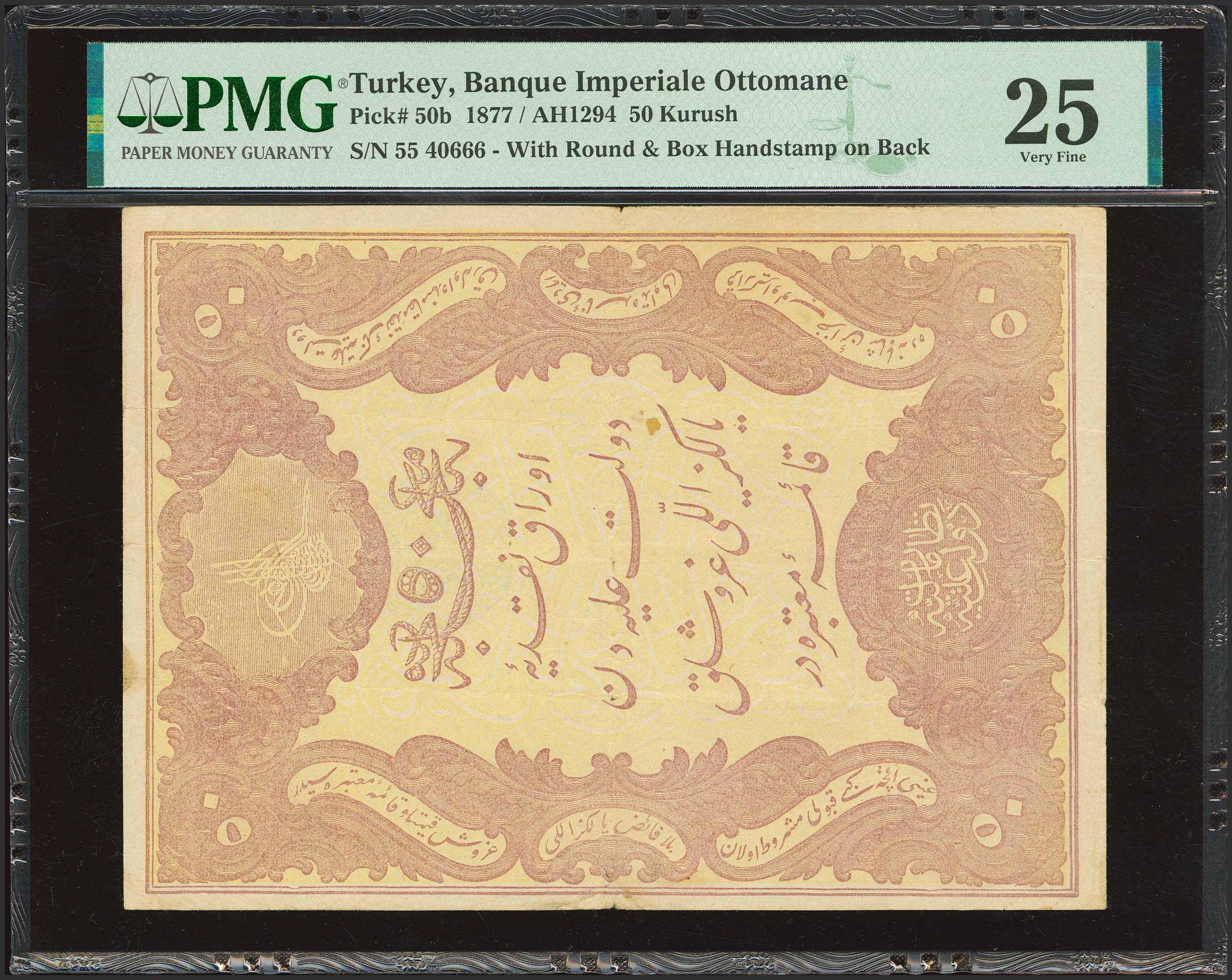 TURKEY. 50 Kurus. 1877. Banque Imperiale Ottomane. Toughra of Abdul Hamid II on front and Seal of Yusef on back. (Pick: 50b). PMG25.