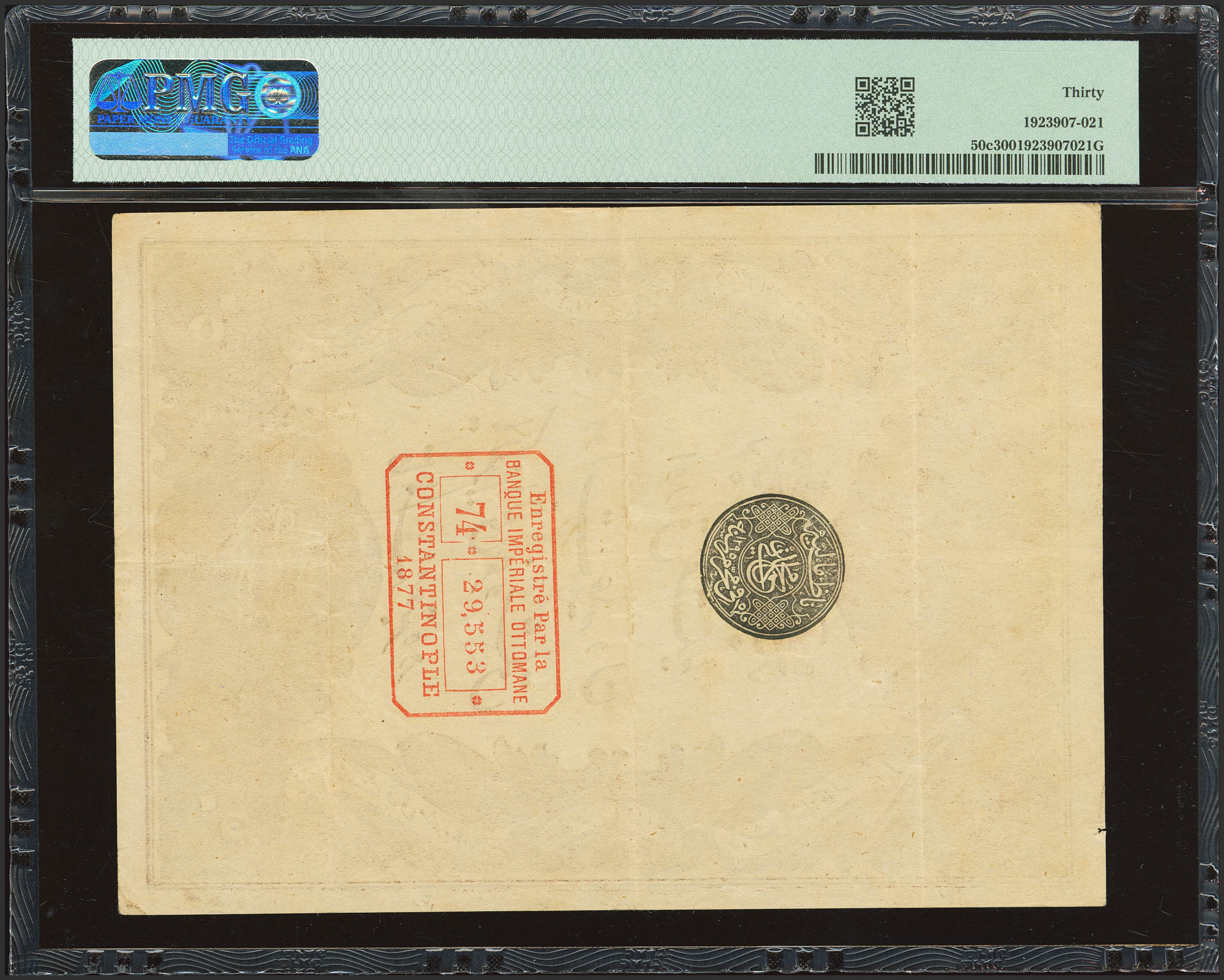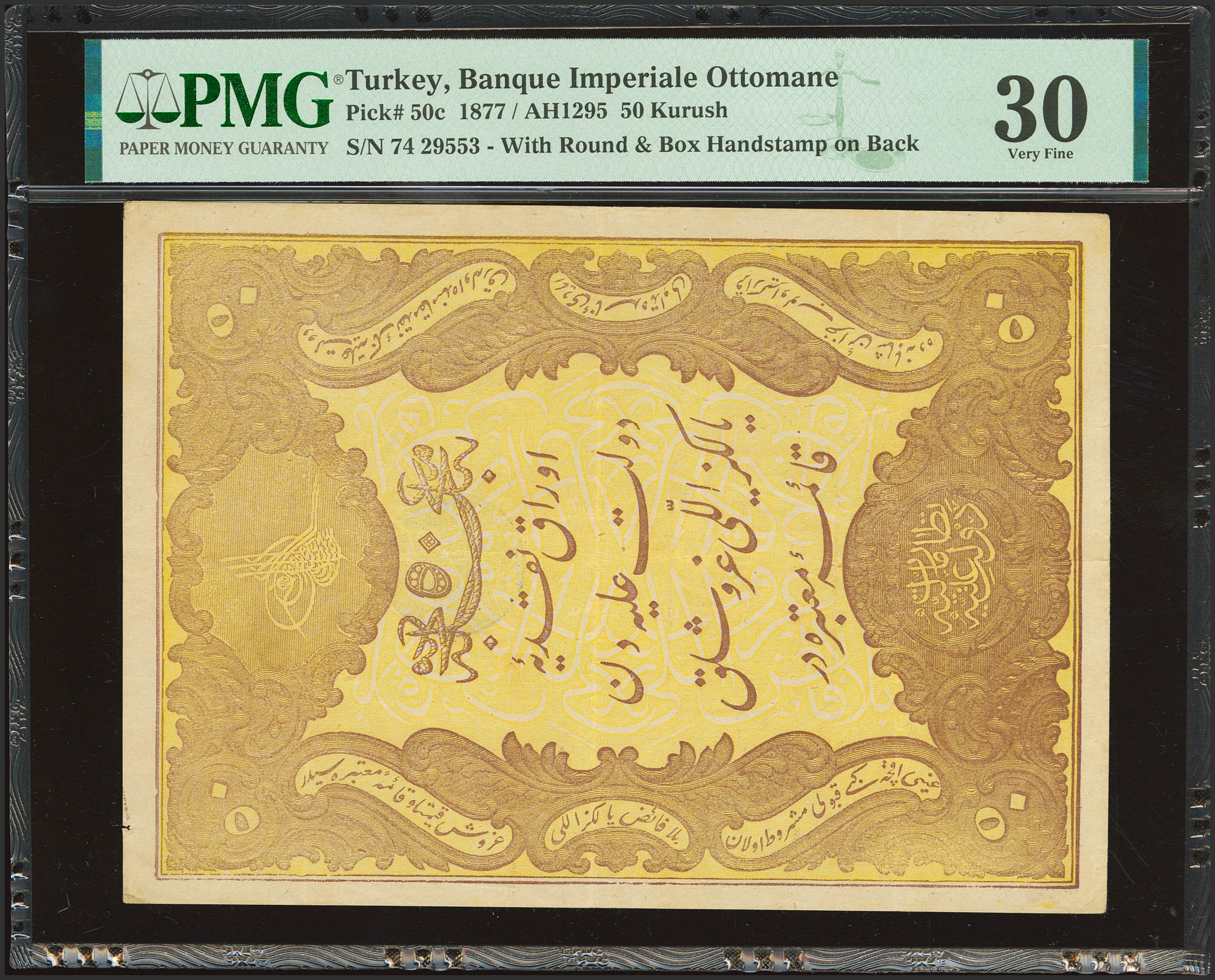 TURKEY. 50 Kurus. 1877. Banque Imperiale Ottomane. Toughra of Abdul Hamid II on front and Seal of Mehmed Kani on back. (Pick: 50c). PMG30.