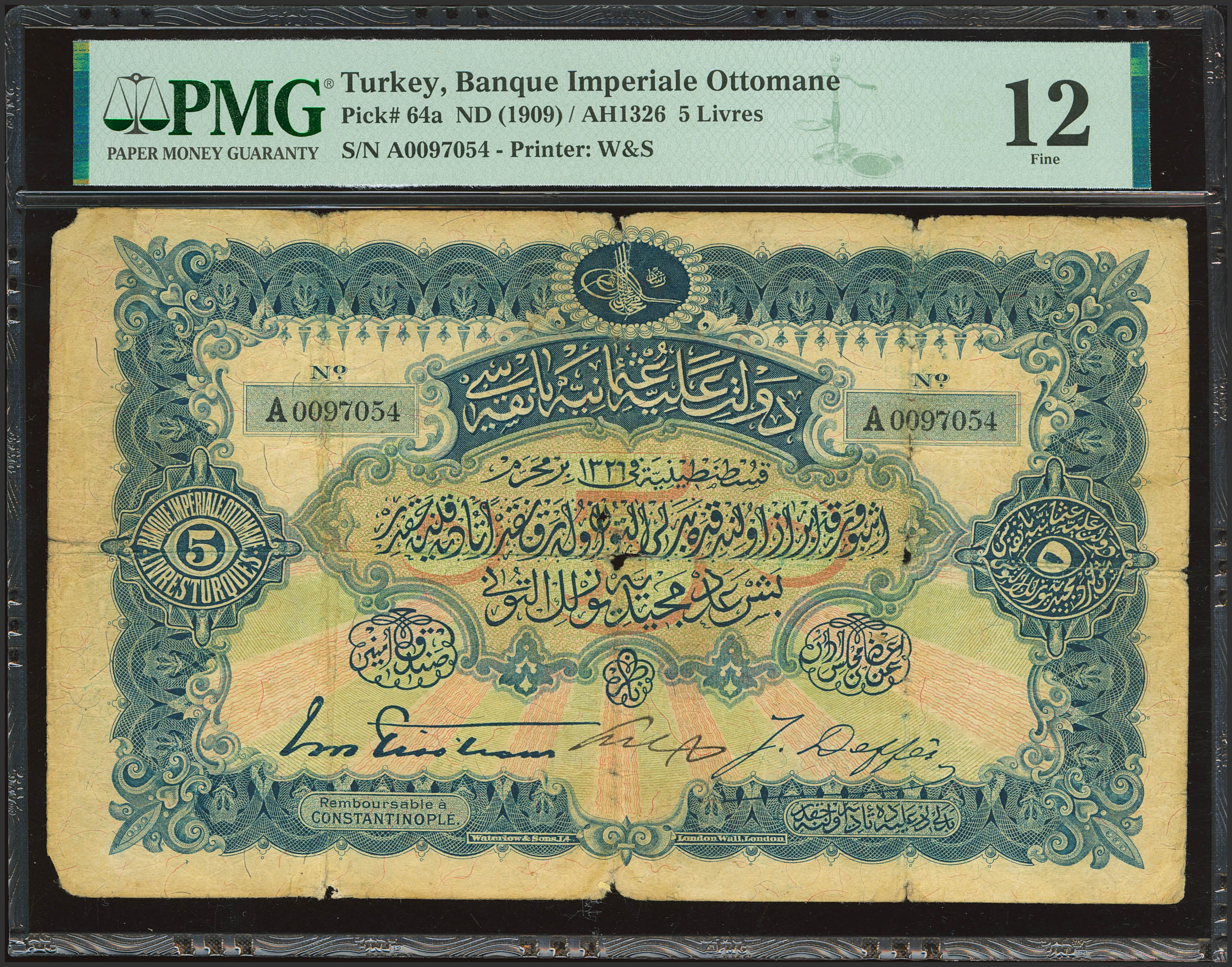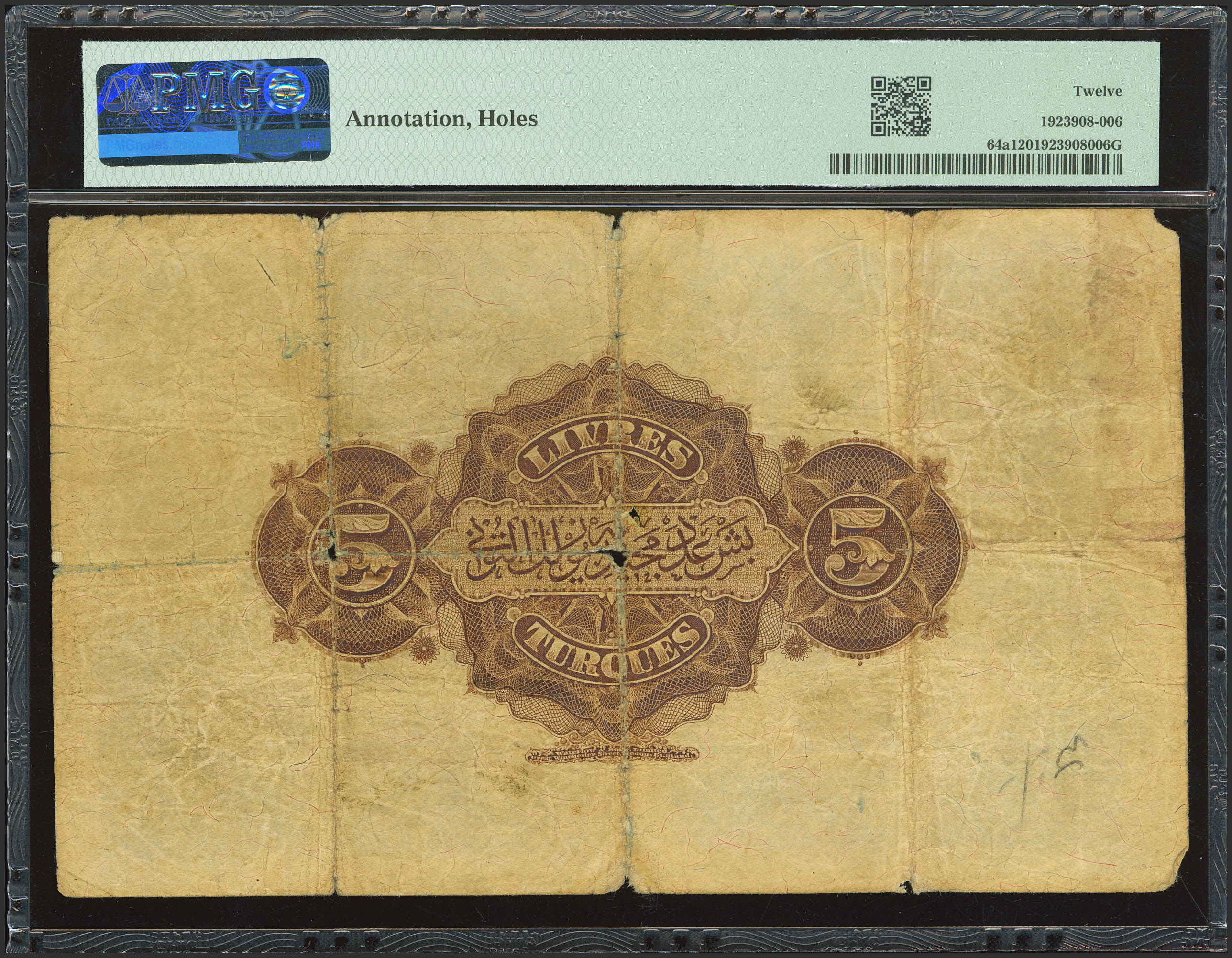 TURKEY. 5 Livres. 1909. Banque Imperiale Ottomane. Toughra of Muhammad V. (Pick: 64a). PMG12 (annotation, holes).
