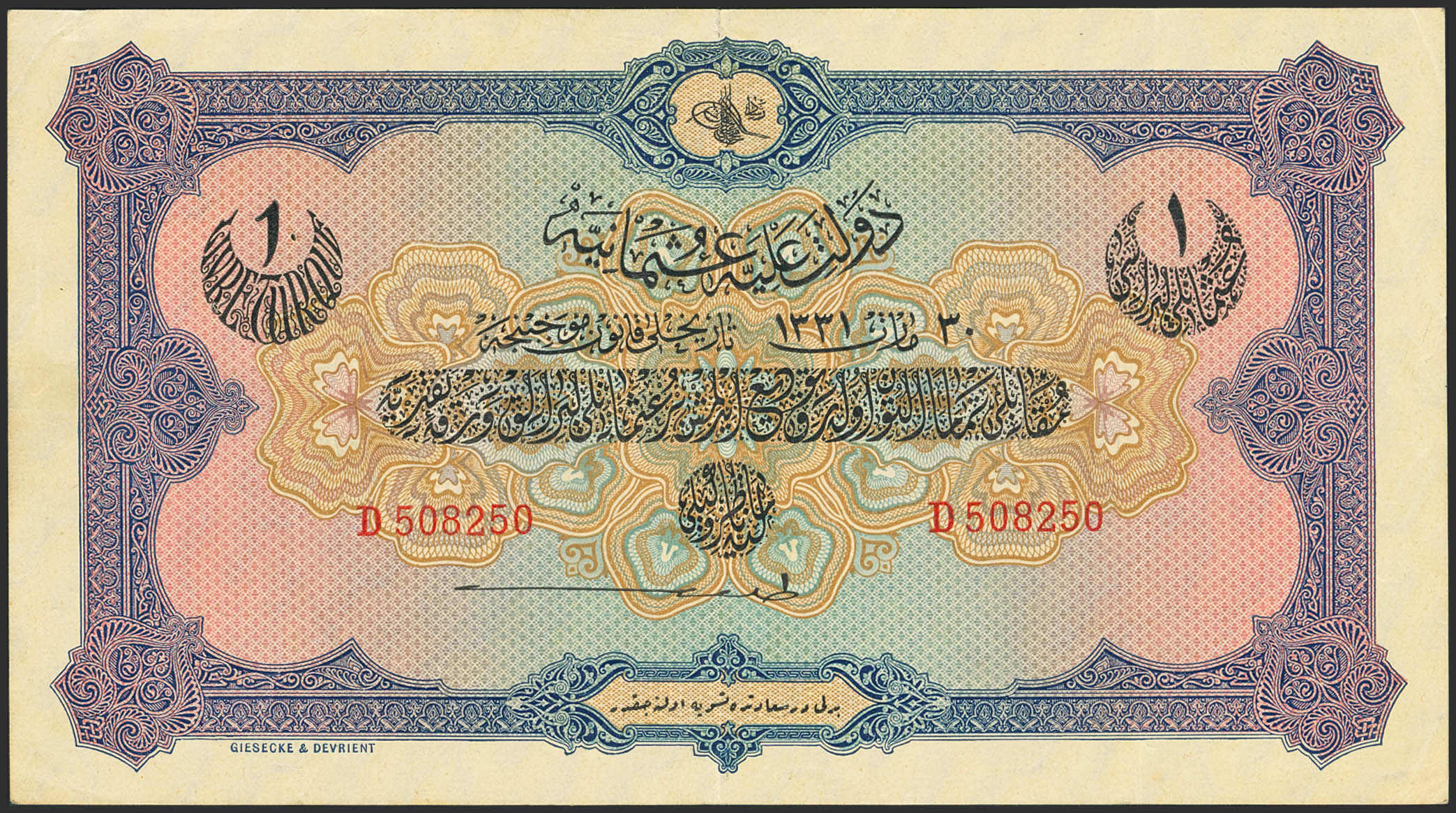 TURKEY. 1 Livre. 12 April 1915. Dette Publique Ottomane. (Pick: 69). Extremely Fine, tear.