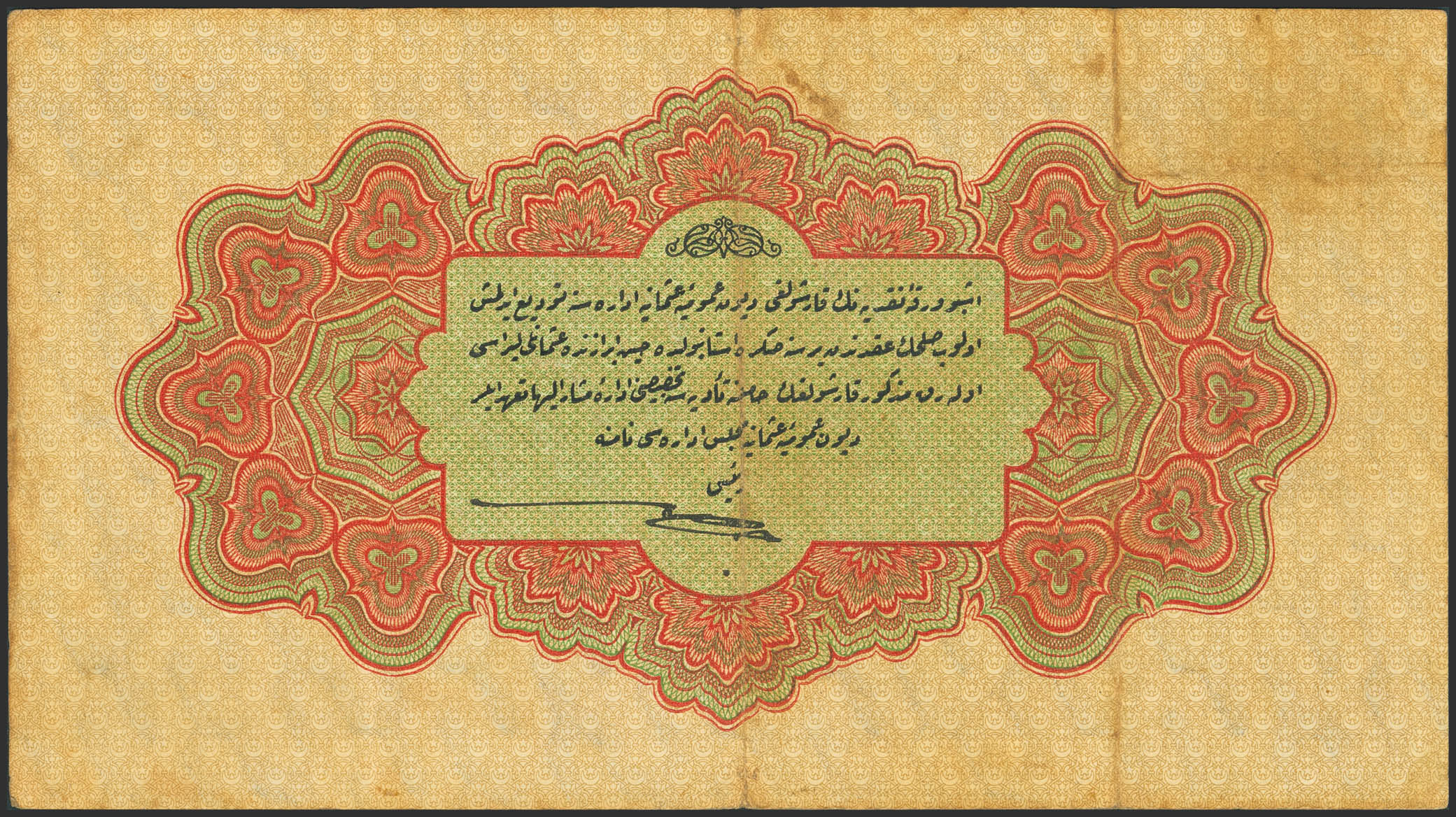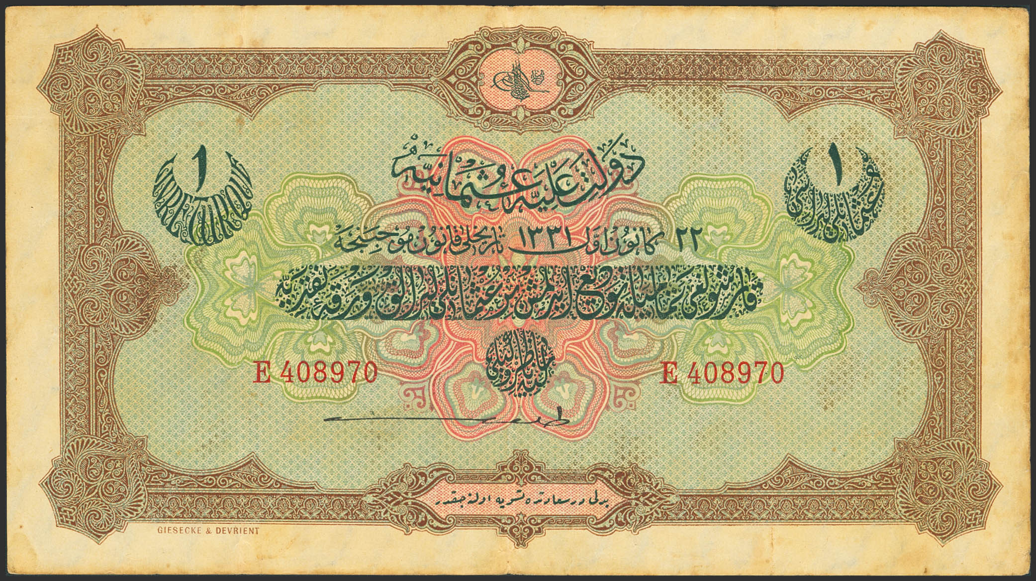 TURKEY. 1 Livre. 4 January 1916. Dette Publique Ottomane. Hook Pattern watermark. Cahid signature on back. (Pick: 83). Extremely Fine.