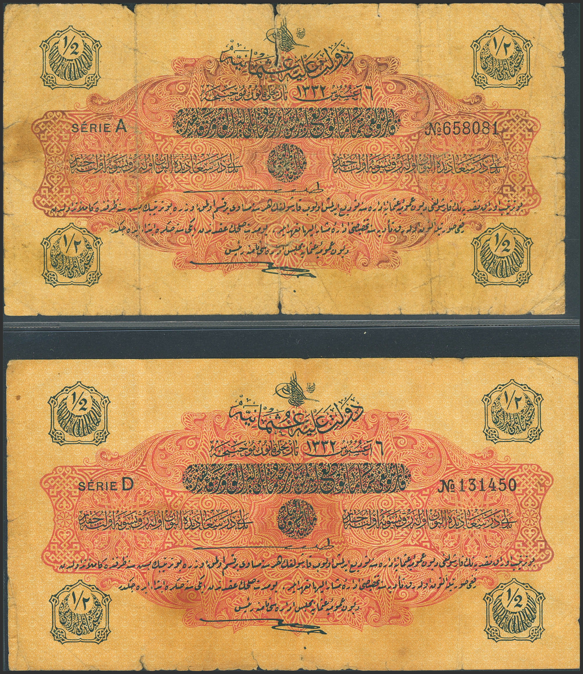TURKEY-OTTOMAN EMPIRE. Lot of 2 notes of ½ Livres. 19 August 1916. Ottoman Public Debt. (Pick: 89). Annotations on back. Fine and More than Fine.