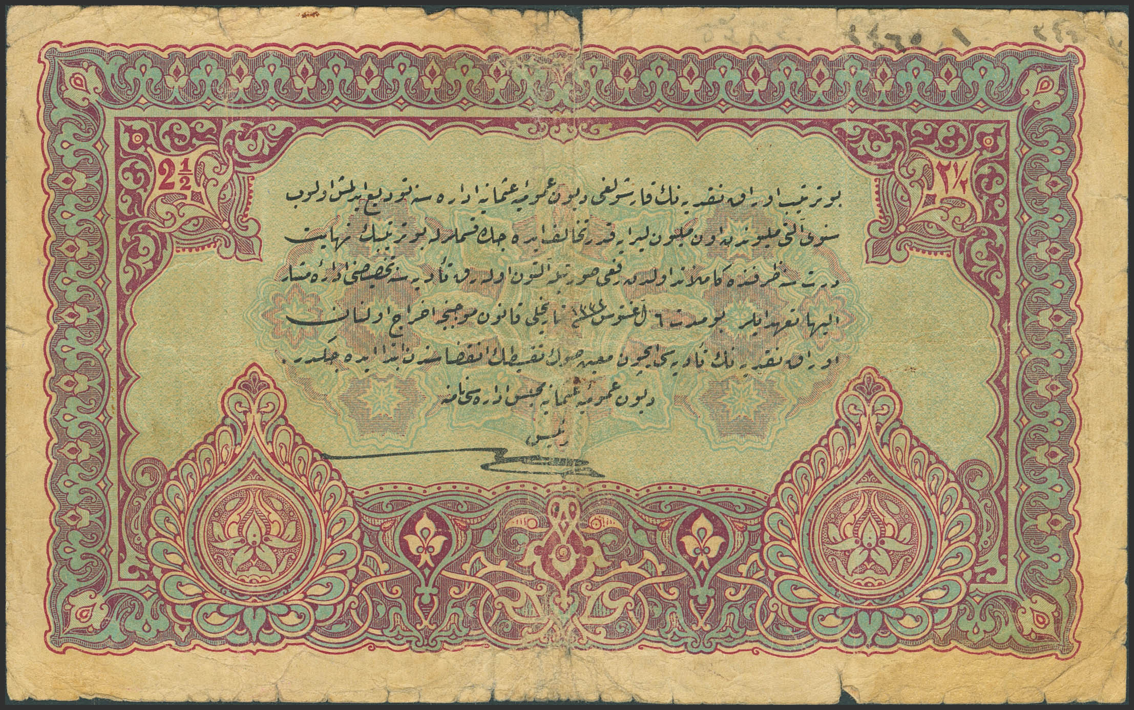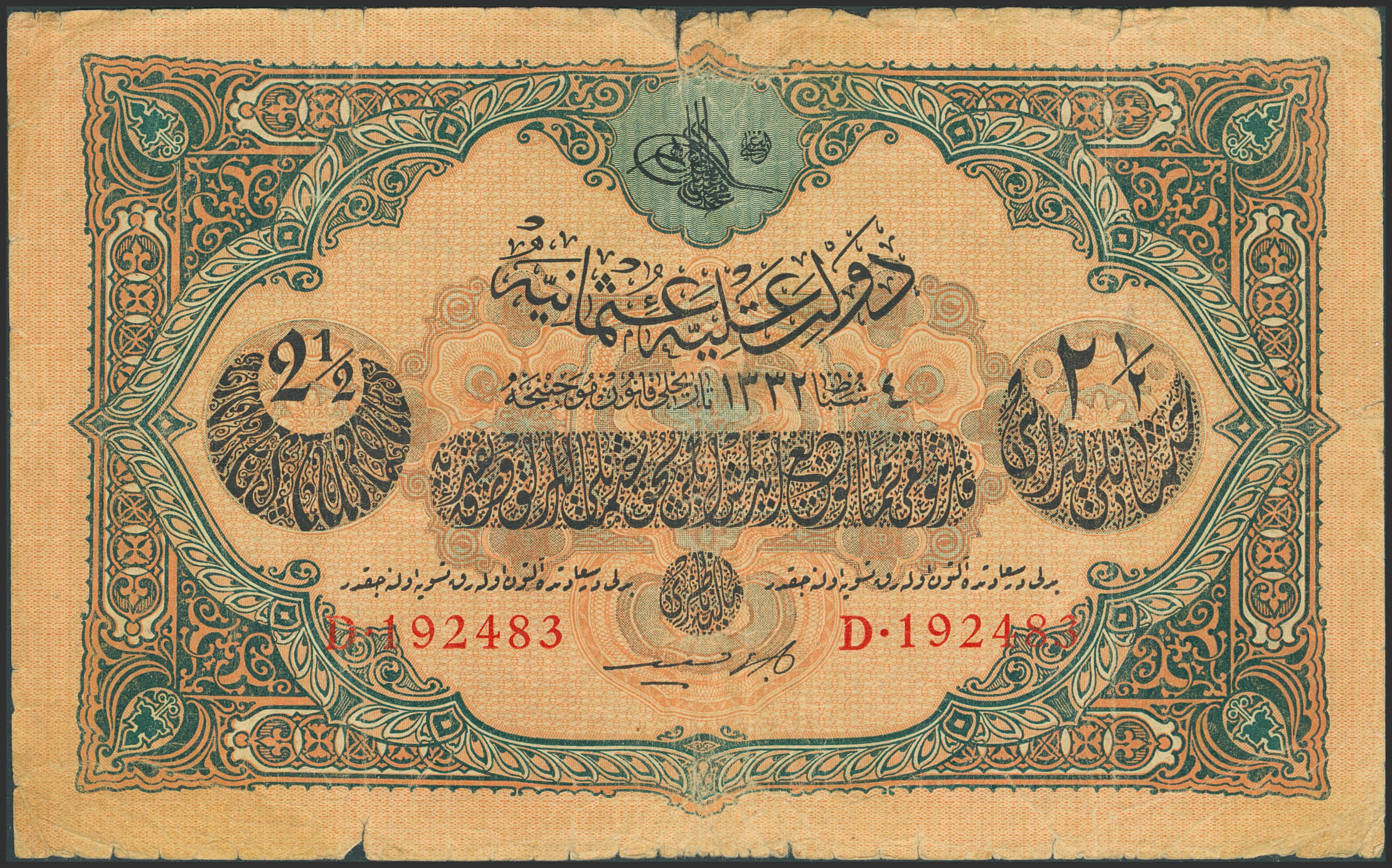 TURKEY. 2 ½ Livres. 17 February 1917. Banque Imperiale Ottomane. (Pick: 100). Fine, tears, pinholes.