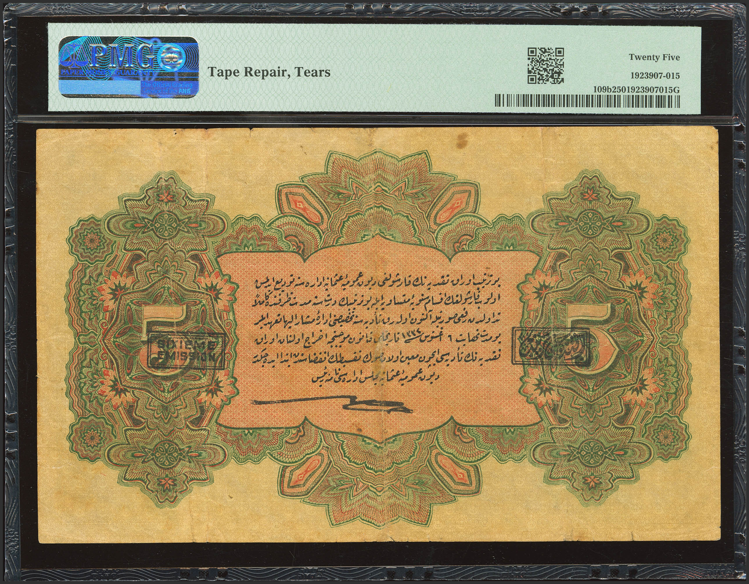 TURKEY. 5 Livres. 28 March 1918. Dette Publique Ottomane. (Pick: 109b). PMG25 (tape repairs, tears).
