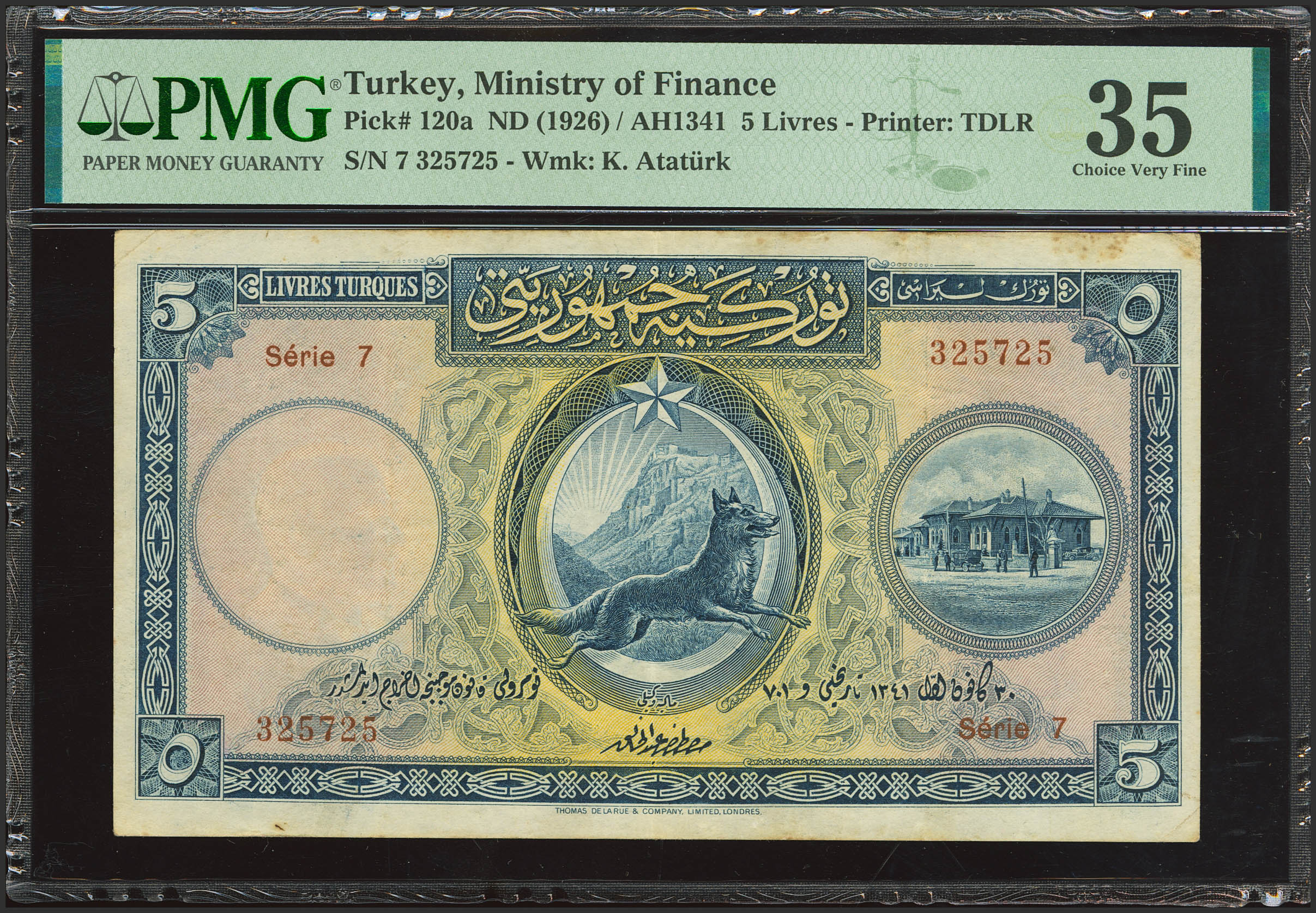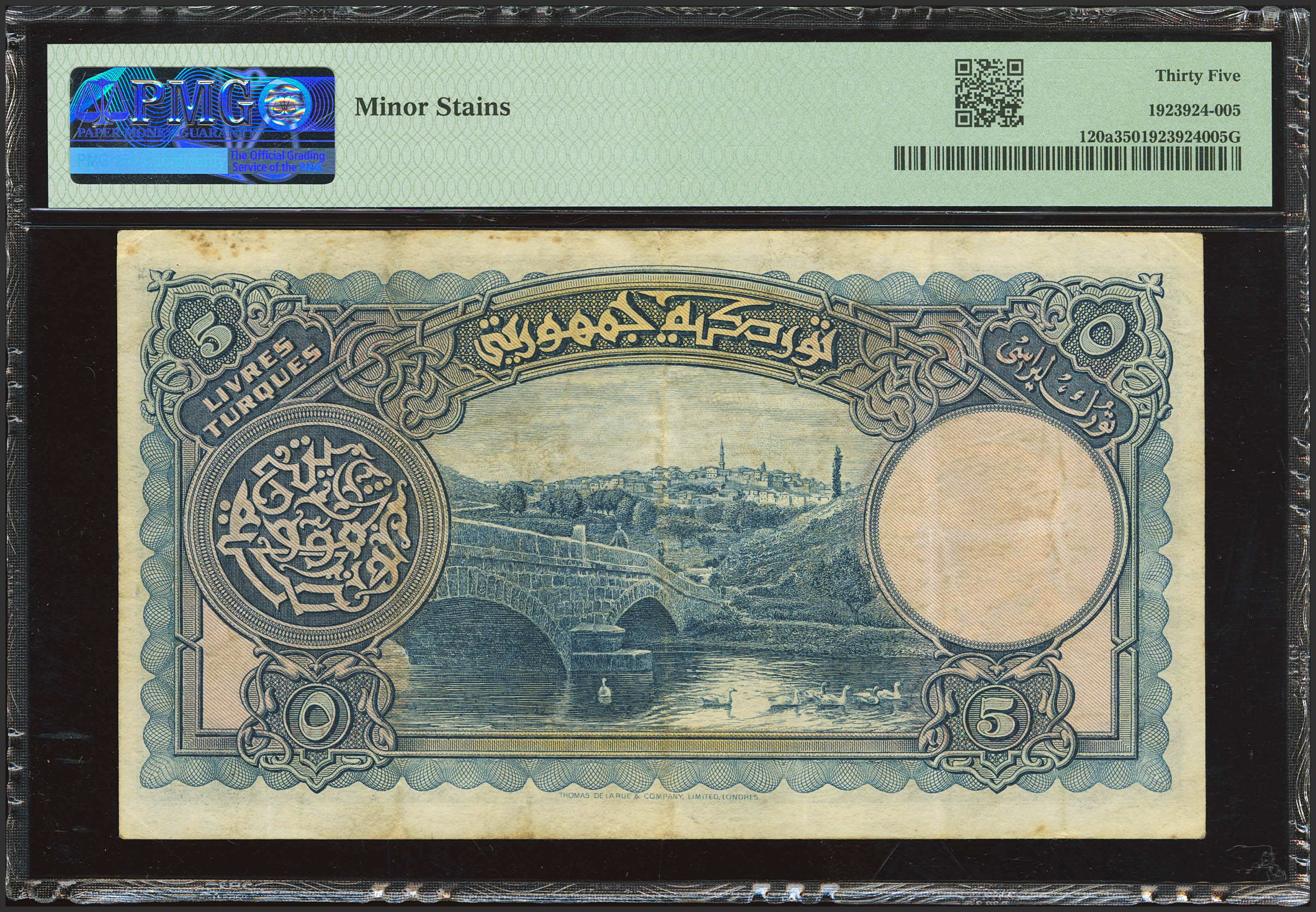 TURKEY. 5 Livres. 1926. Ministry of Finance. (Pick: 120a). PMG35 (minor stains).