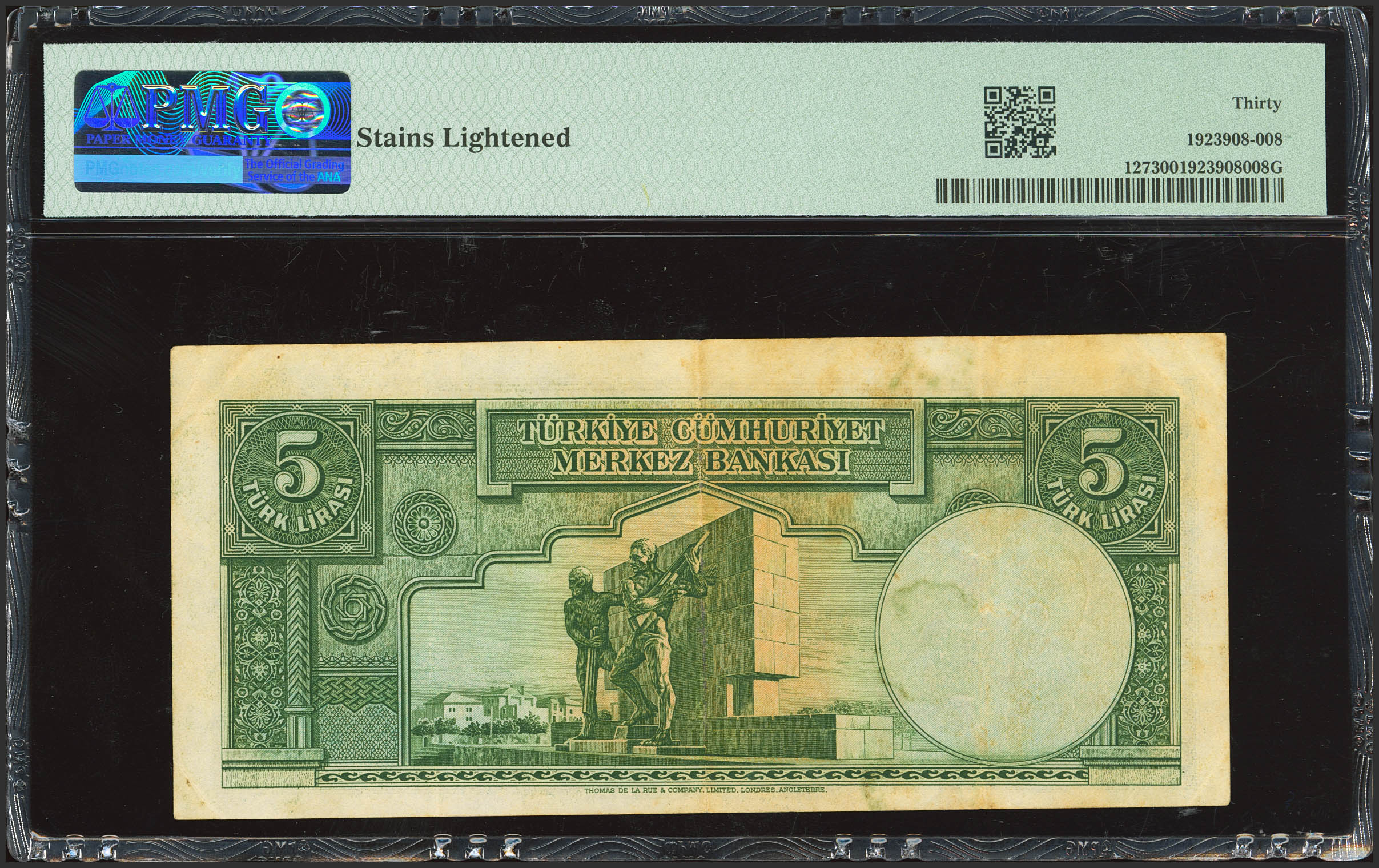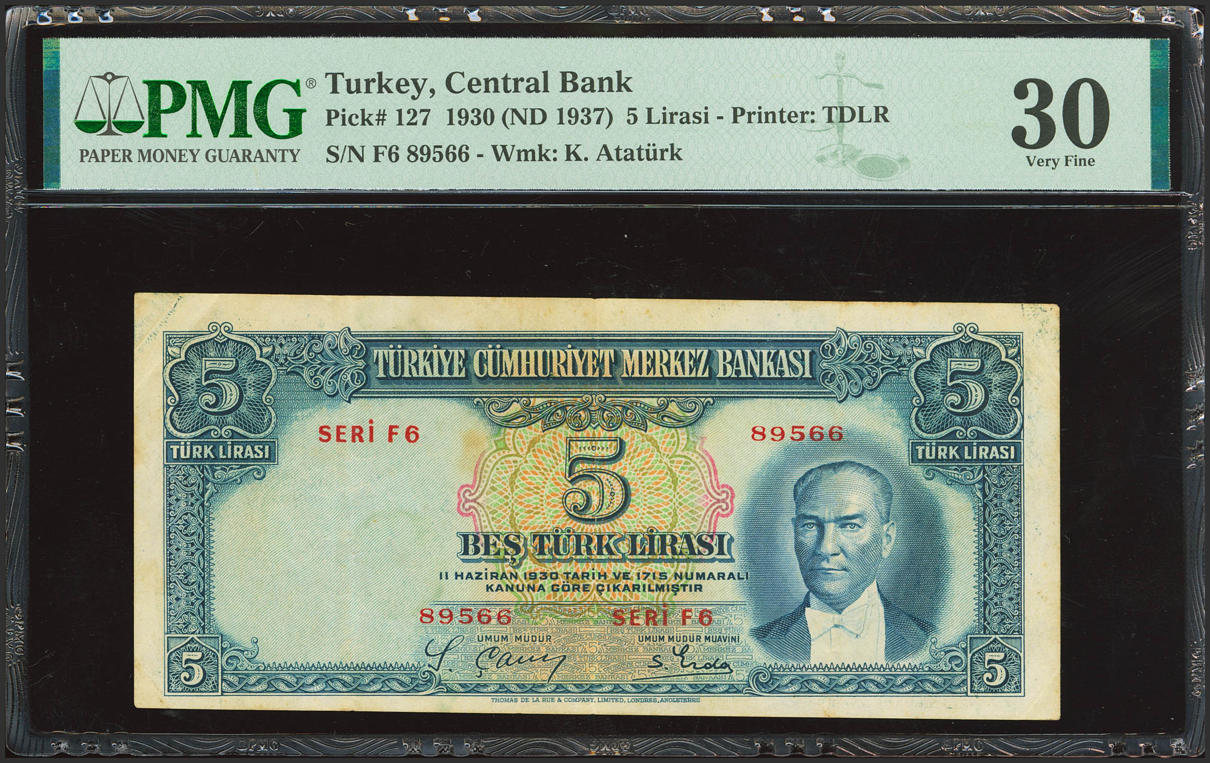 TURKEY-REPUBLIC. 5 Lirasi. (1937ca). Central Bank of the Republic. (Pick: 127). PMG30 (stains lightened).