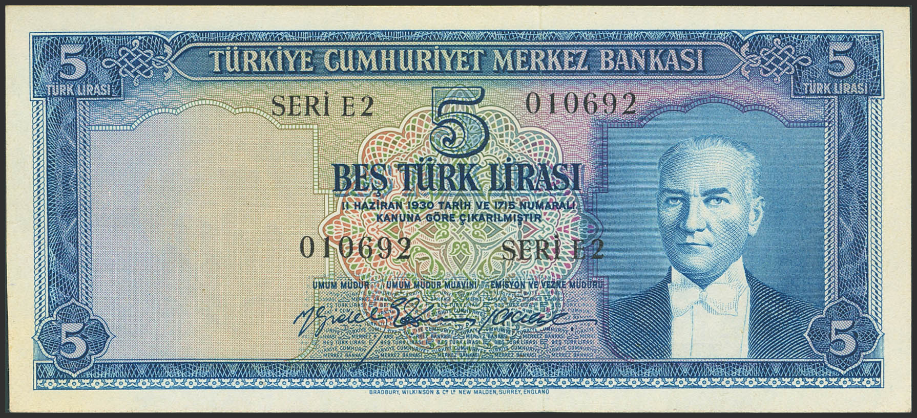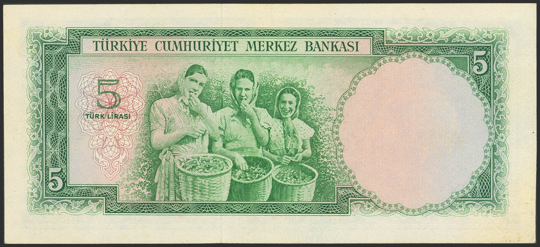 TURKEY-REPUBLIC. 5 Lirasi. (1951ca). Central Bank of the Republic. (Pick: 155a). Almost Uncirculated.