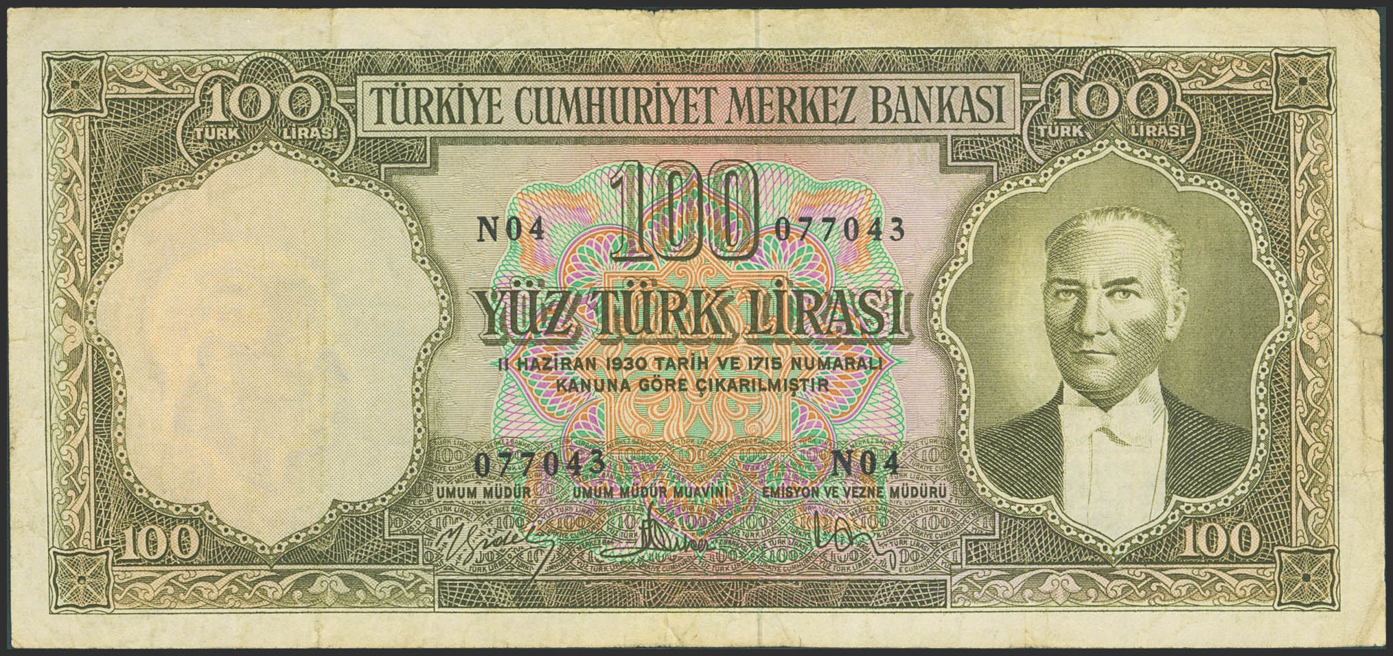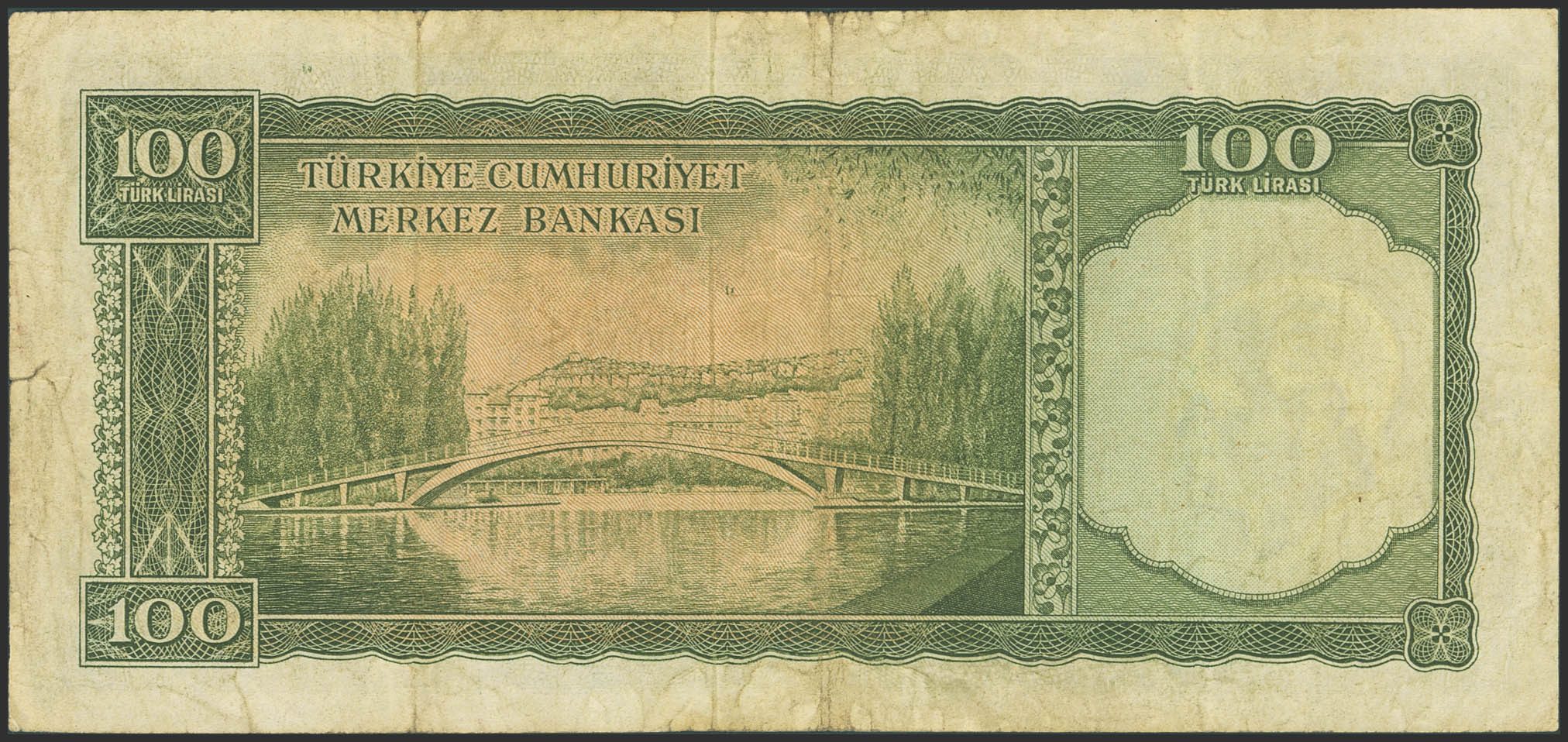 TURKEY-REPUBLIC. 100 Lirasi. (1951ca). Central Bank of the Republic. (Pick: 169a). Tear on right. Very Fine.