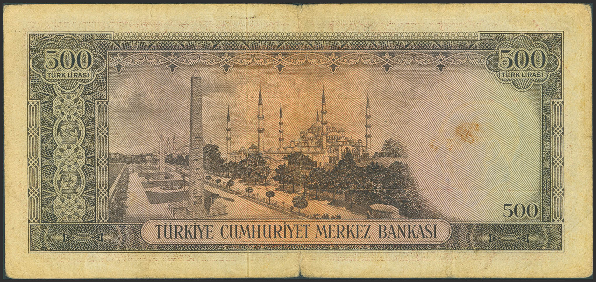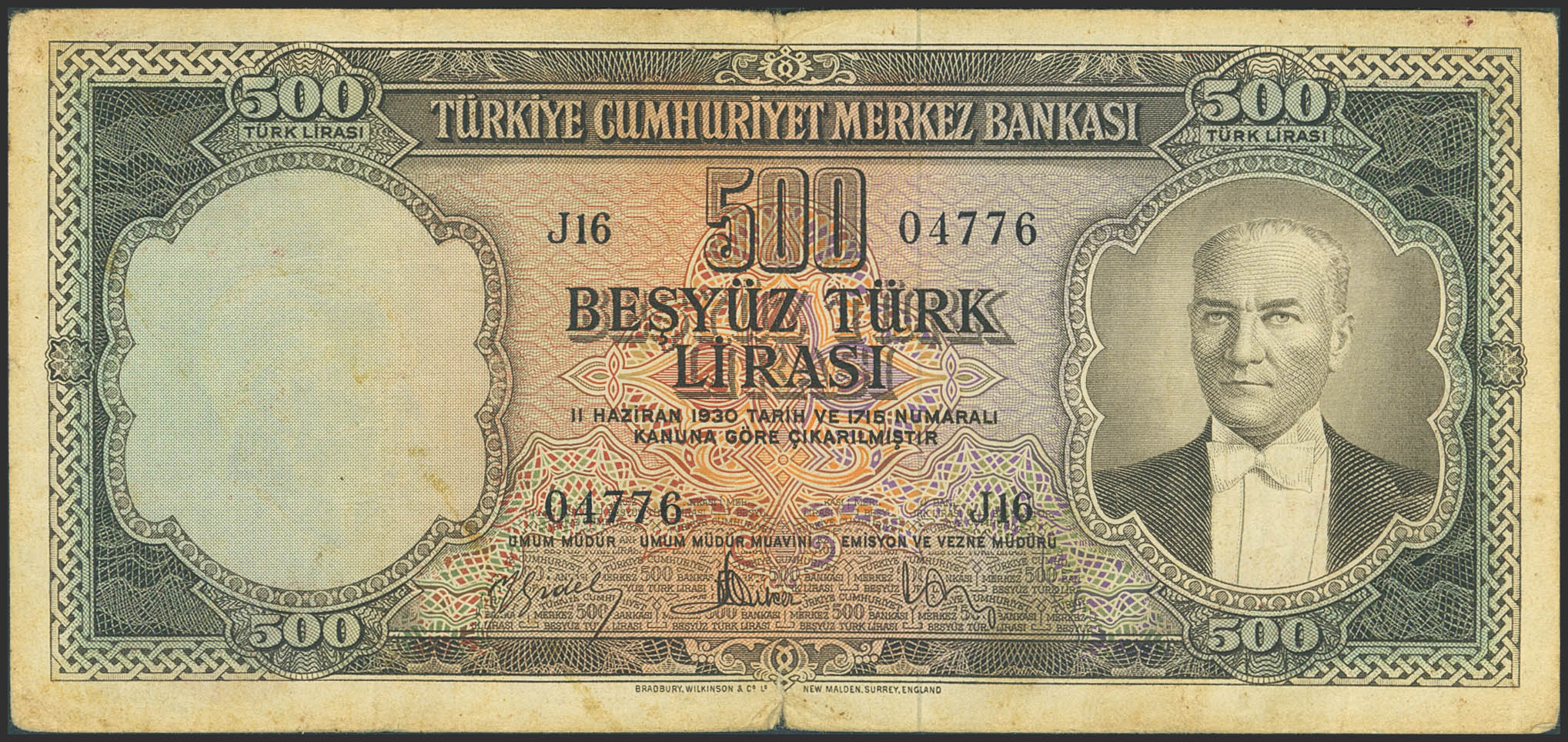 TURKEY-REPUBLIC. 500 Lirasi. (1951ca). Central Bank of the Republic. (Pick: 171a). Tears and stains. Very Fine.