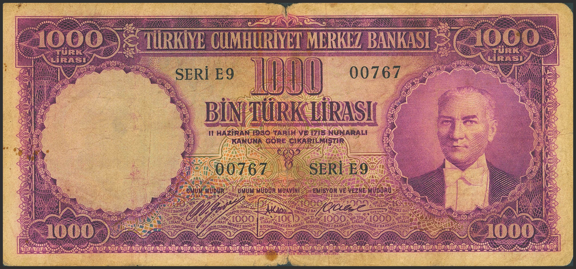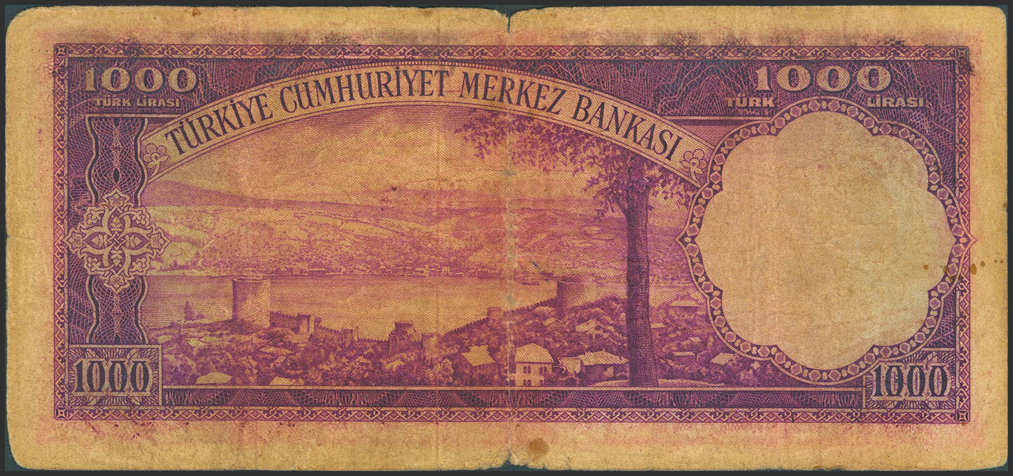 TURKEY-REPUBLIC. 1000 Lirasi. (1951ca). Central Bank of the Republic. (Pick: 172a). Tears and stains. Fine.