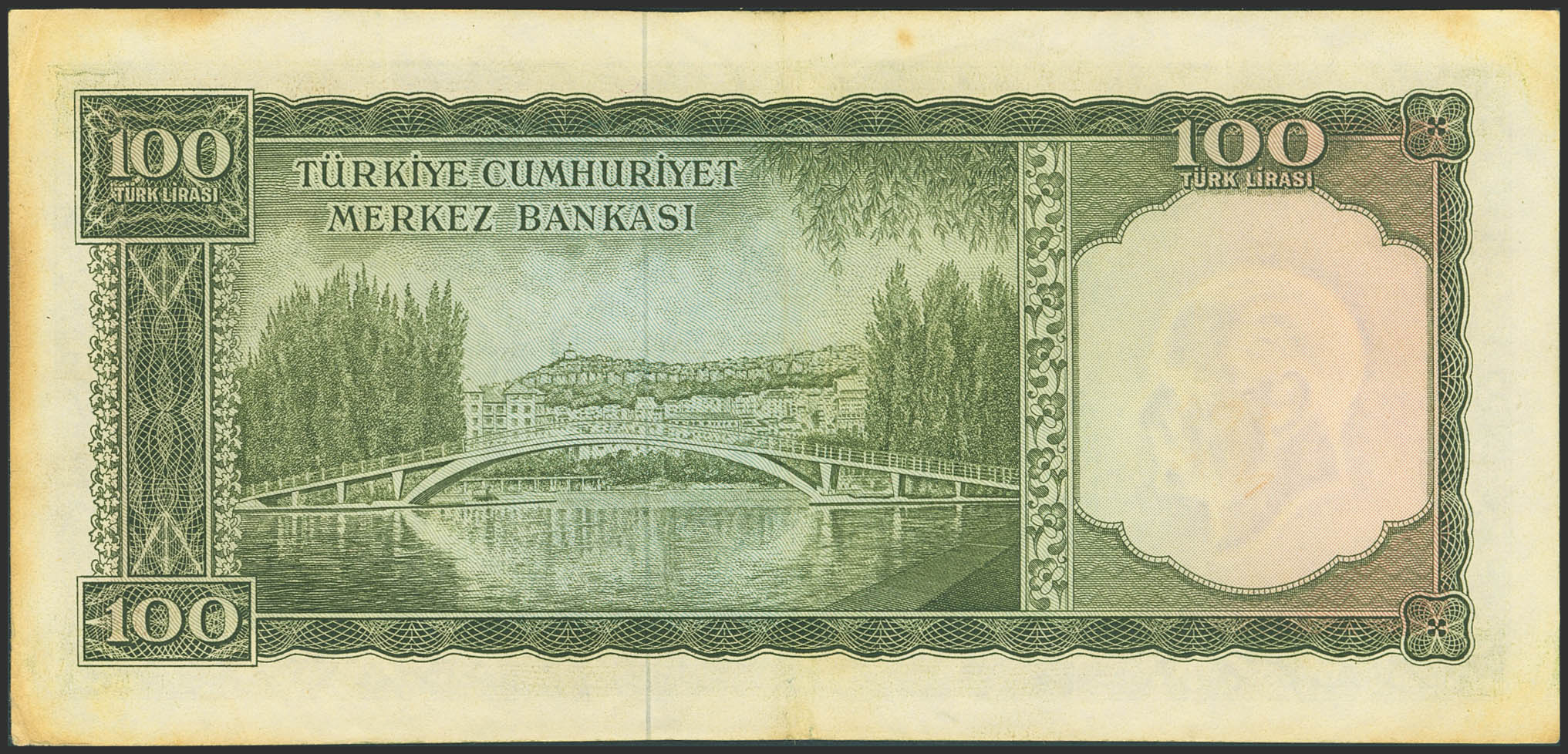 TURKEY-REPUBLIC. 100 Lirasi. (1951ca). Central Bank of the Republic. (Pick: 177a). Right edge darkened. More than Very Fine.