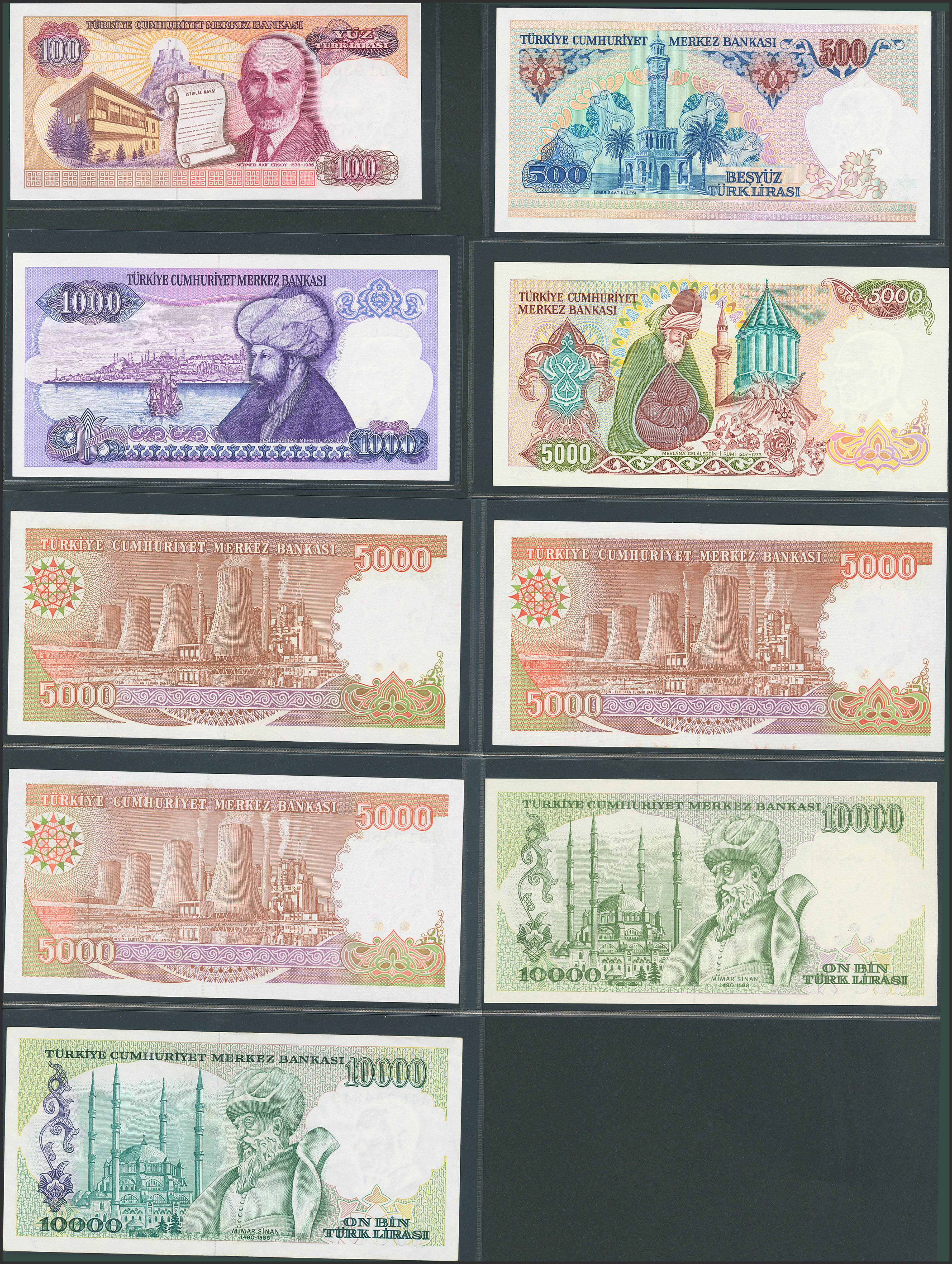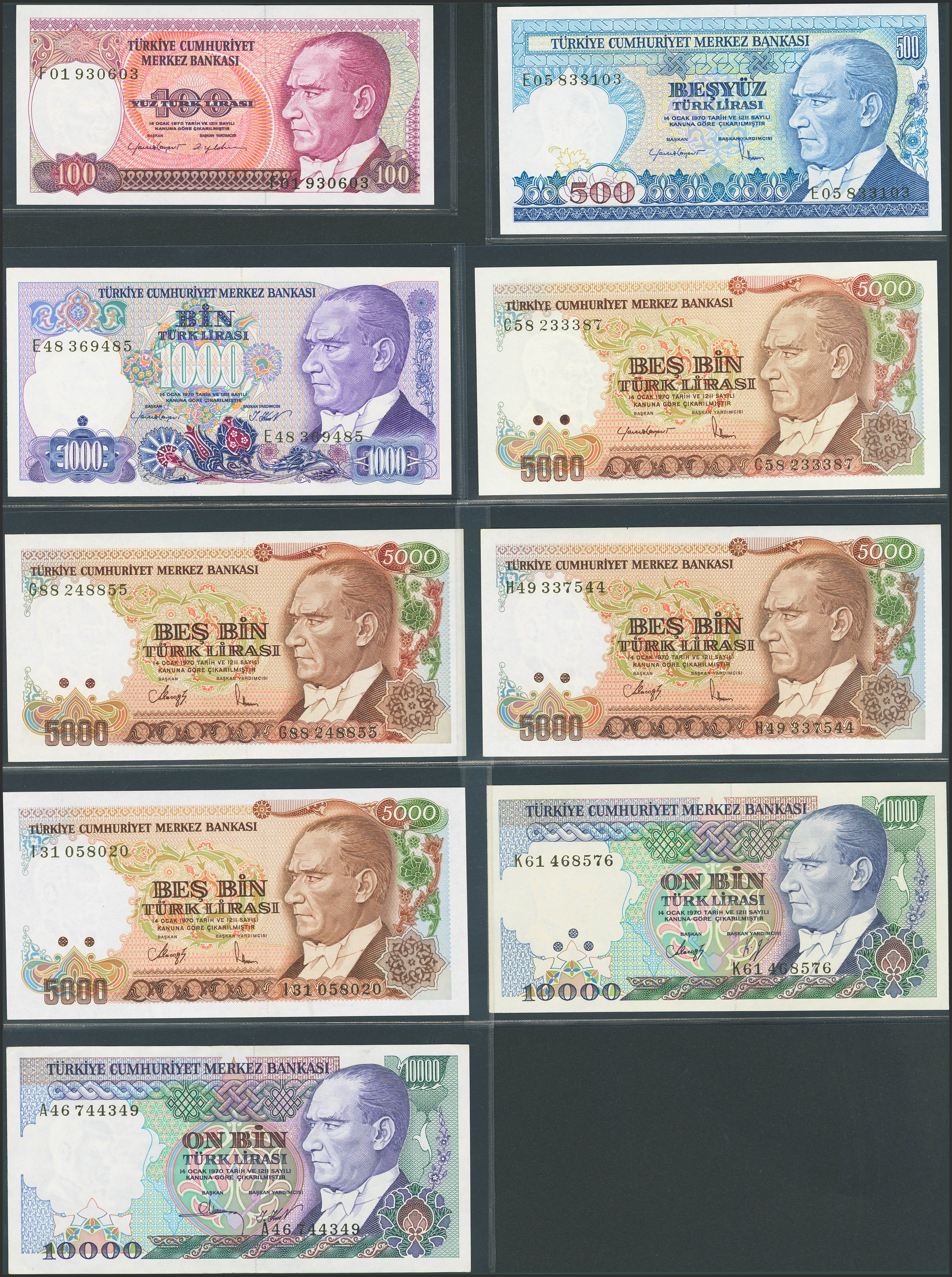TURKEY-REPUBLIC. Lot of 9 notes from 100 at 10000 Lirasi. (1984ca). Central Bank of the Republic. (Pick: 194b, 195, 196, 197, 198(3), 199, 200). Uncirculated.