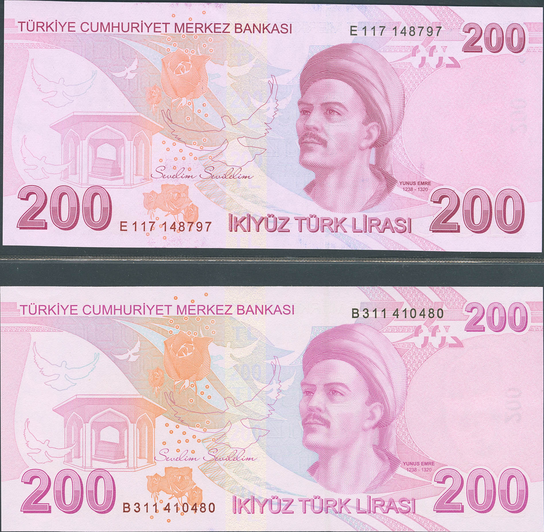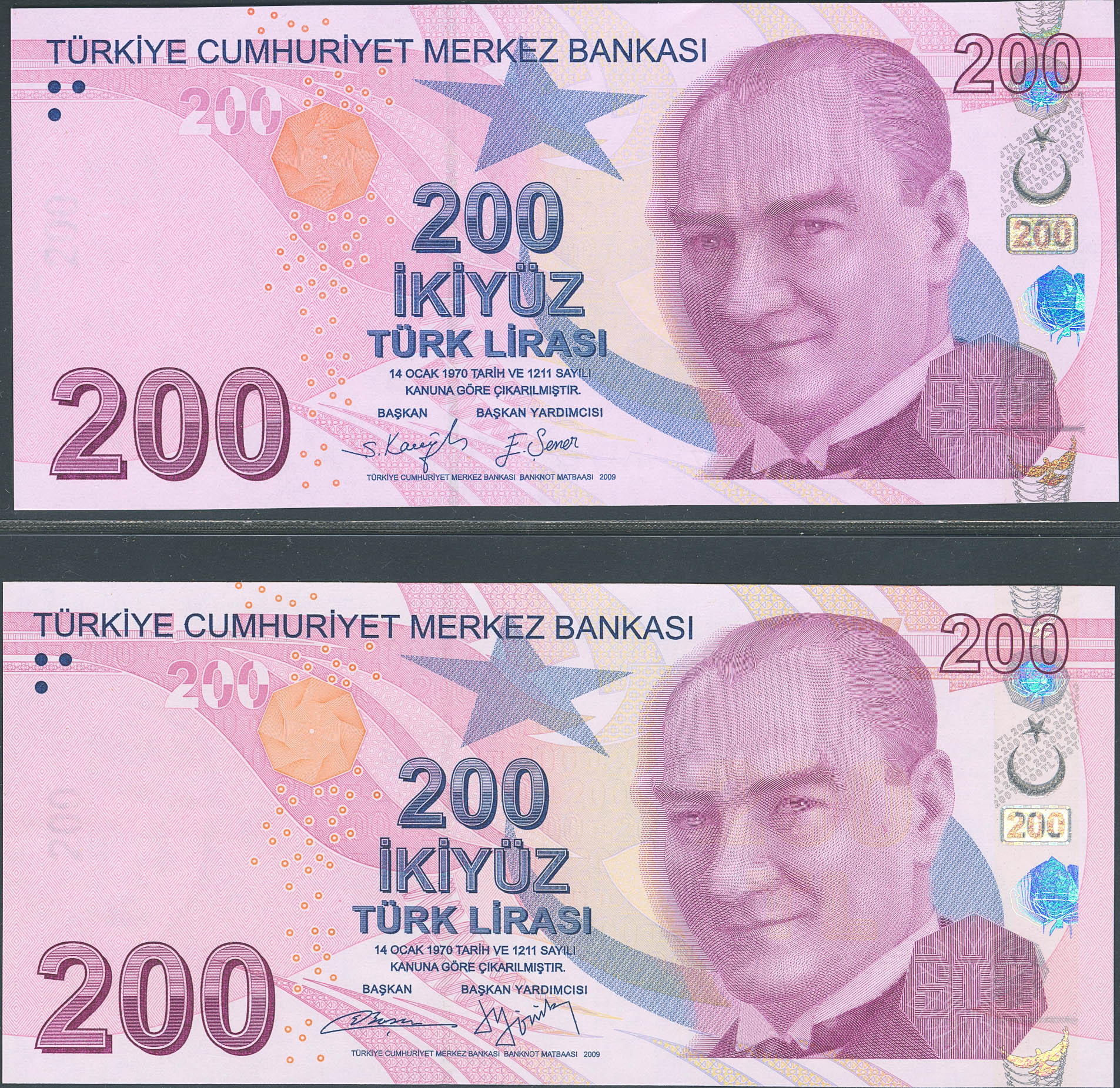 TURKEY-REPUBLIC. Lot of 2 notes of 200 Lirasi. 2009. Central Bank of the Republic. (Pick: 227b, 227e). Uncirculated.