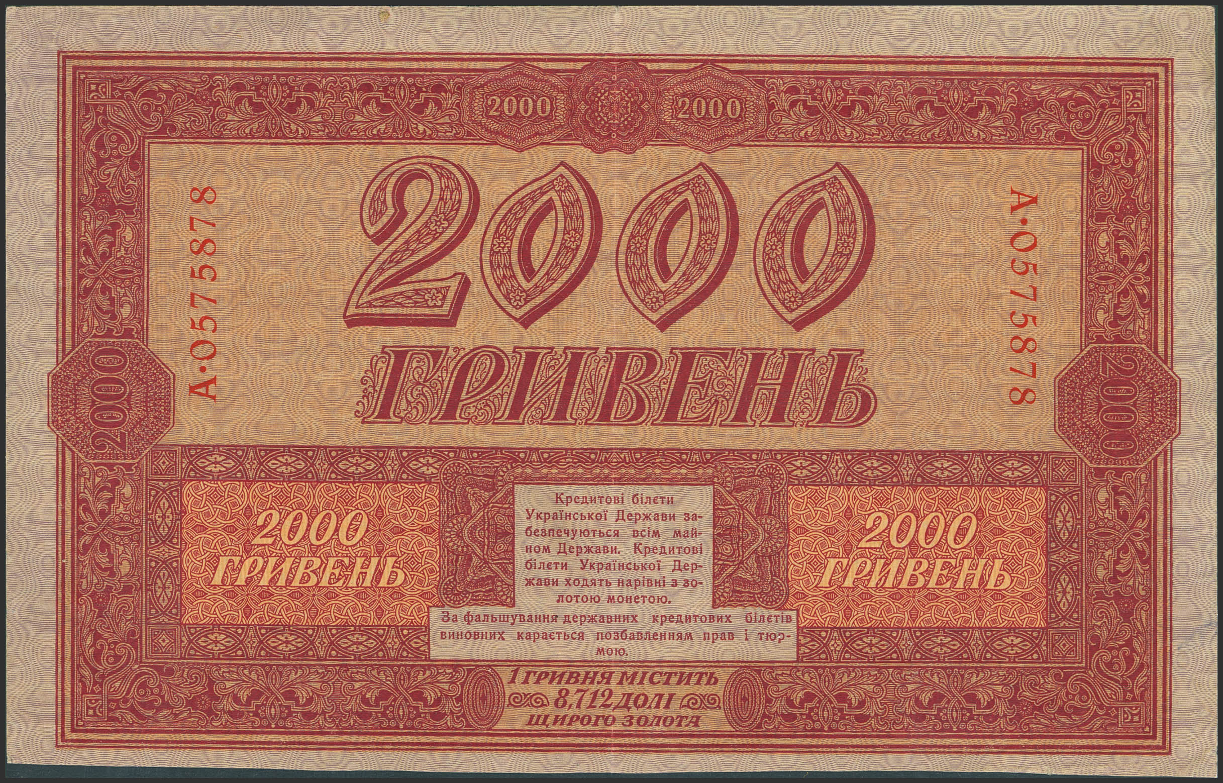 UKRAINE. 2000 Hriven. 1918. Ukrainian State. (Pick: 25). More than Extremely Fine.
