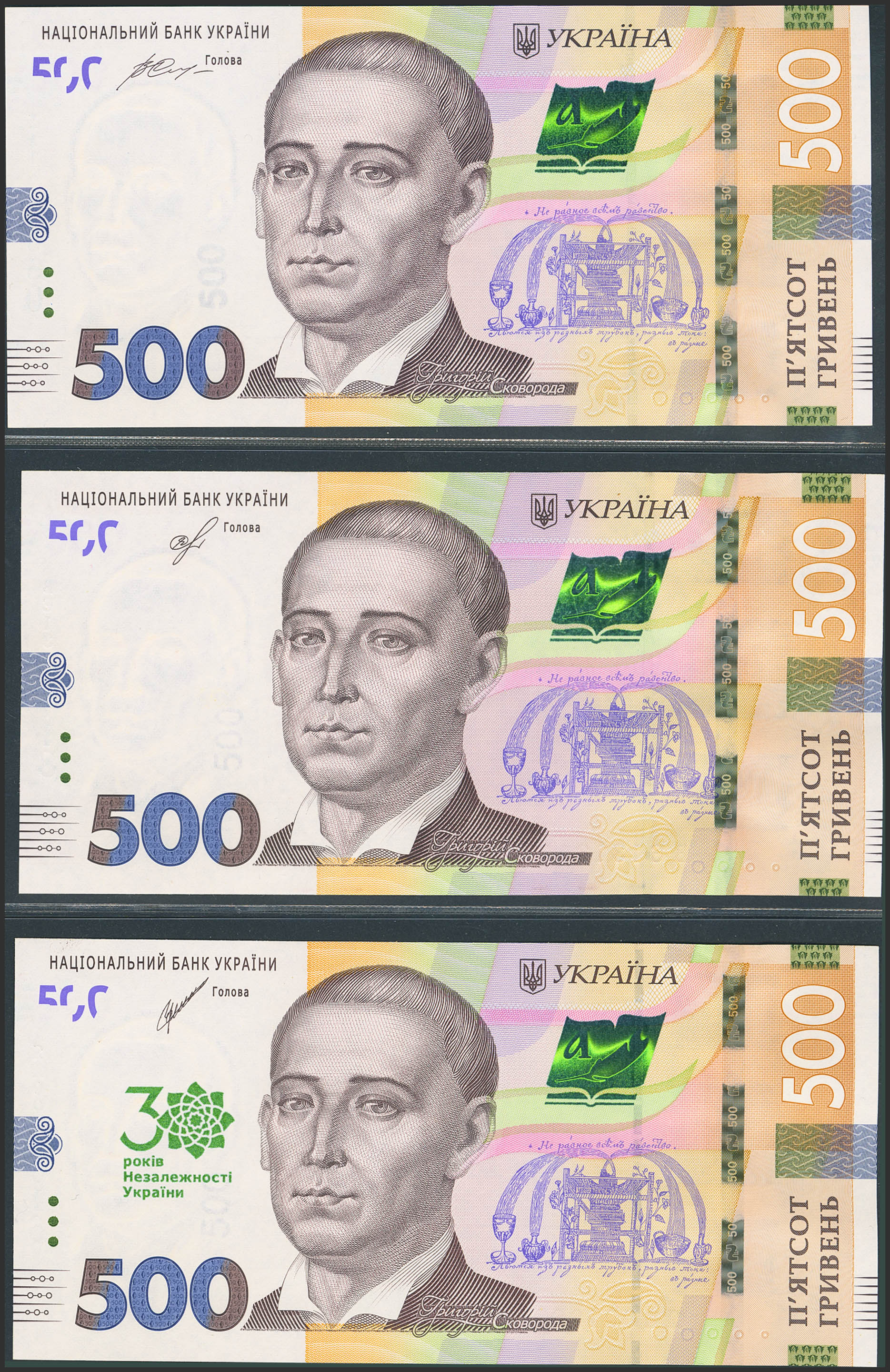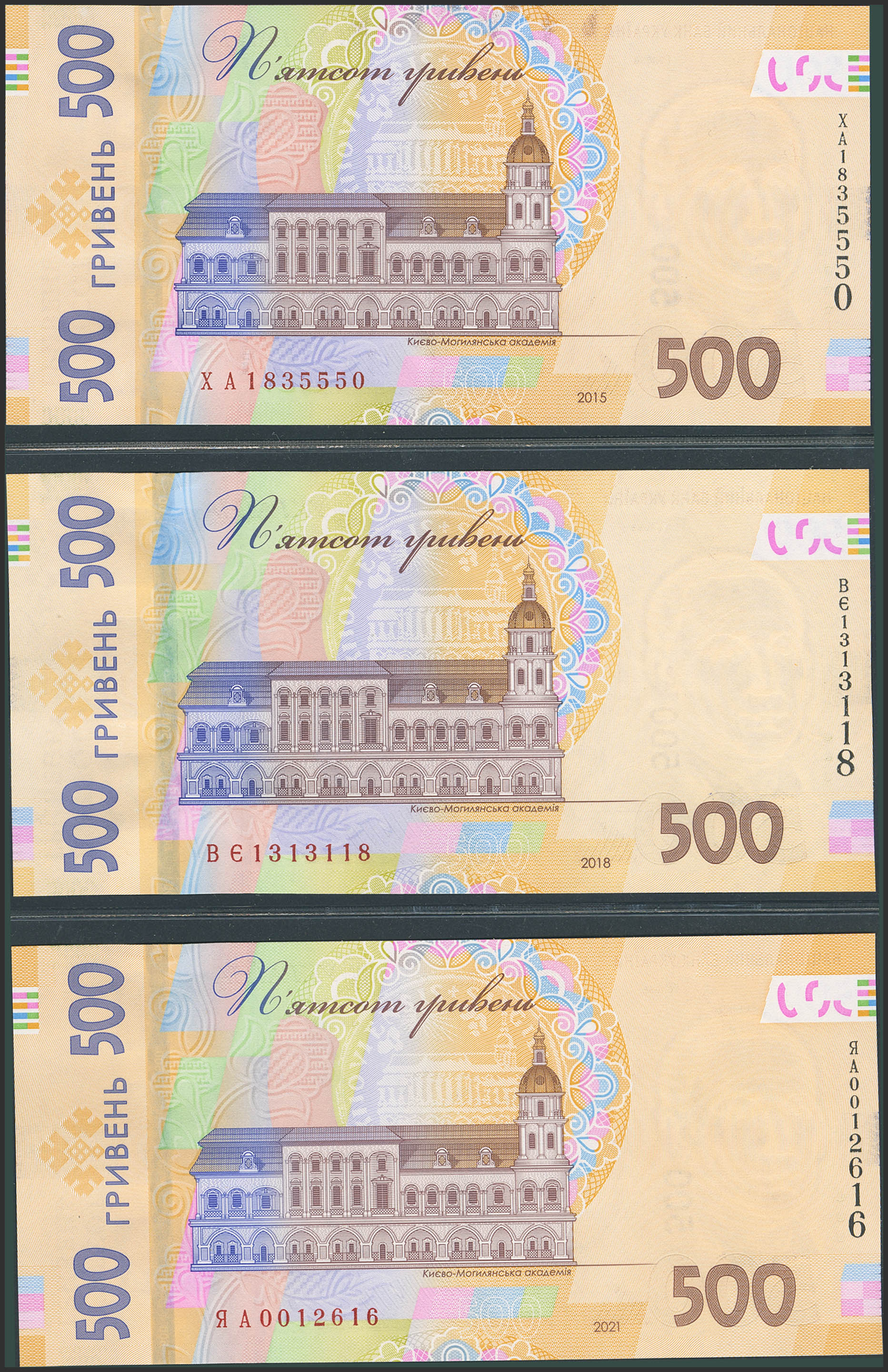 UKRAINE. Lot of 3 notes of 500 Hriven. (2015ca). National Bank. (Pick: 127a, 127b, 127c). Uncirculated.