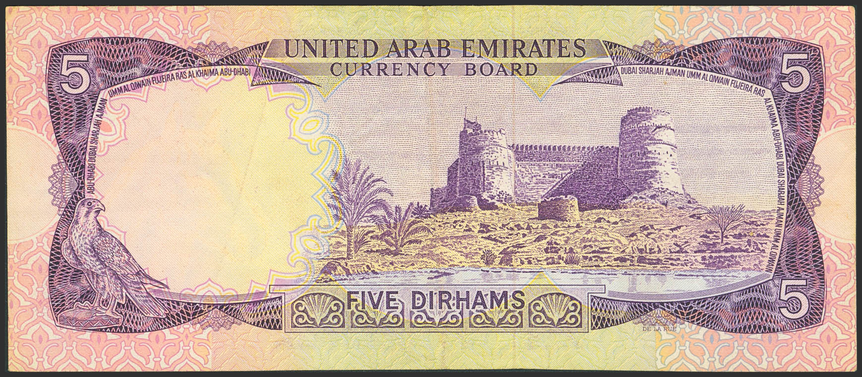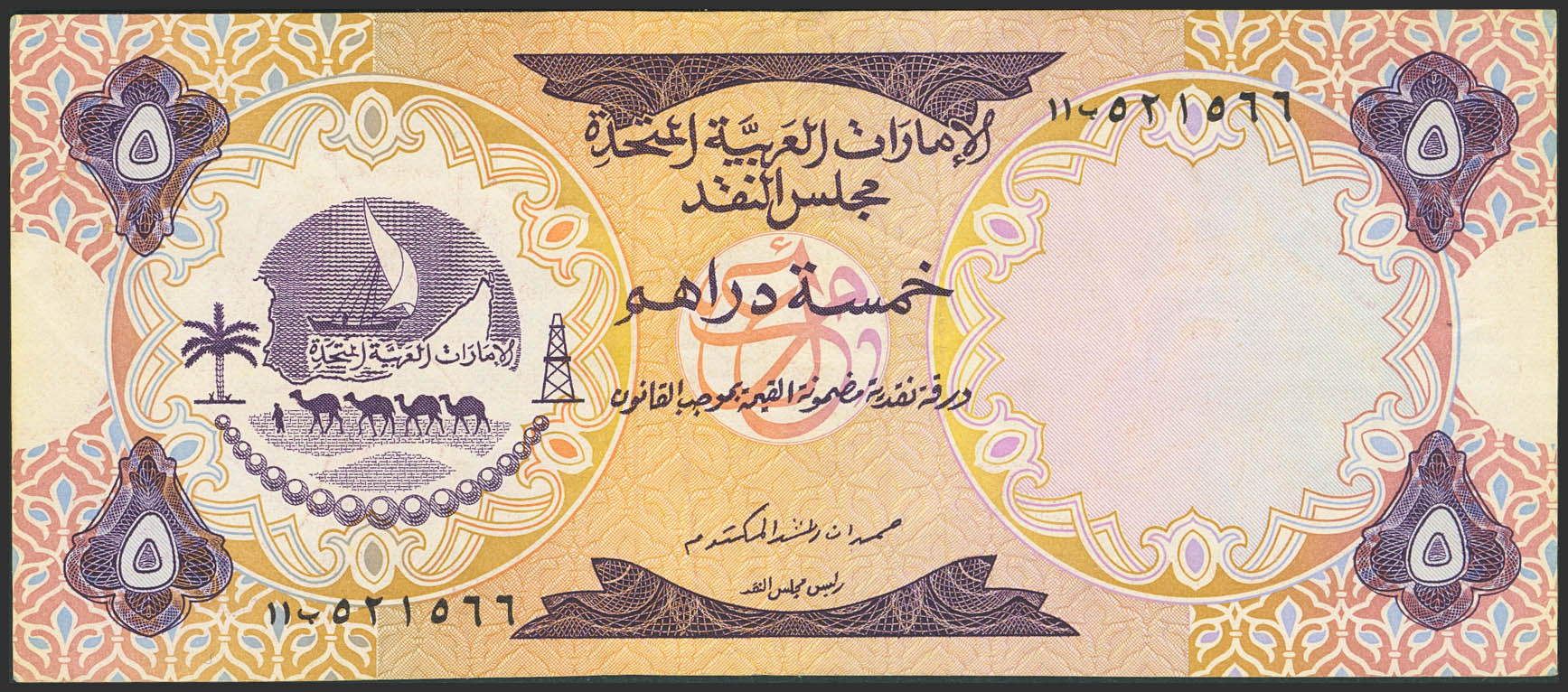 UNITED ARAB EMIRATES. 5 Dirhams. (1973ca). Currency Board. (Pick: 2a). Extremely Fine, staple holes.