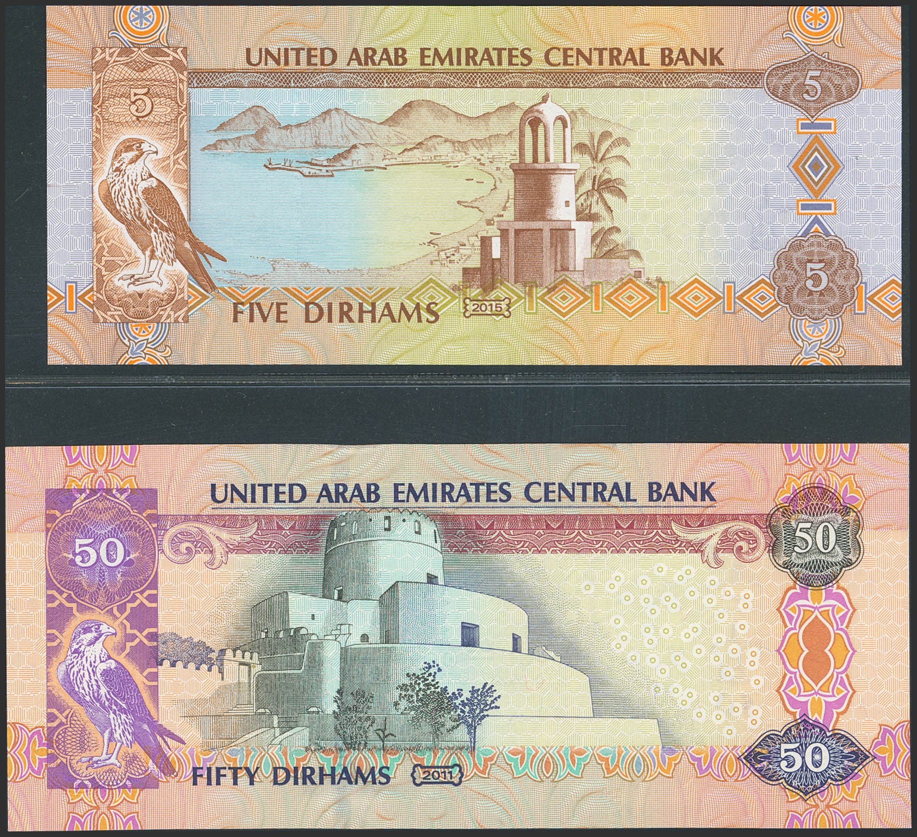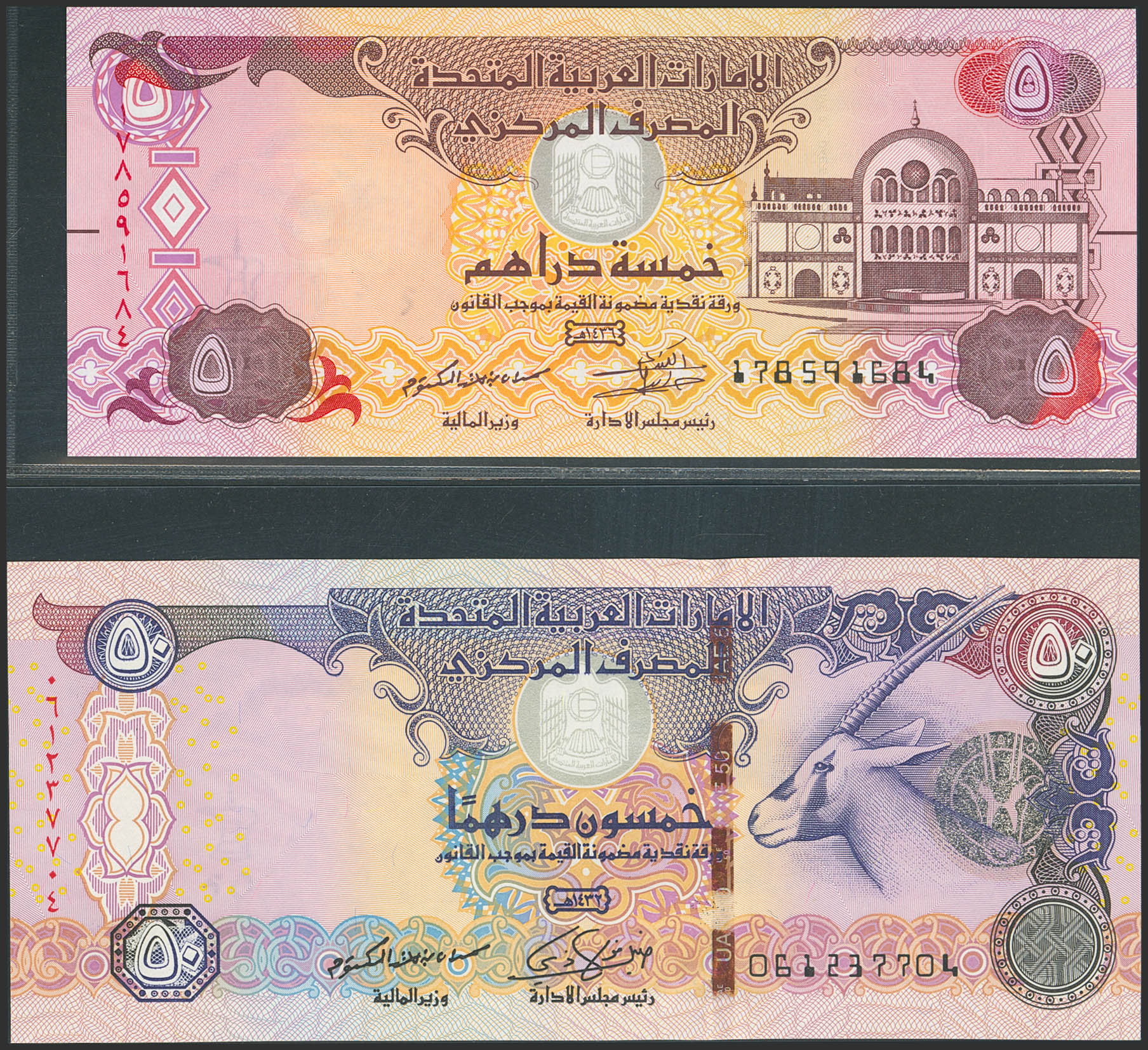 UNITED ARAB EMIRATES. Lot of 2 notes of 5 and 50 Dirhams. Central Bank. (Pick: 26c, 29d). Uncirculated.
