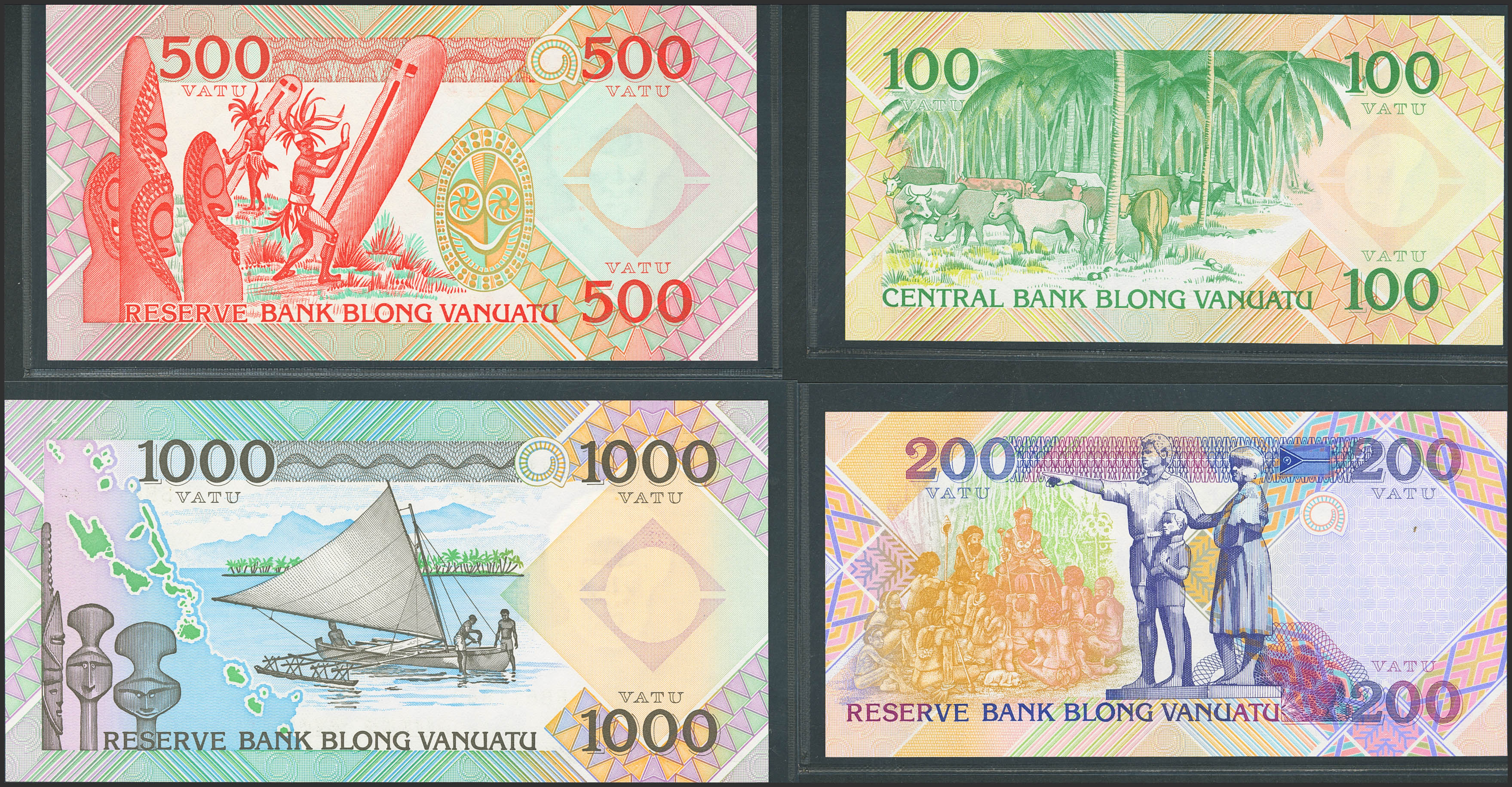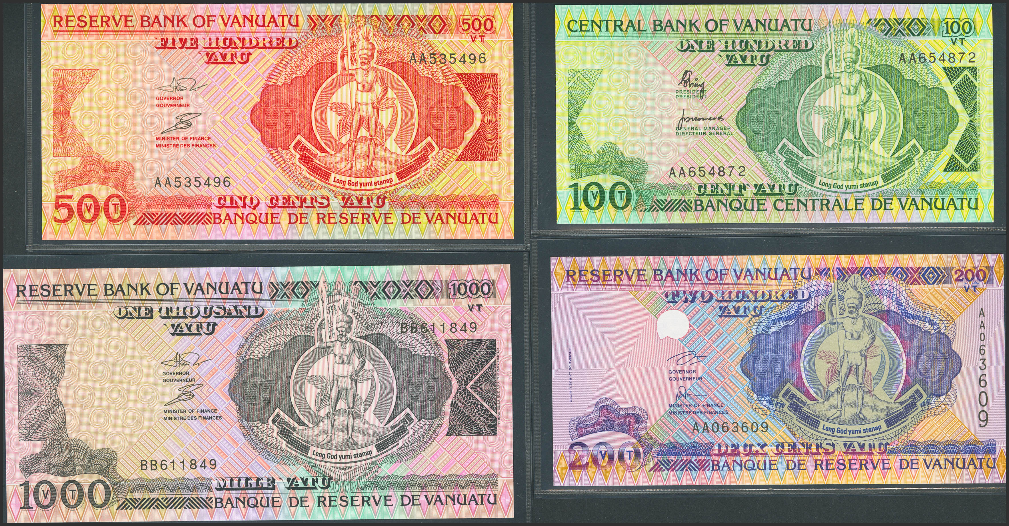 VANUATU. Lot of 4 notes of 100, 200, 500 and 1000 Vatu. 1982, 1993. Central Bank (1) and Reserve Bank (3). (Pick: 1a, 5a, 6, 8a). Uncirculated.