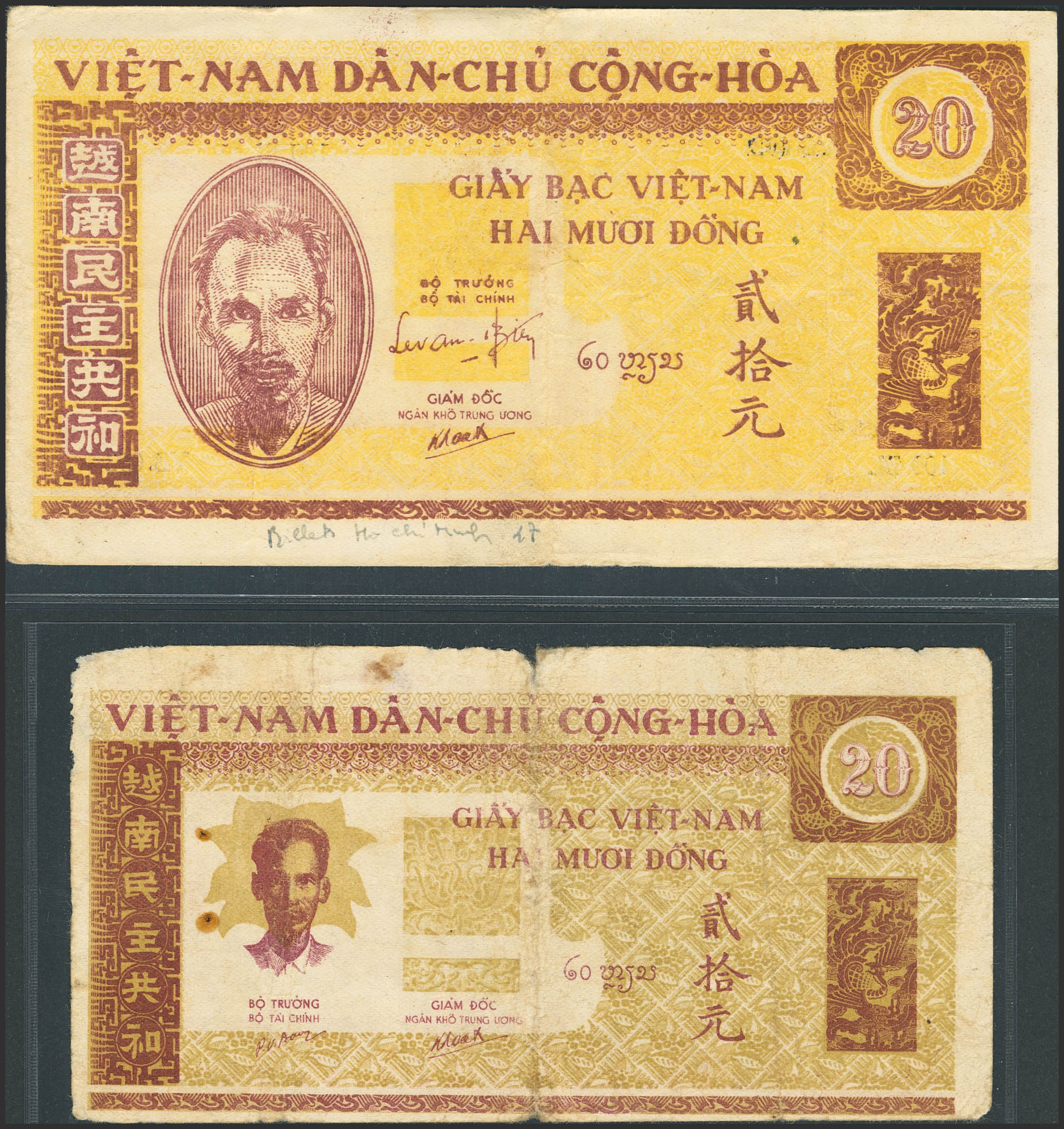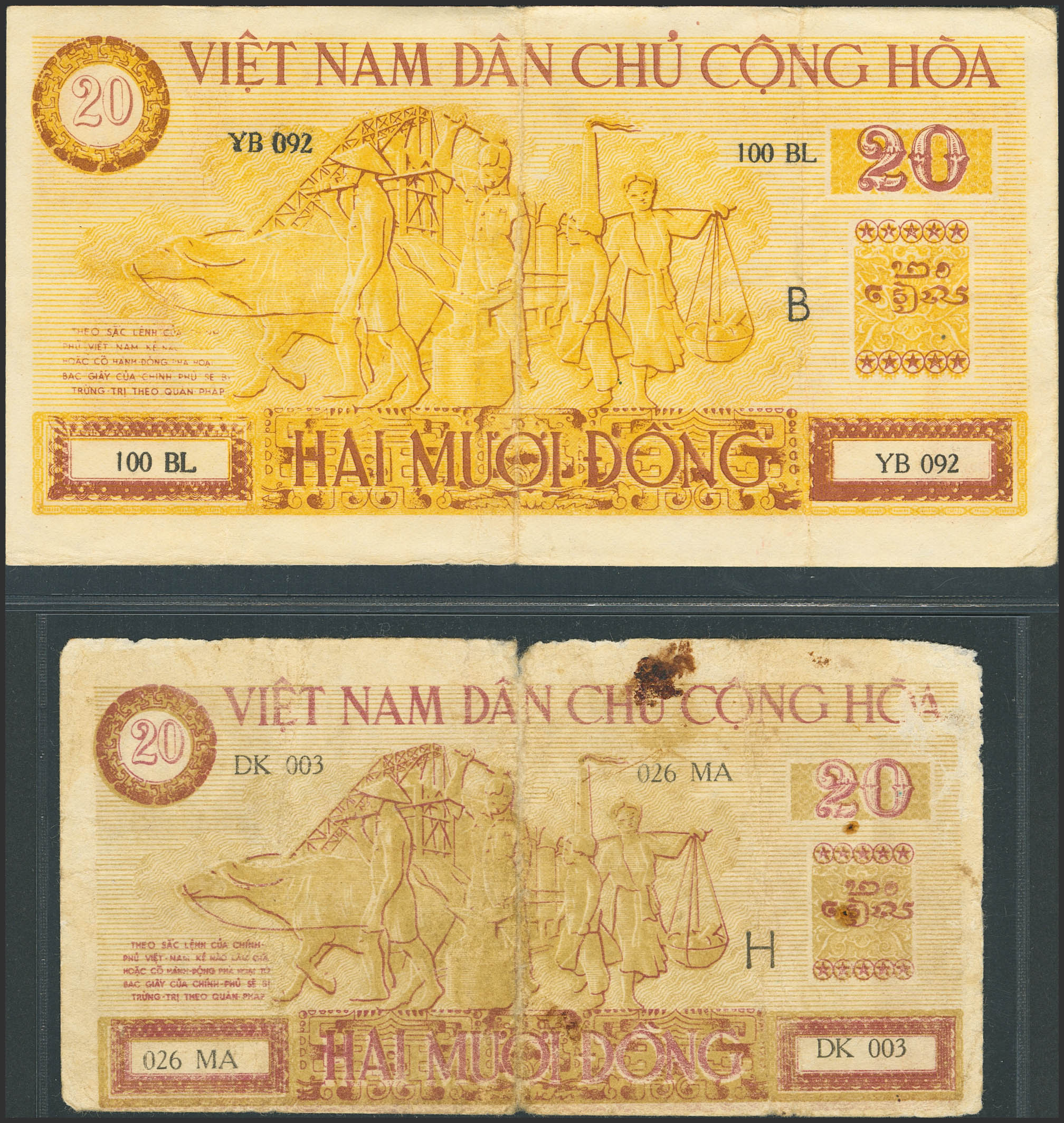 VIETNAM. Lot of 2 notes of 20 Dong. (1946ca). Democratic Republic of Vietnam. (Pick: 5, 7). More than Very Fine, tears, pinholes.