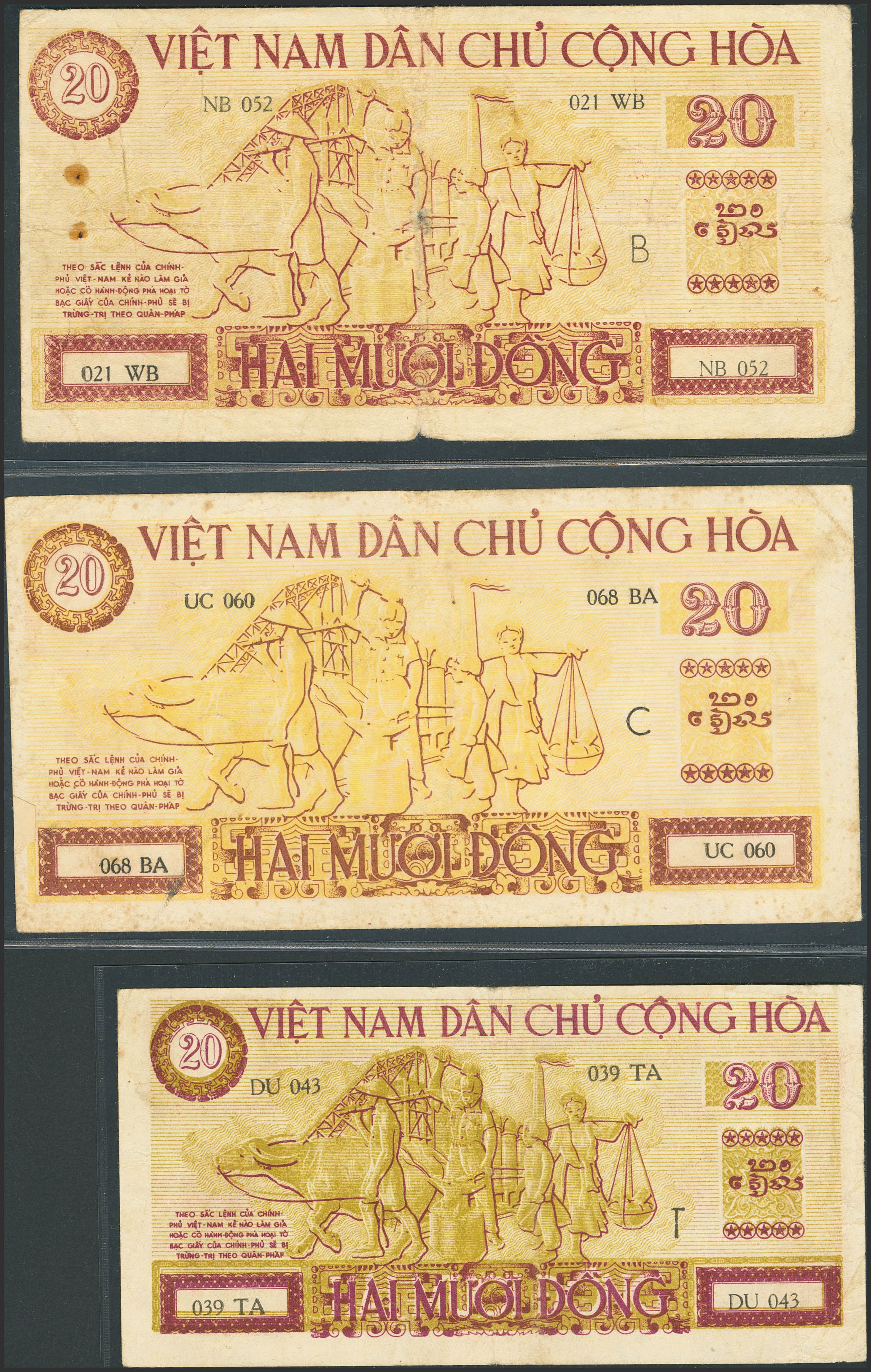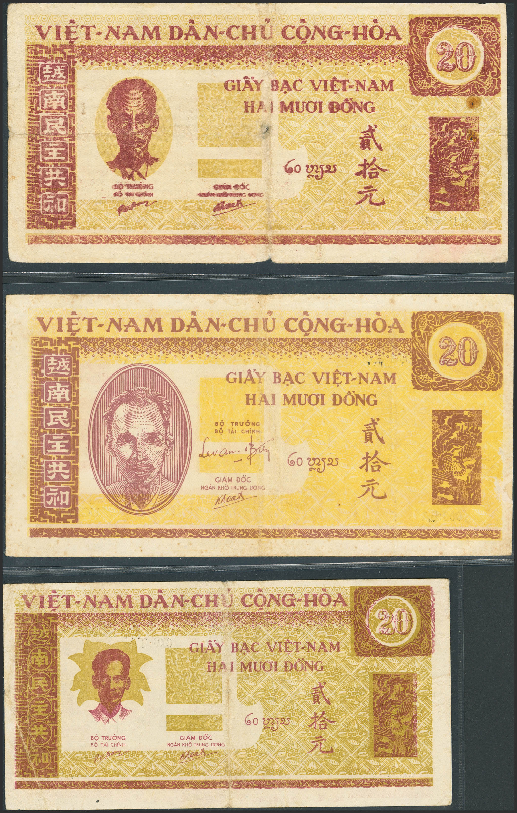 VIETNAM. Lot of 3 notes of 20 Dong. (1946ca). Democratic Republic of Vietnam. (Pick: 5, 6, 7). Fine (2) and More than Very Fine (1), tears, pinholes.