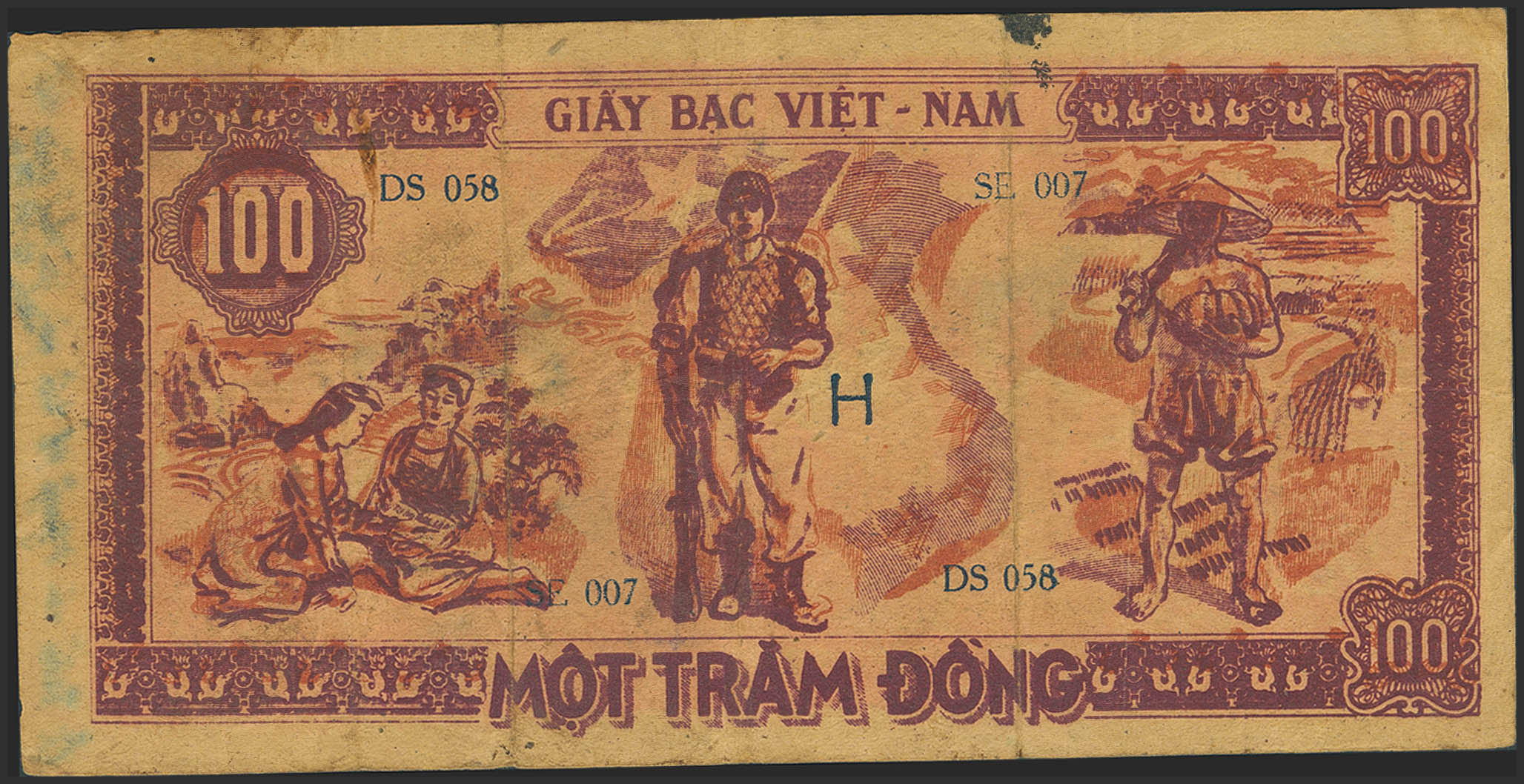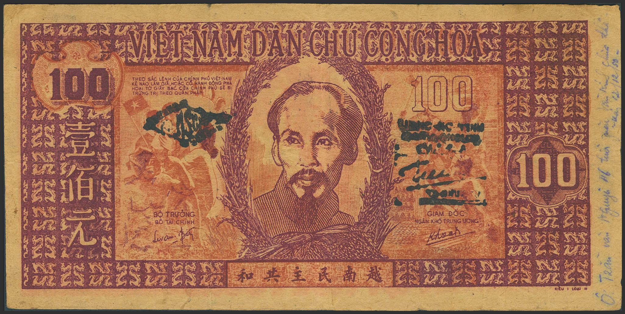 VIETNAM. 100 Dong. (1950ca). Democratic Republic of Vietnam. (Pick: 28a). Very Fine, annotations on the margin, stamped, pinhole, tears.