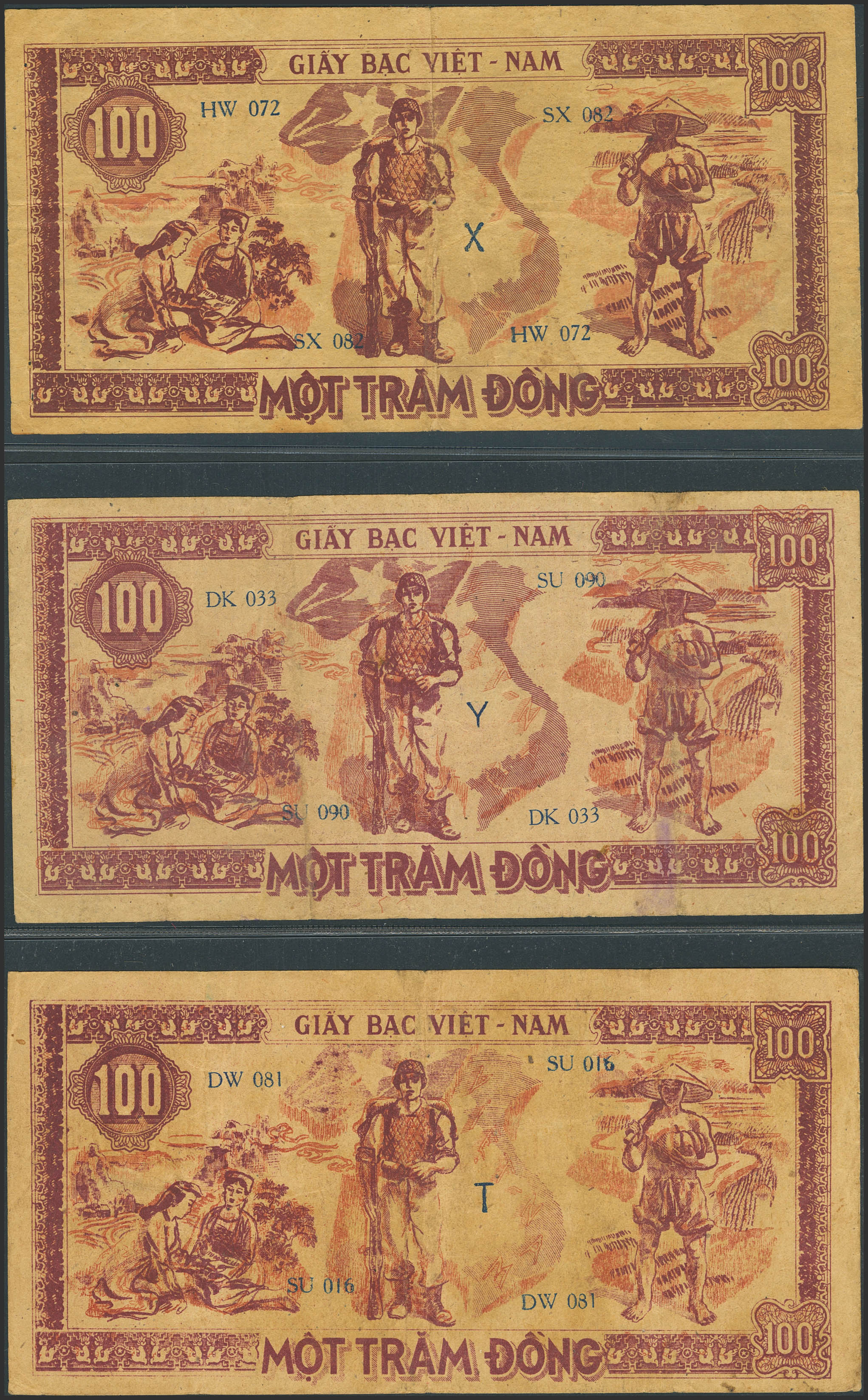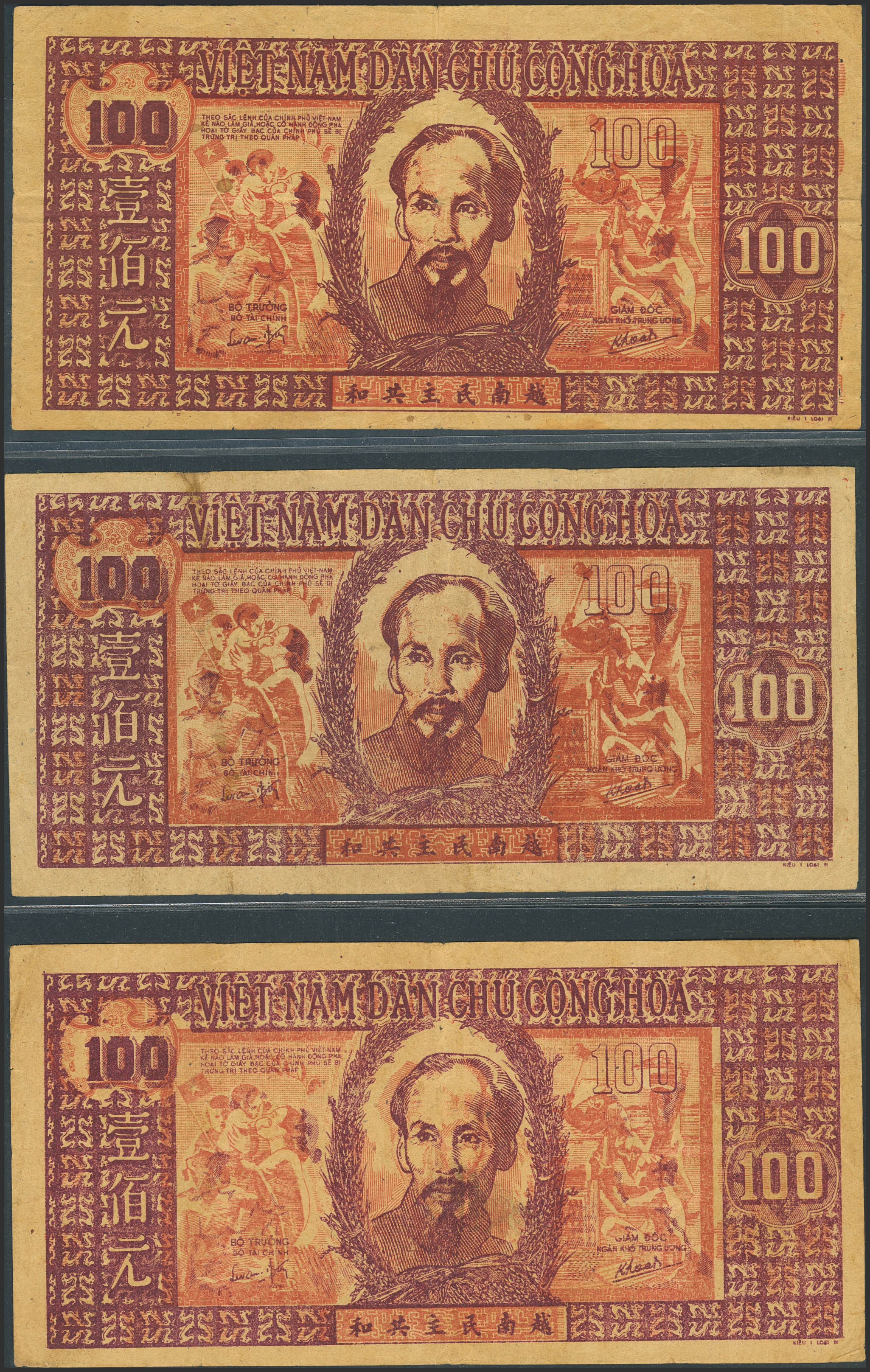 VIETNAM. Lot of 3 notes of 100 Dong. (1950ca). Democratic Republic of Vietnam. Watermark of a circle with a star. (Pick: 28b). Fine / Very Fine, pinholes.