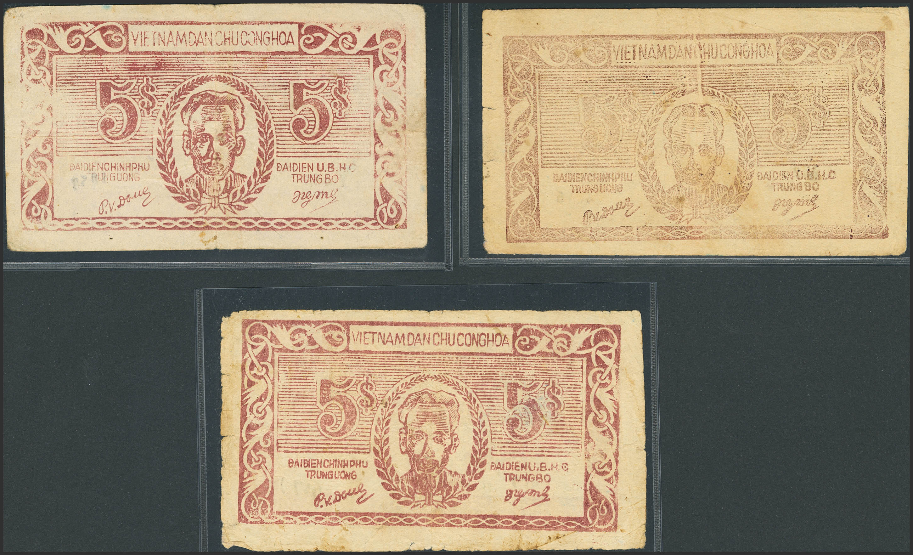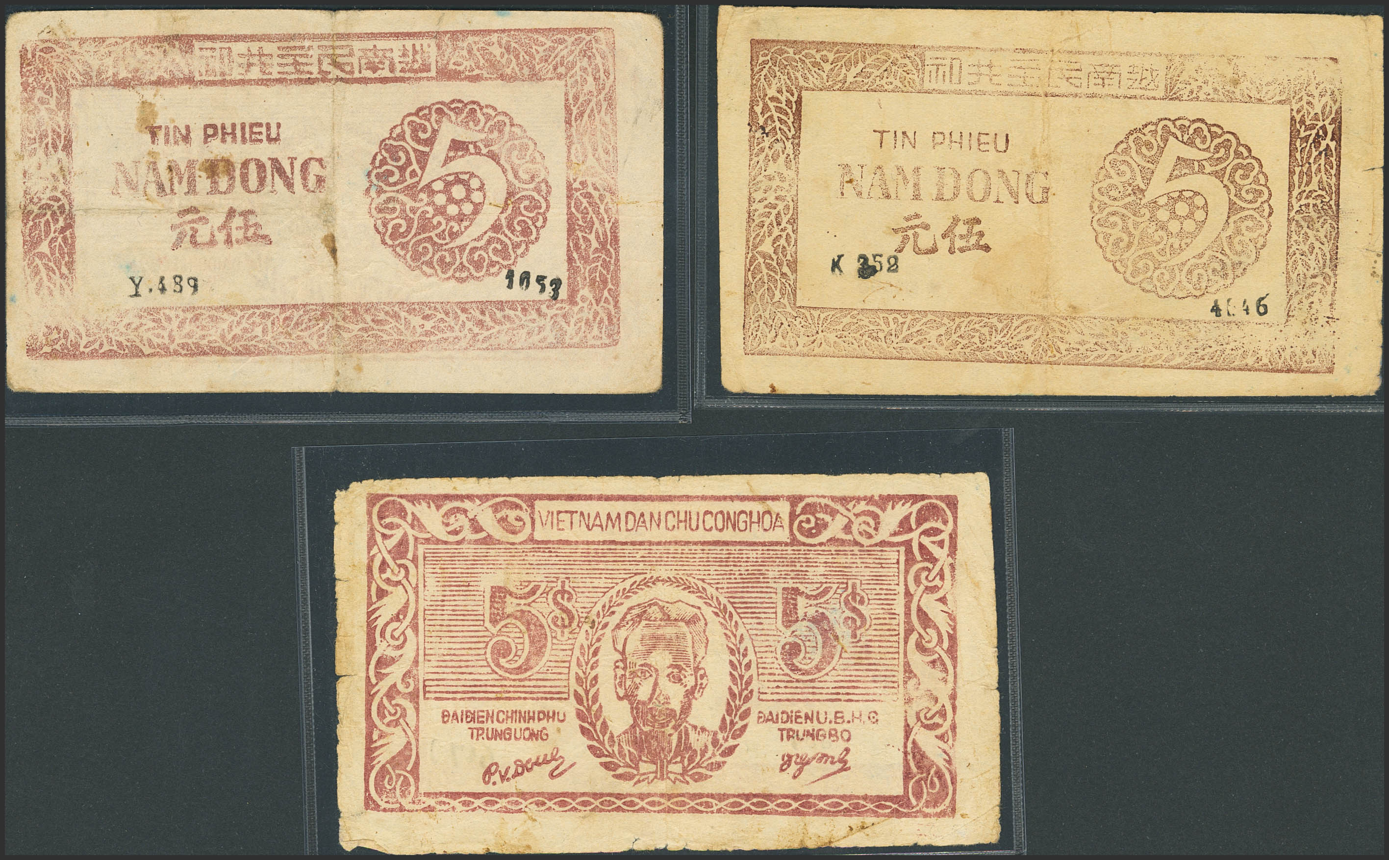 VIETNAM. Lot of 3 notes of 5 Dong. (1949ca). Democratic Republic of Vietnam. Credit Notes. (Pick: 46a). Fine (1), Very Fine (2), dirty, one with tears.