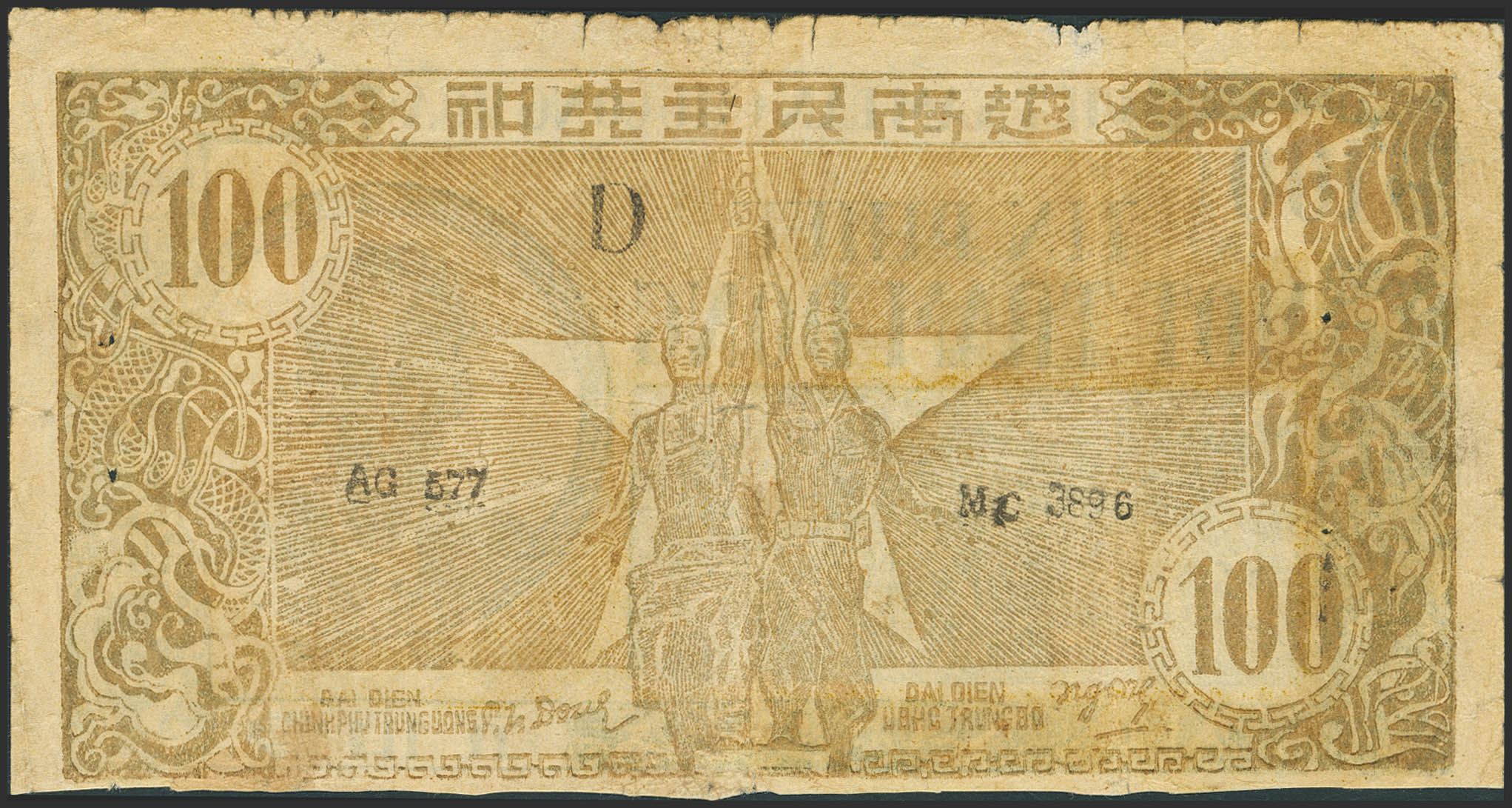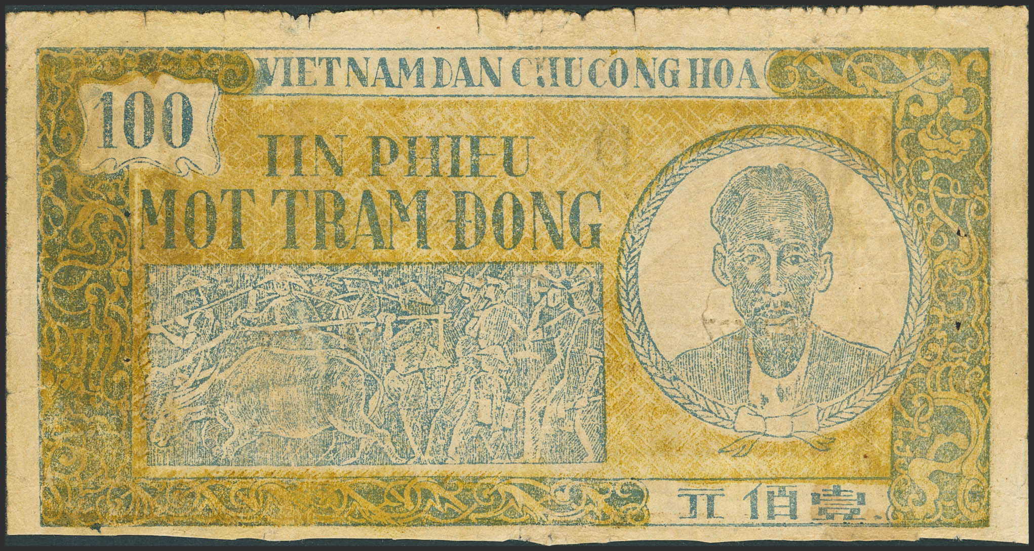 VIETNAM. 100 Dong. (1950ca). Democratic Republic of Vietnam. Thin Paper without watermark. Credit note. (Pick: 54a). Very Good, tears, pinholes.