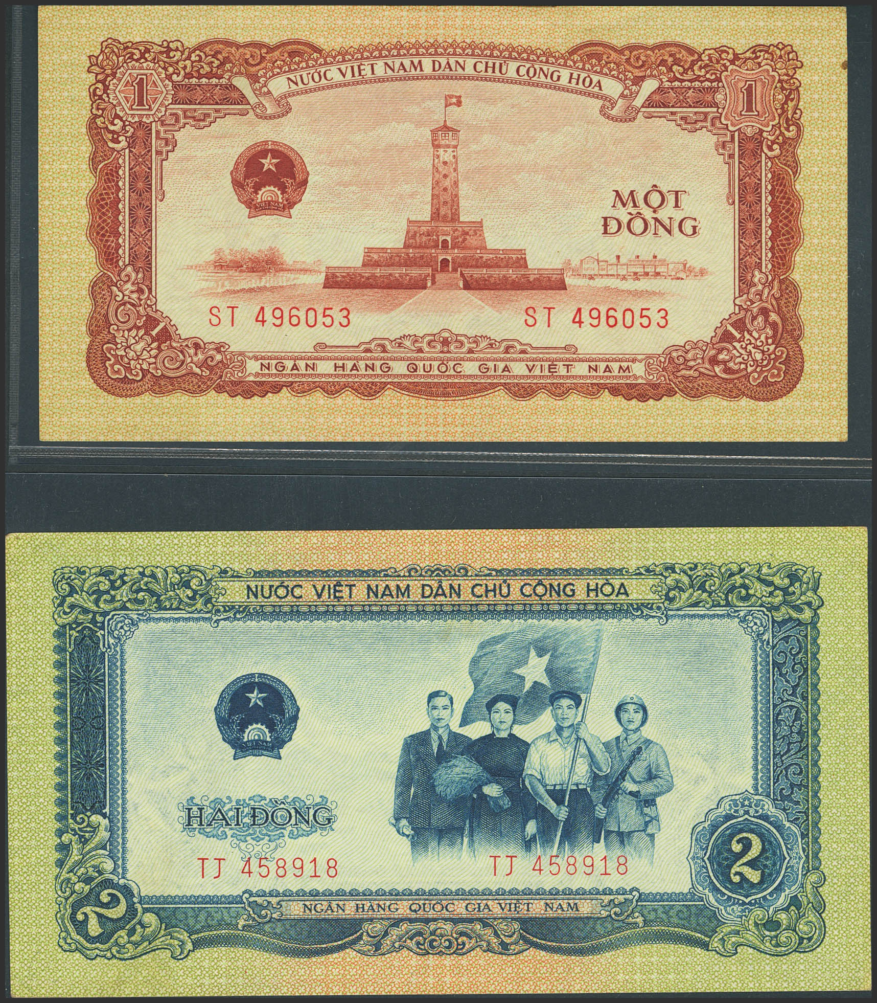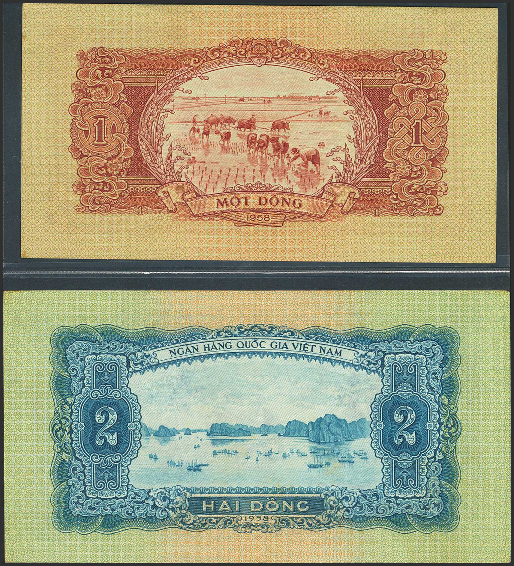 VIETNAM. Lot of 2 notes of 1 and 2 Dong. 1958. National Bank. (Pick: 71a, 72a). More than Extremely Fine and Almost Uncirculated.