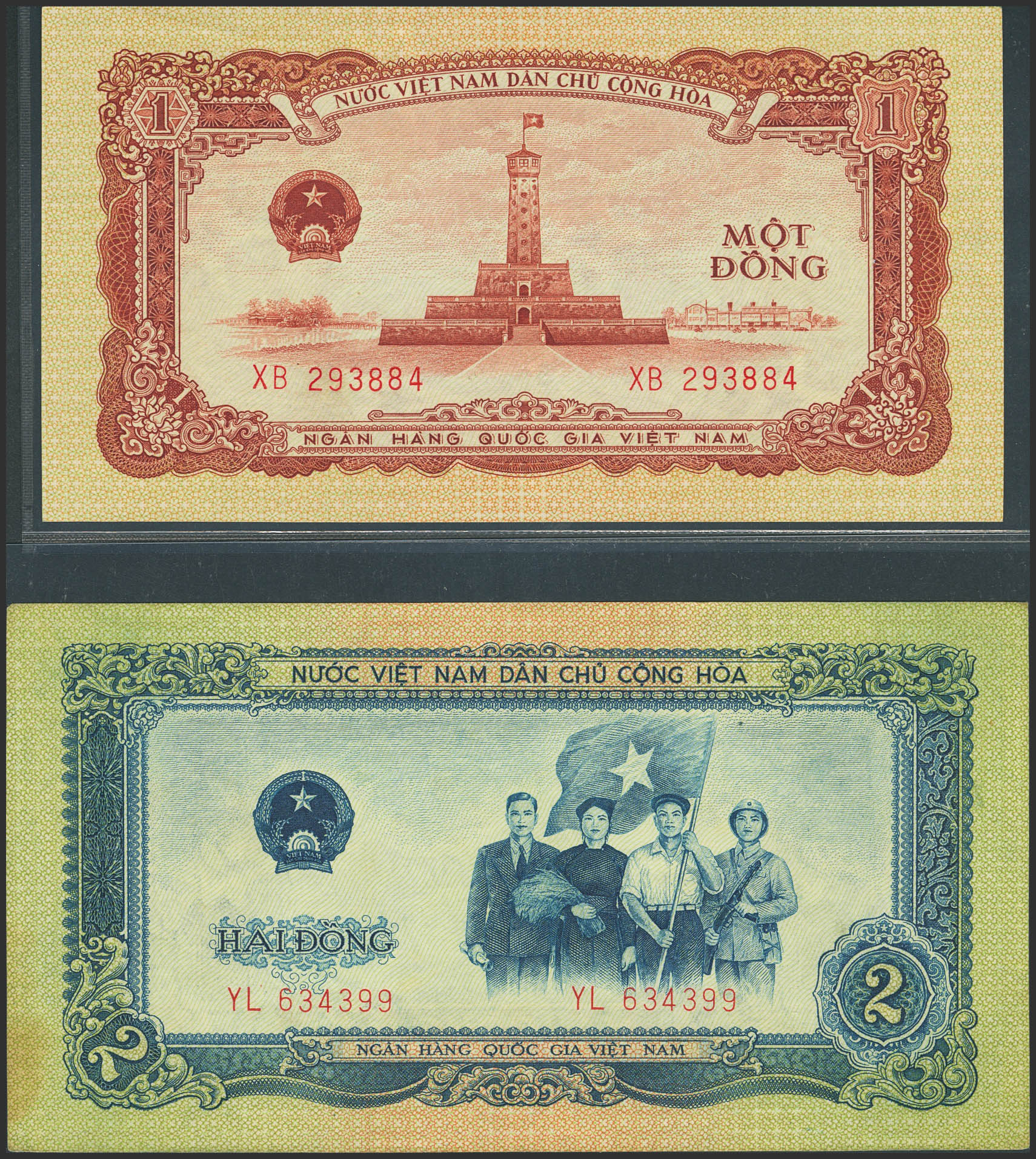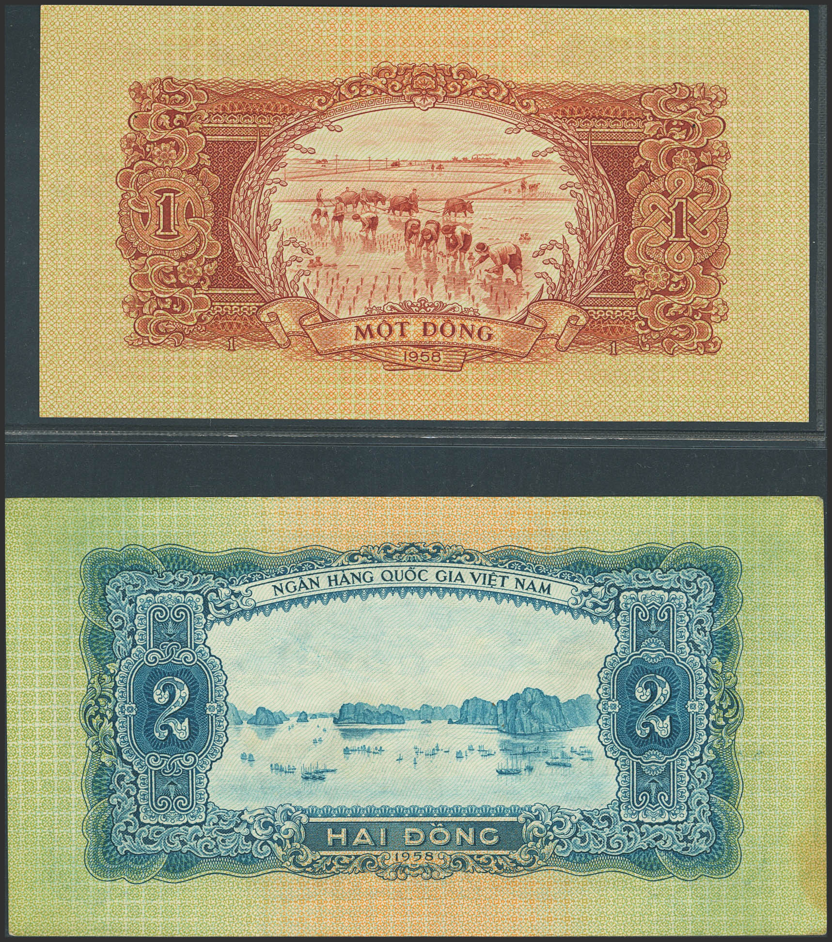 VIETNAM. Lot of 2 notes of 1 and 2 Dong. 1958. National Bank. (Pick: 71a, 72a). More than Extremely Fine and Less than Uncirculated.