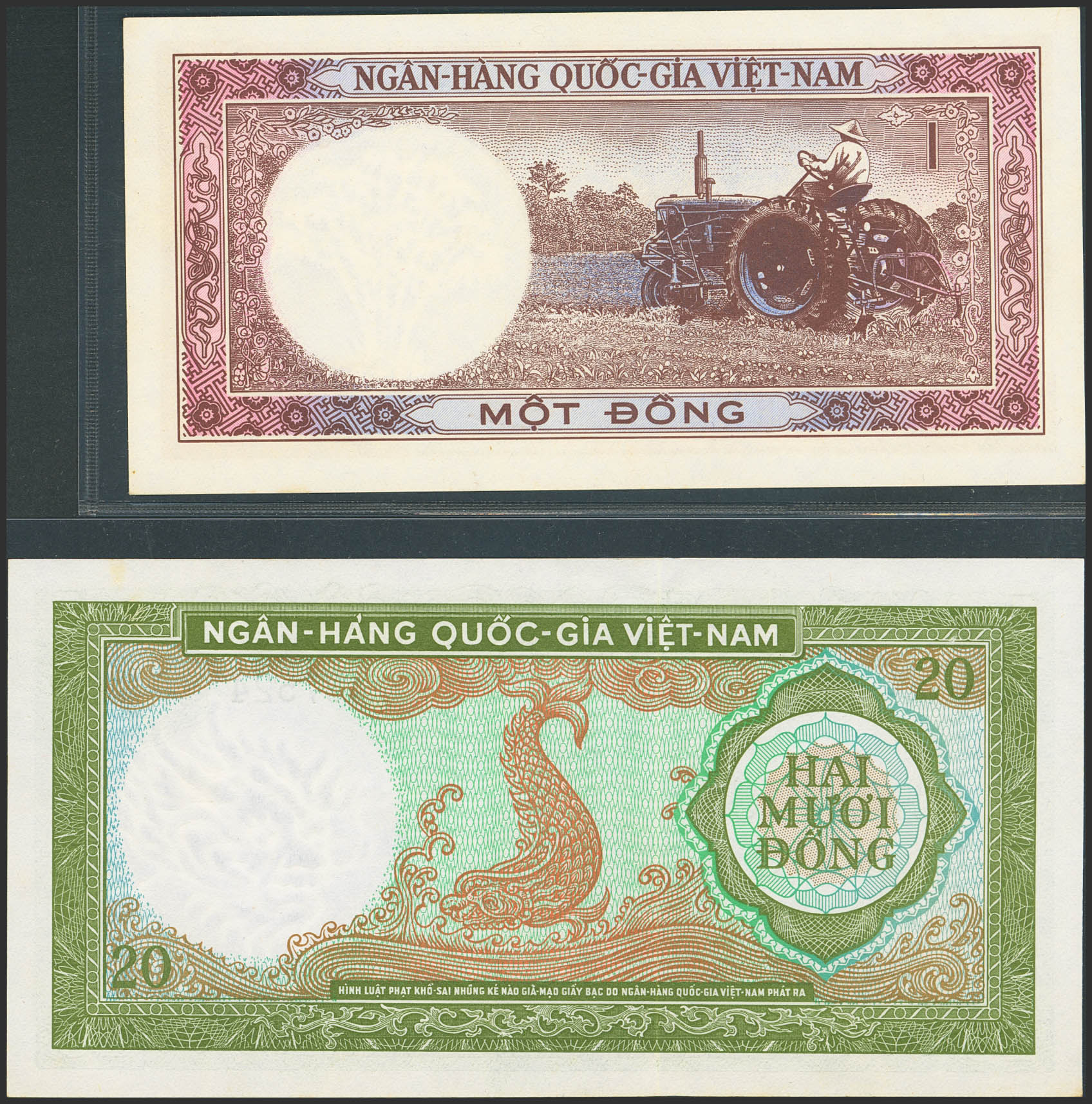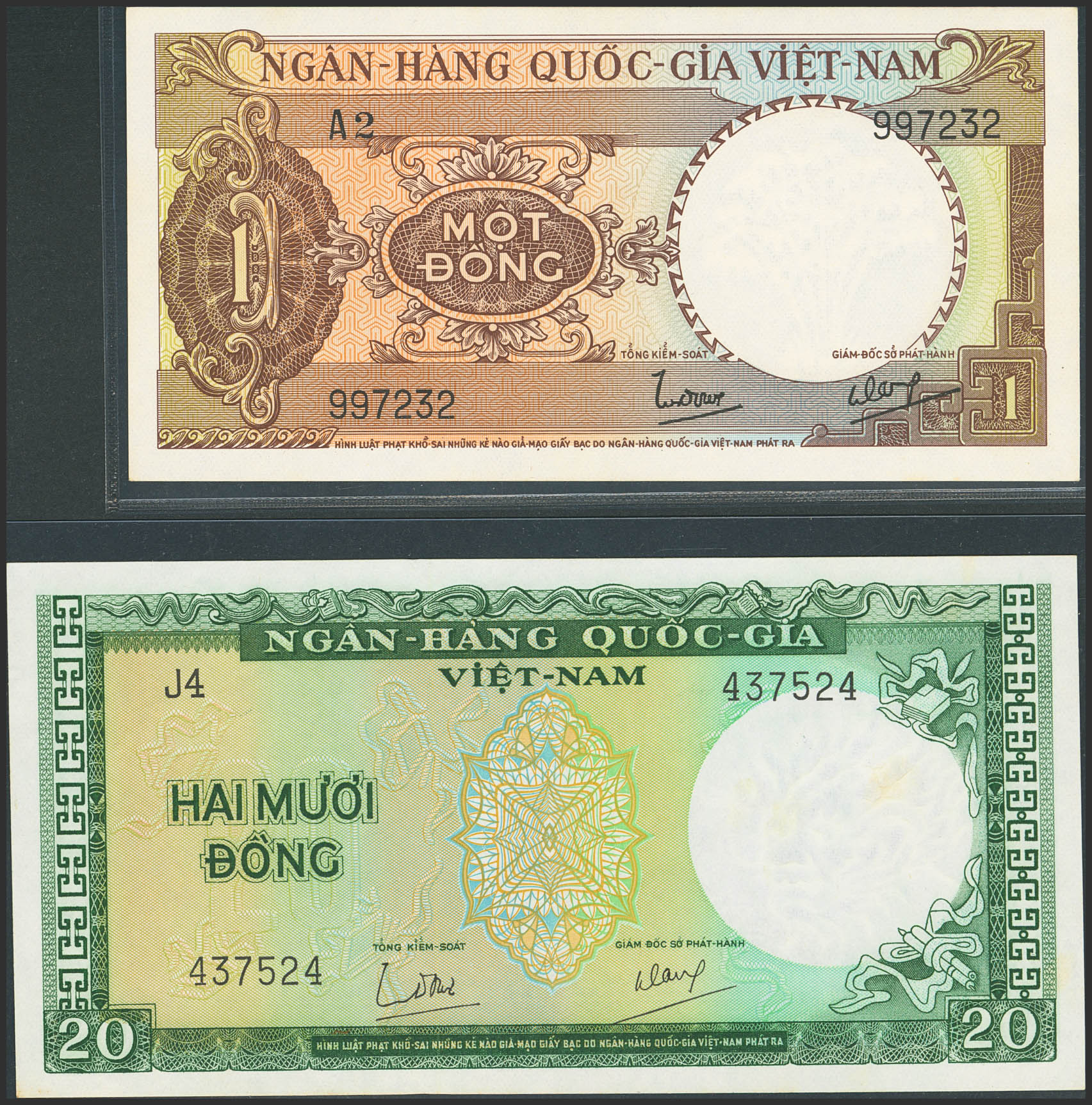 VIETNAM SOUTH. Lot of 2 notes of 1 and 20 Dong. (1964ca). National Bank. (Pick: 15a,16a). Uncirculated (1) and Almost Uncirculated (2).