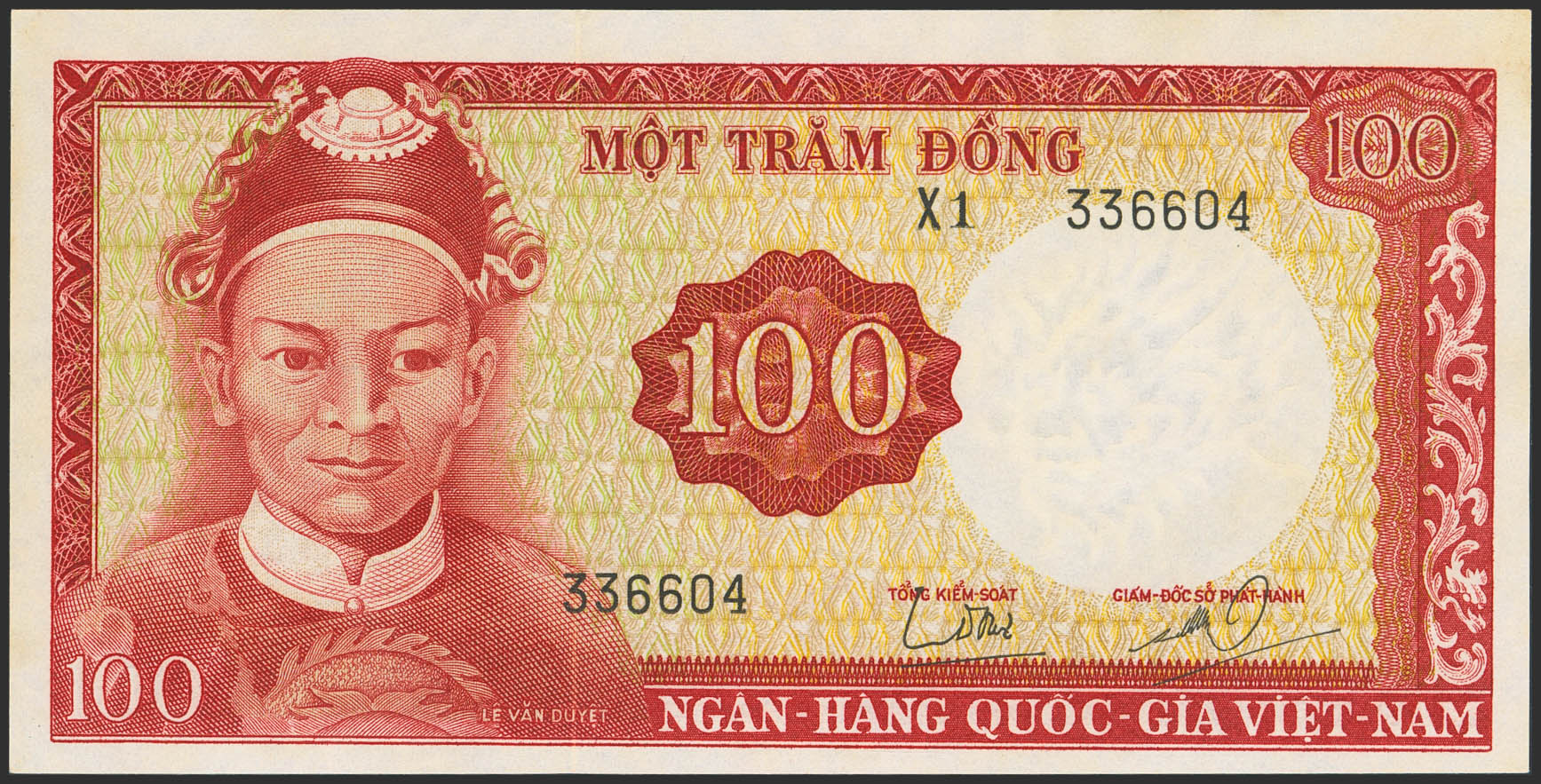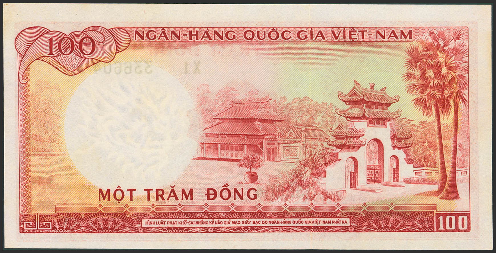 VIETNAM SOUTH. 100 Dong. (1966ca). National Bank. Watermark featuring dragon. (Pick: 19b). Uncirculated, light dirt on the upper front corner.
