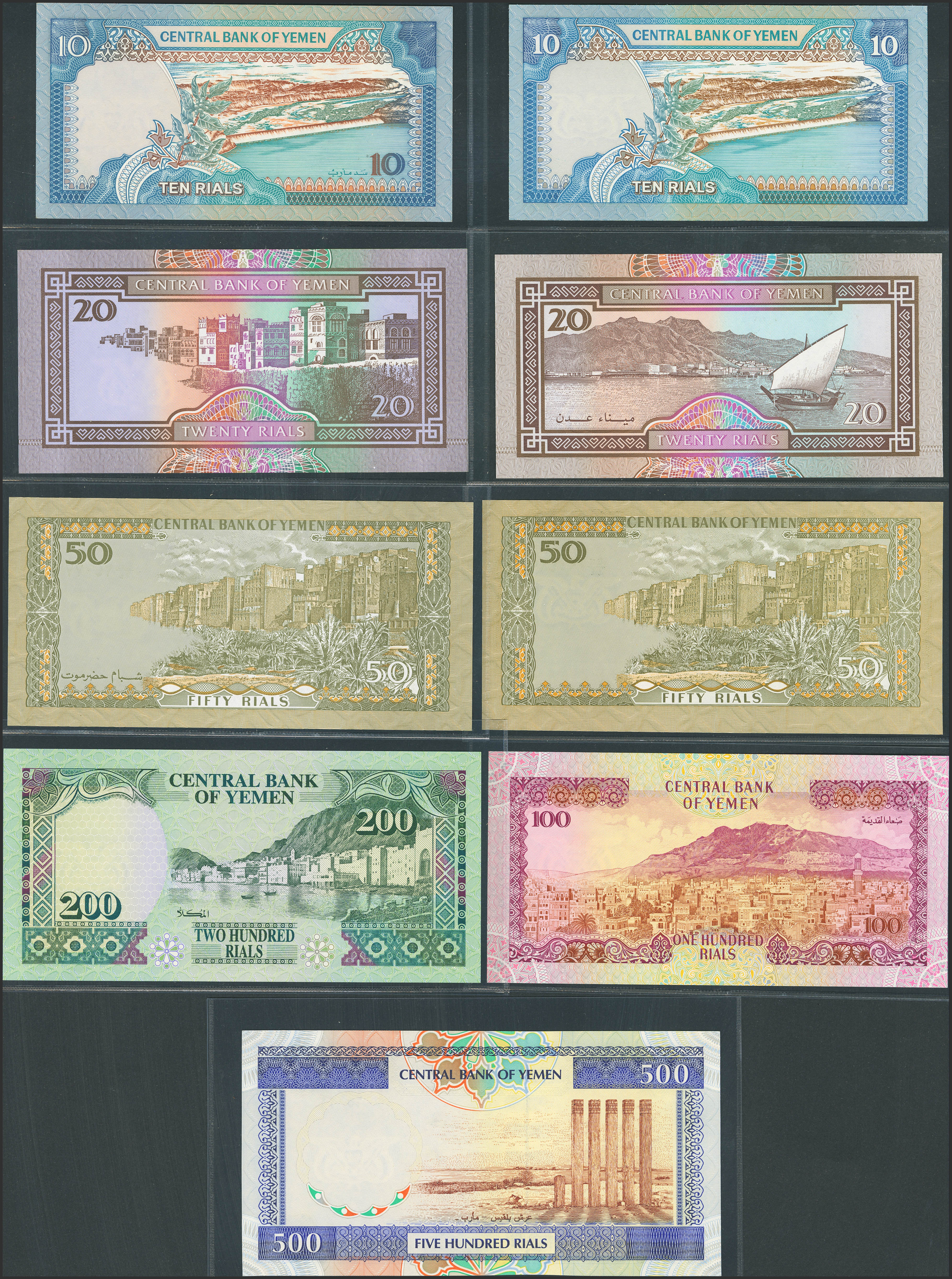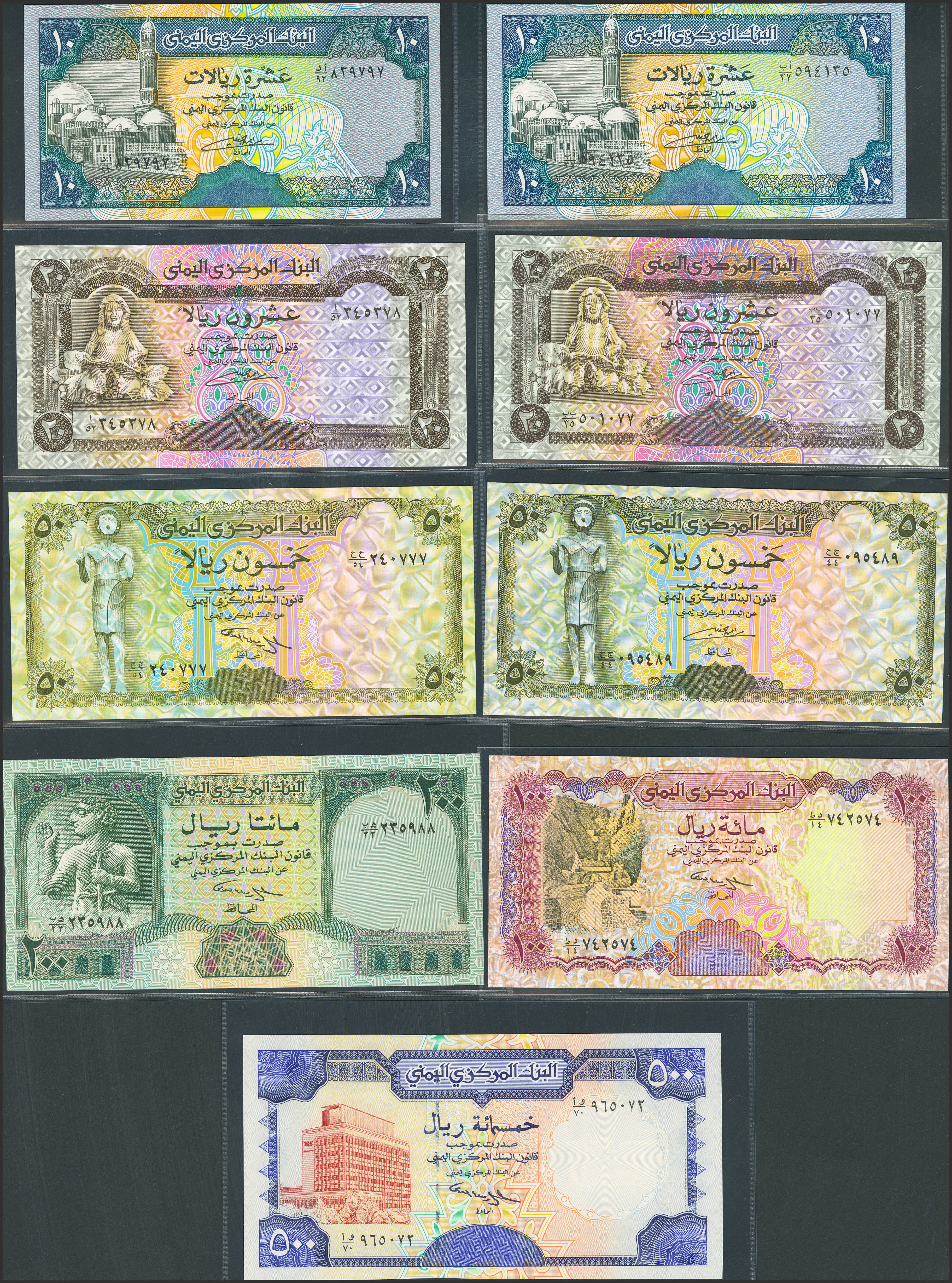 YEMEN ARAB REPUBLIC. Complete set of 9 notes from 10 at 500 Rials. (1990ca). Central Bank. (Pick: 23, 24, 25, 26a, 27, 27A, 28, 29, 30). Uncirculated.