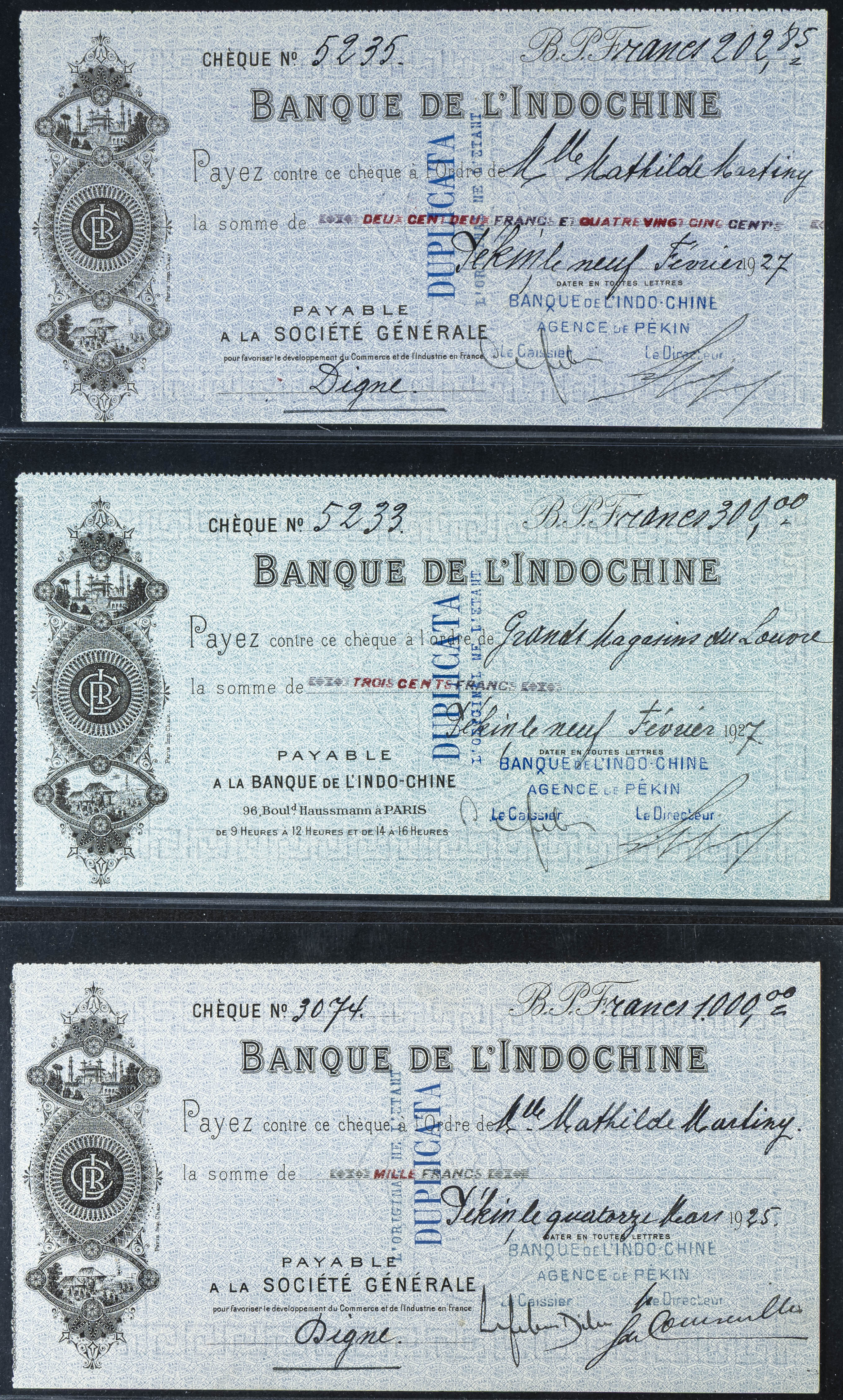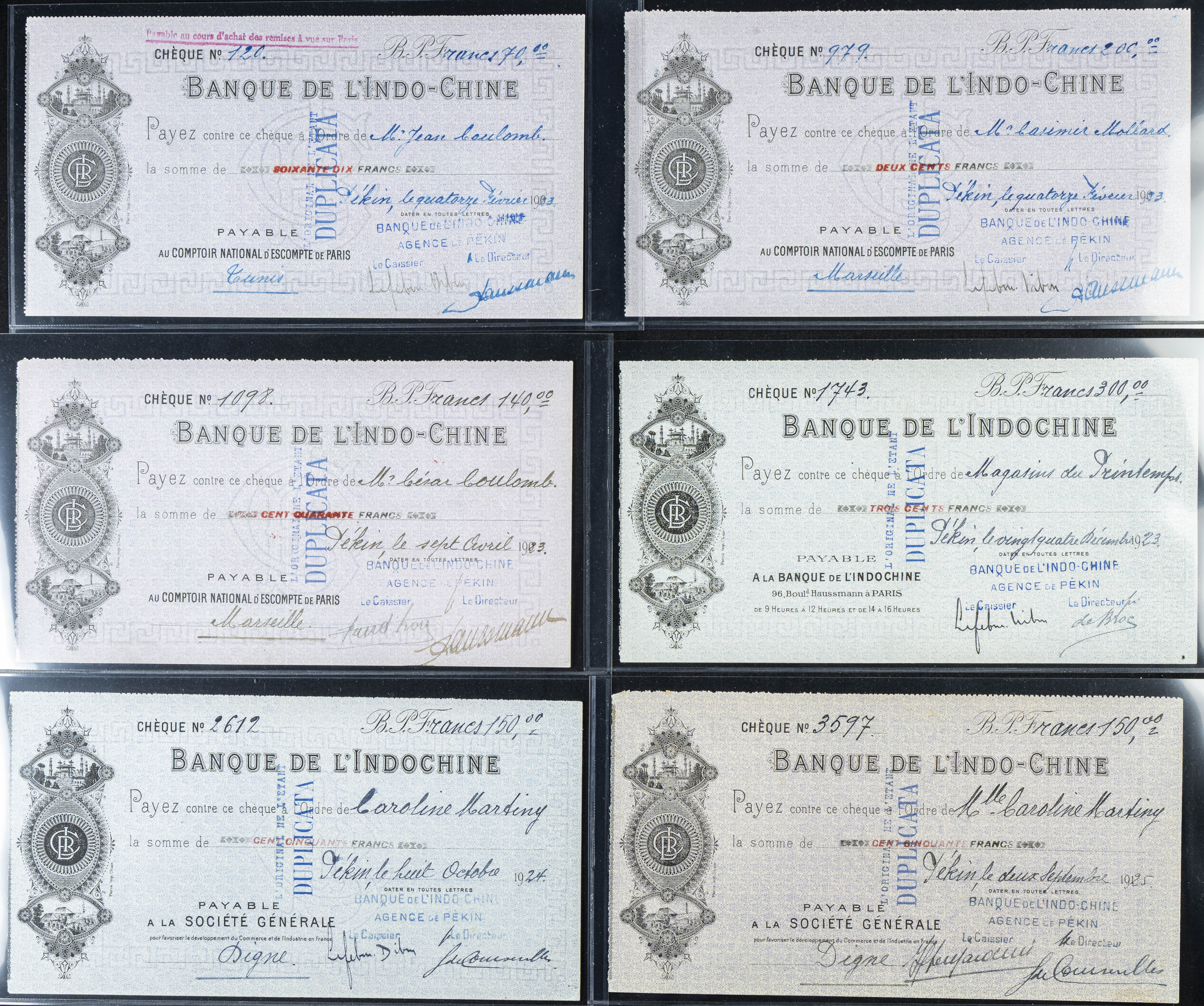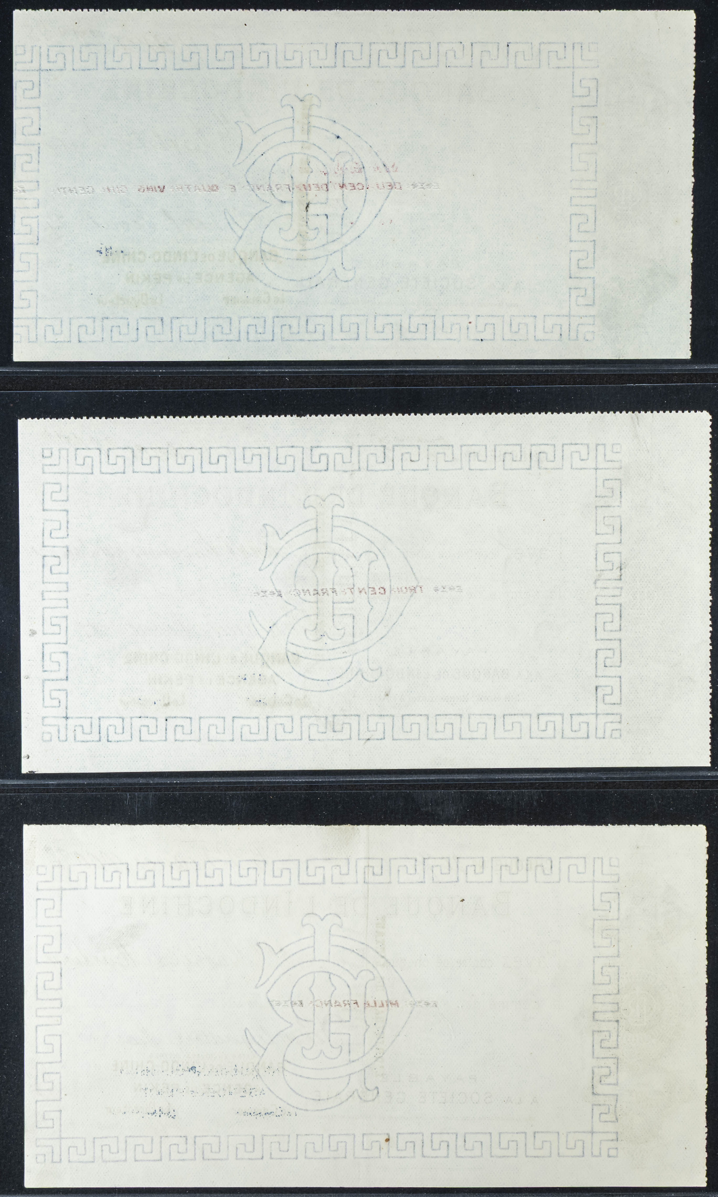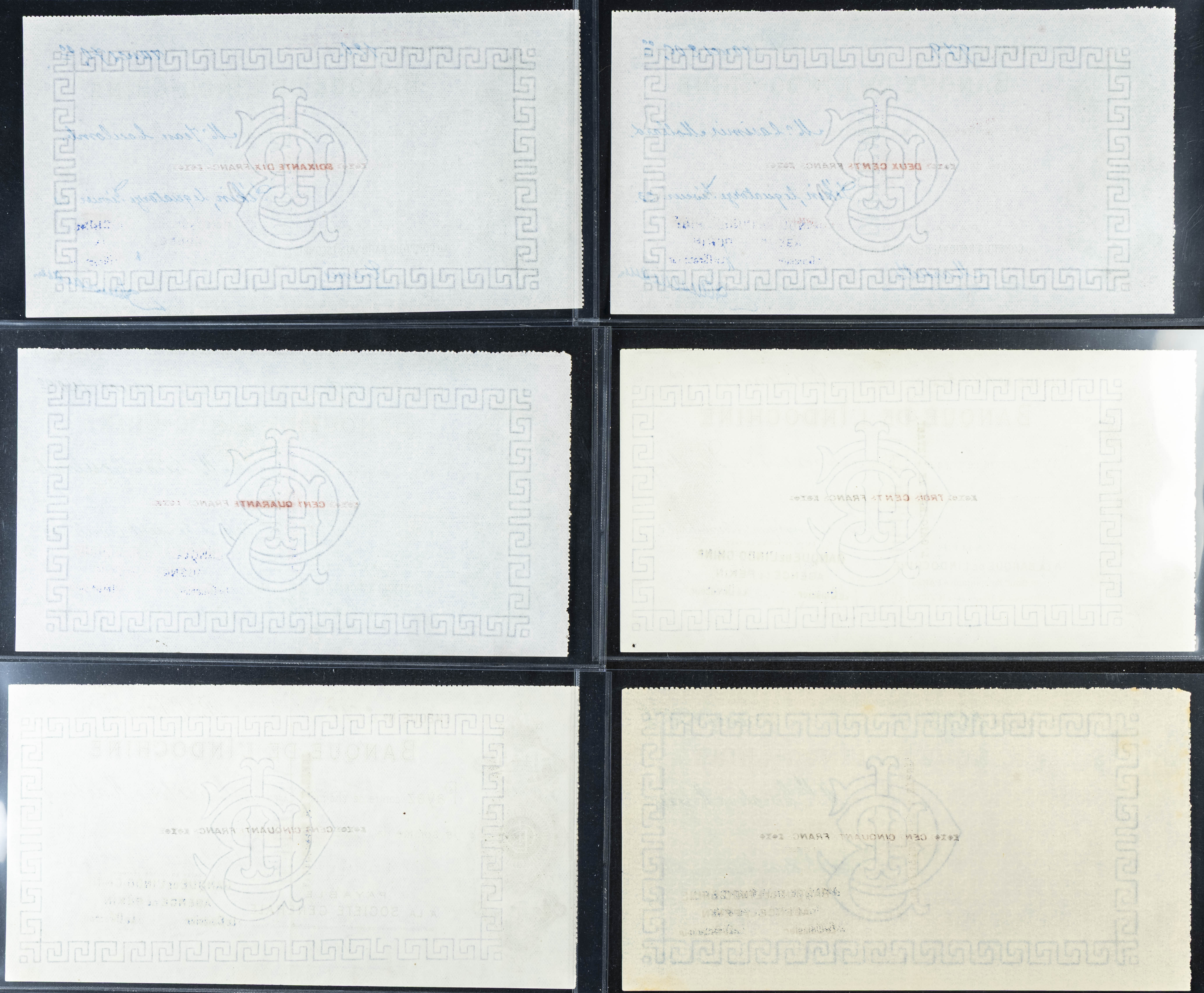 MISCELLANEUS. Lot of 9 bank check notes. (1923ca). Banque de L’Indo-Chine. Agence de Pekin. (Pick: Unlisted). More than Extremely Fine / Almost Uncirculated.