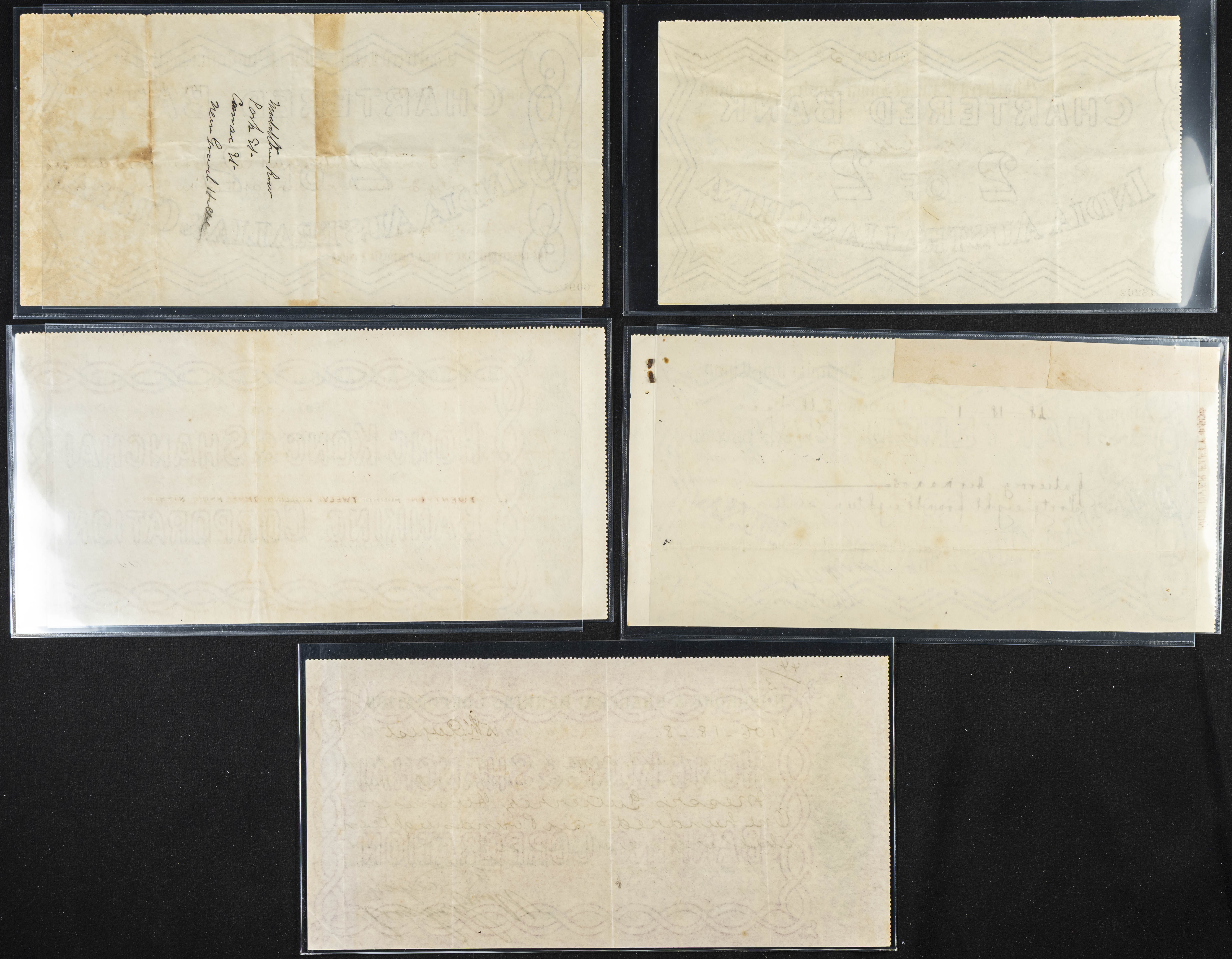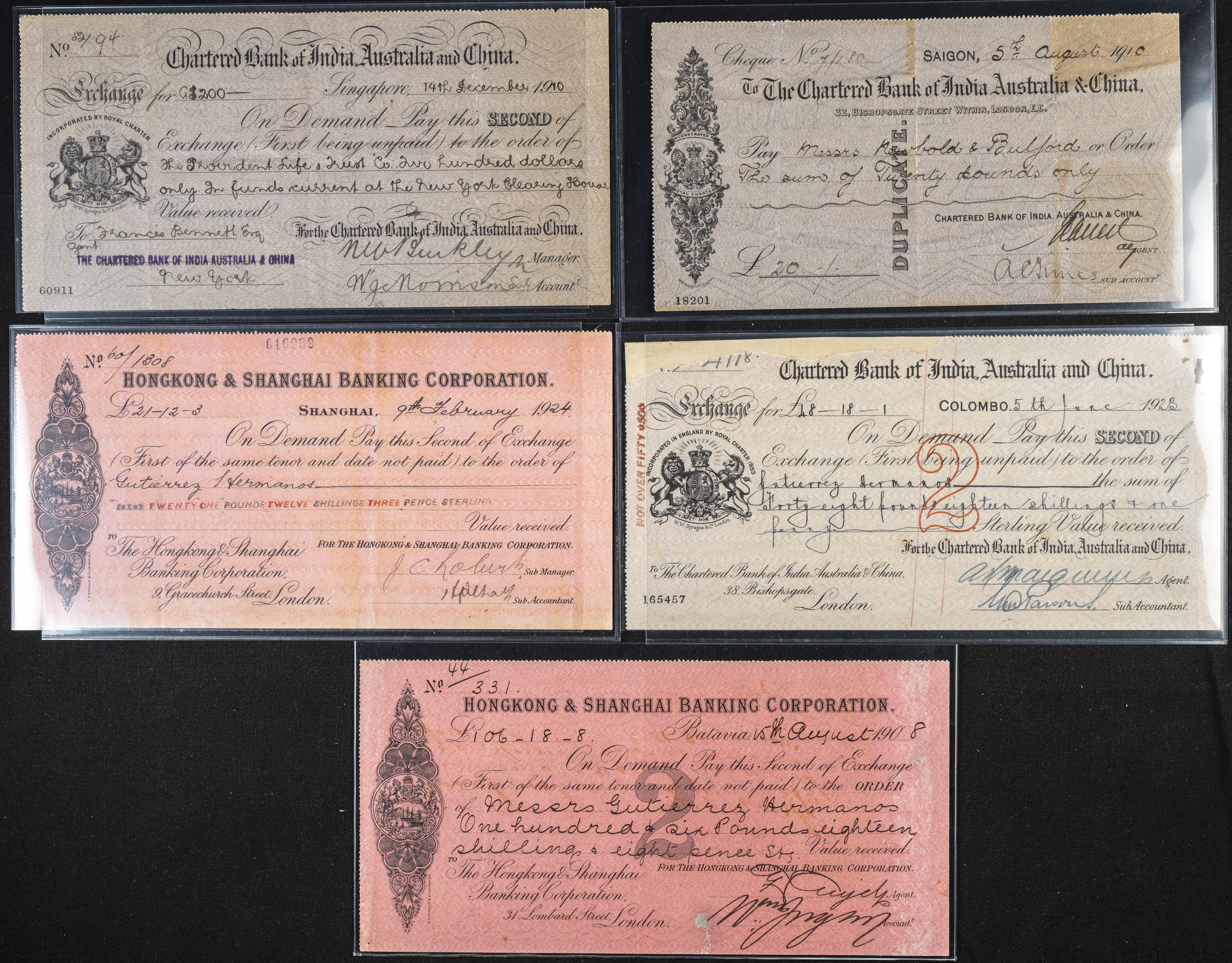 MISCELLANEUS. Lot of 5 bank check notes. (1908ca). Chartered Bank of India, Australia and China (3) and Hong Kong and Shanghai Banking Corporation (2). (Pick: Unlisted). One of them has the top margin missing with adhesive paper added. More than Very Fine / Extremely Fine.