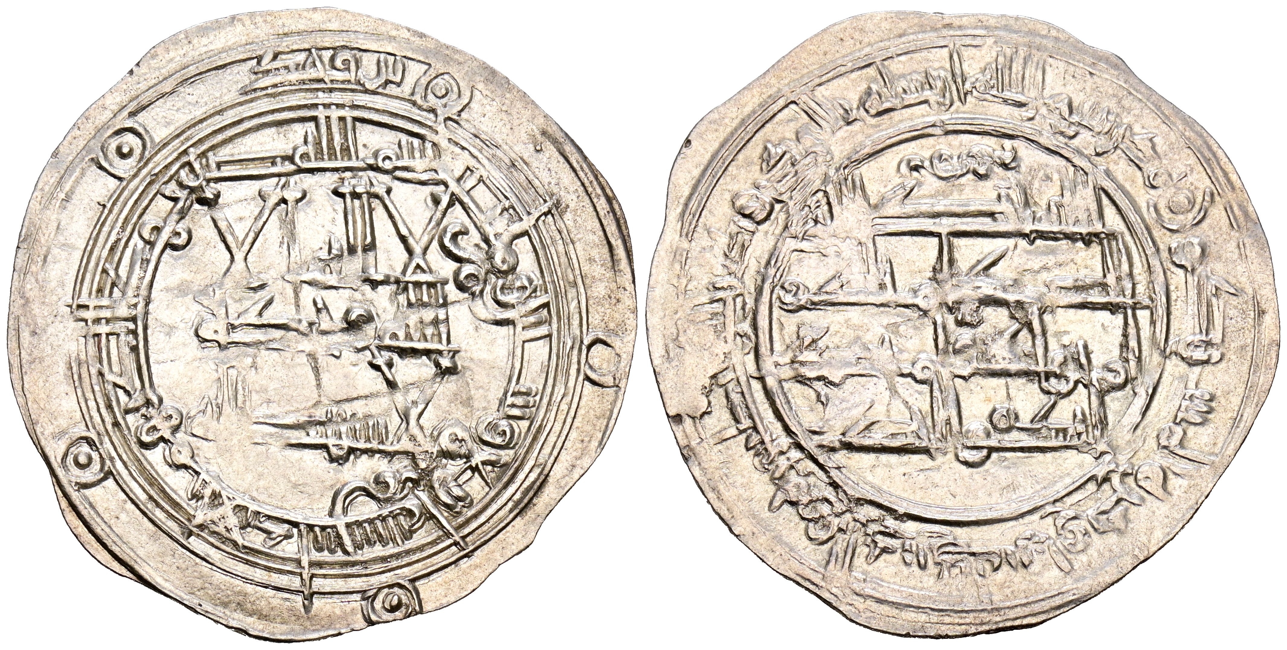 EMIRATO INDEPENDIENTE DE CÓRDOBA. Muhammad I. Dirham. (Ar. 2,68g/31mm). 264H. al-Ándalus / الاندلس. (Vives 295; Frochoso 264.10). Citando a Ibn Fahad / بن فهد entre gráfilas en anverso. SC.