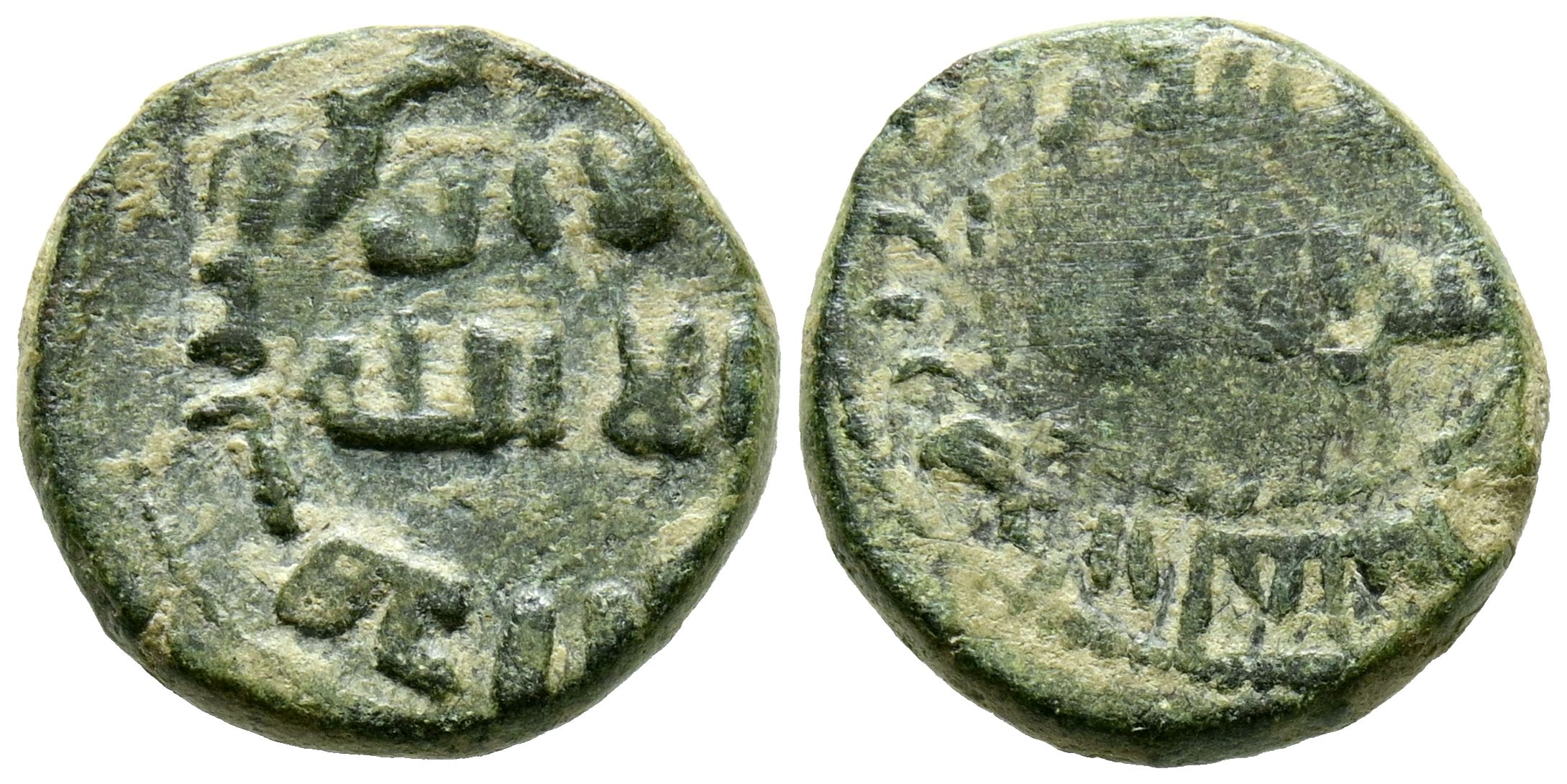 EMIRATO DEPENDIENTE DE CÓRDOBA, PERIODO DE GOBERNADORES. Anónimo. Felús. (Ar. 3,13g/15mm). al-Ándalus / الاندلس. (Vives 41; Frochoso XVIII-e). Dos líneas de leyenda religiosa en el centro de ambas áreas. Anv: .. ضربهداا لفلس. Rev: ... ضربهداا لفلس.. MBC/MBC-. Escasa.