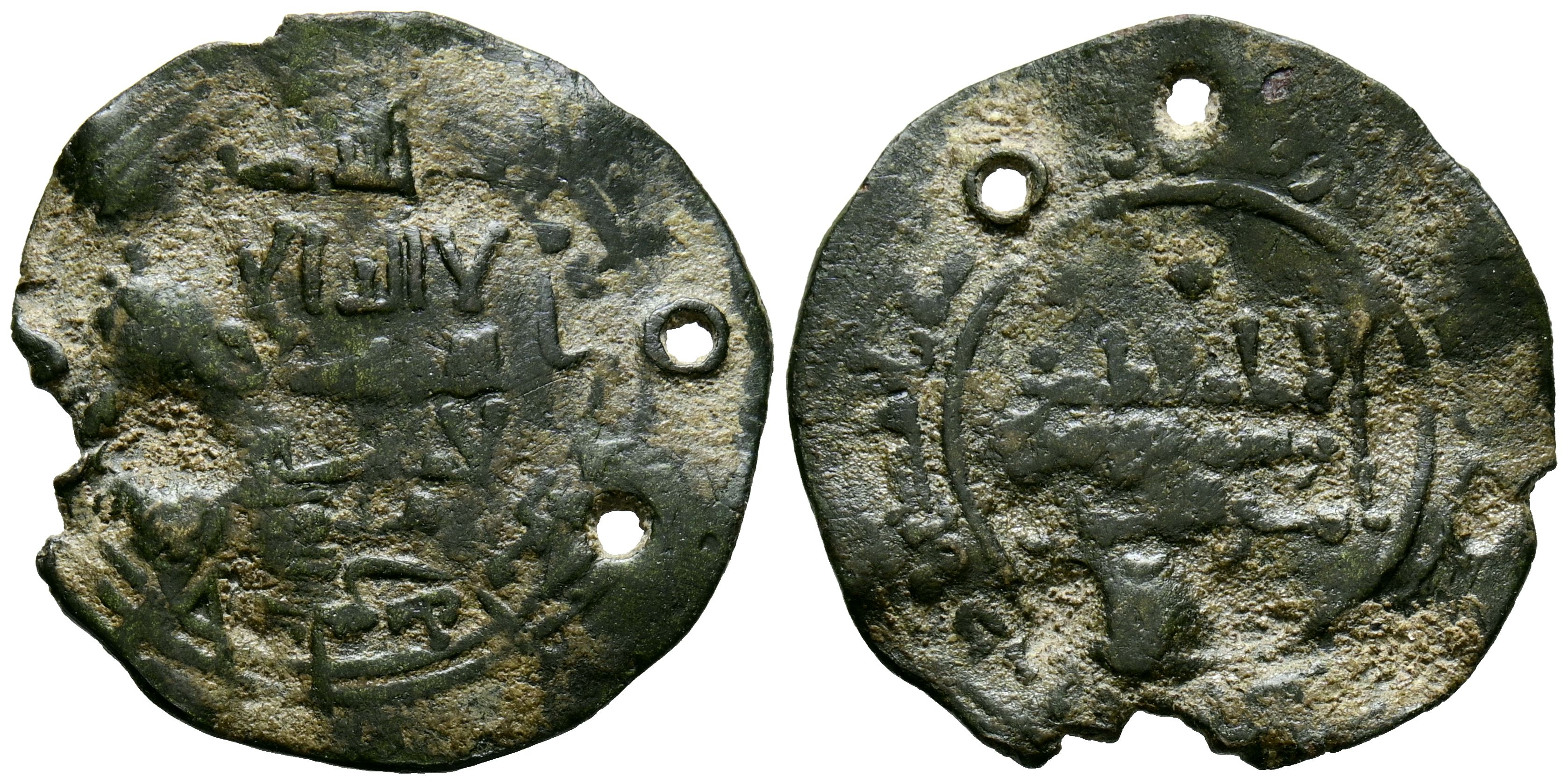 CALIFATO DE CÓRDOBA. 'Abd al-Rahman III. Dirham falso de época. (Ae. 2,84g/24mm). 332H. al-Ándalus / الاندلس. (Tipos Vives 398 en anverso y 421 en reverso). Citando a Qāsim / قاسم en IA. MBC. Dos perforaciones. Interesante y raro ejemplar inspirado en dos piezas de distinto año y diferentes cecas.