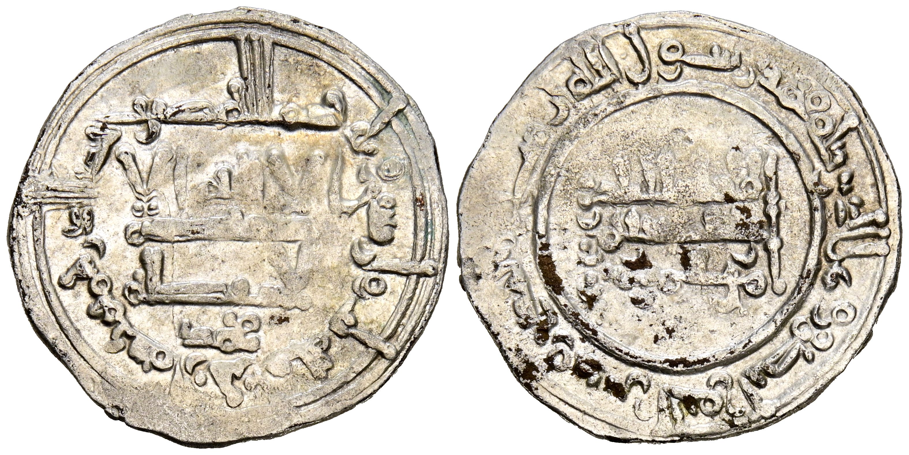 CALIFATO DE CÓRDOBA. 'Abd al-Rahman III. Dirham forrado. (Ar. y Ae. 2,24g/22mm). 343H. Madinat al-Zahra / مدينة الزهرا. (Vives 425; Frochoso 343.7). Citando a Muhammad / محمد en IA. MBC+. Interesantísimo ejemplar con una ejecución impecable.