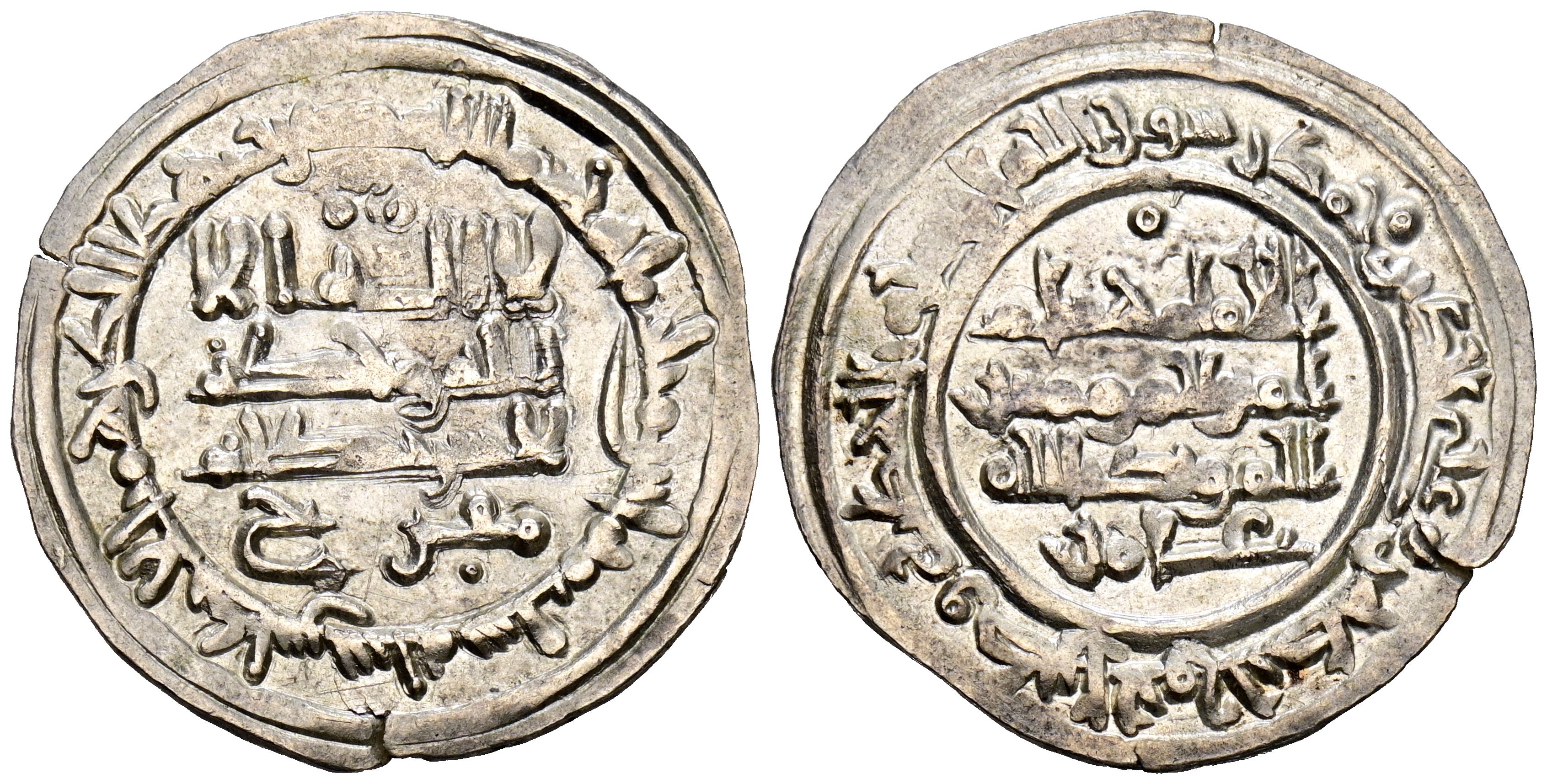 CALIFATO DE CÓRDOBA, Hisham II. Dirham. (Ar. 2,76g/24mm). 386H. al-Ándalus / الاندلس. (Vives 531; Frochoso 386.77). Citando a Mufariŷ / مفرح en IA. y 'Āmir / عامر en IIA. MBC+. Interesante ejemplar.