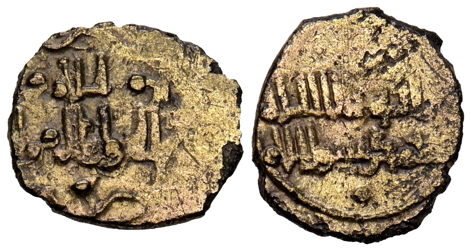 TAIFAS DEL CALIFATO, Anónimo atribuído a Toledo. Fracción de Dinar. (El. 0,54g/11mm). S/D. (Codera y Zaidin (1897) 1047 bis; Ibrahim, Cantó (2003) Suplemento a los Reinos de Taifas, nº 169, Francés nº362). Anv: لااله الاالله / محمدرسول الله. Rev: الح و ل و القوة / الله. (Para Dios / el poder y la fuerza). MBC-. Escasa.Codera atribuyó esta pieza a Almería ''por tener alguna semejanza con algunos ejemplares del nº 1047 de Vives, aunque en el tesorillo donde aparecieron aquellos ejemplares, también c ontenía otros diferentes de las taifas de Toledo, Badajoz, Córdoba, Valéncia, Dénia y Zaragoza. Sin embargo, precediendo la intuición del doctor Albert Cantó, sería David Francés quien daría un razonamiento más lógico a su origen, en su libro ''De la legitimidad, las sucesiones y su reflejo en las acuñaciones andalusíes'' pág. 137-139, justificando la atribución de esta pieza a Toledo, durante la presencia de 'Umar al-Mutawakkil rey de Badajoz'.
